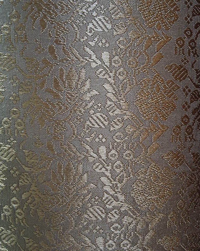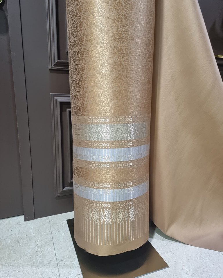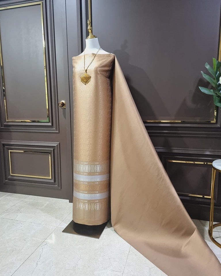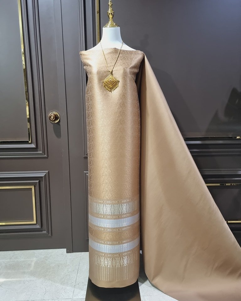 #ผ้าไหมยกดอกลำพูนสีกาแฟเกาะชิงดิ้นทองผสมดิ้นเงิน