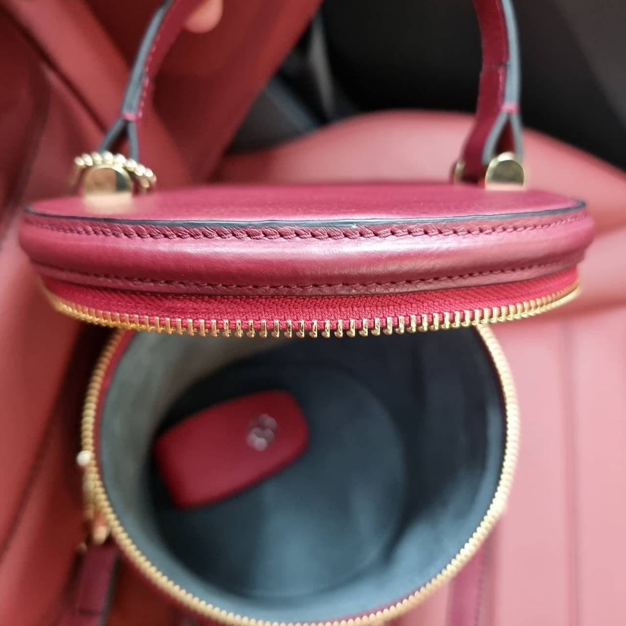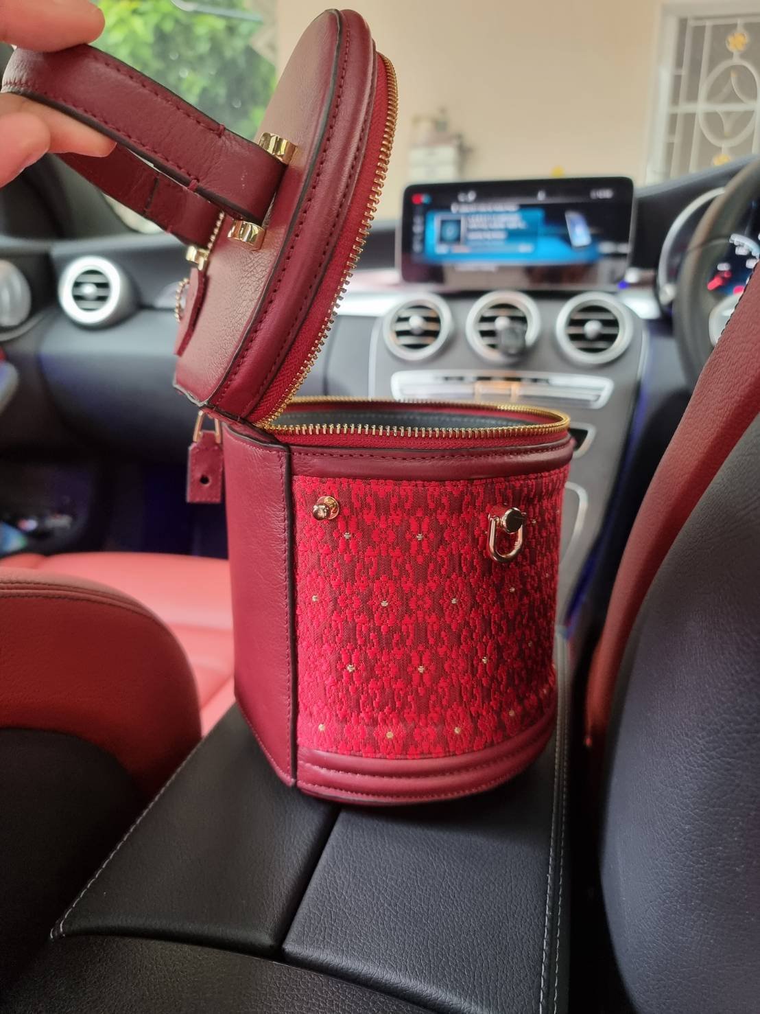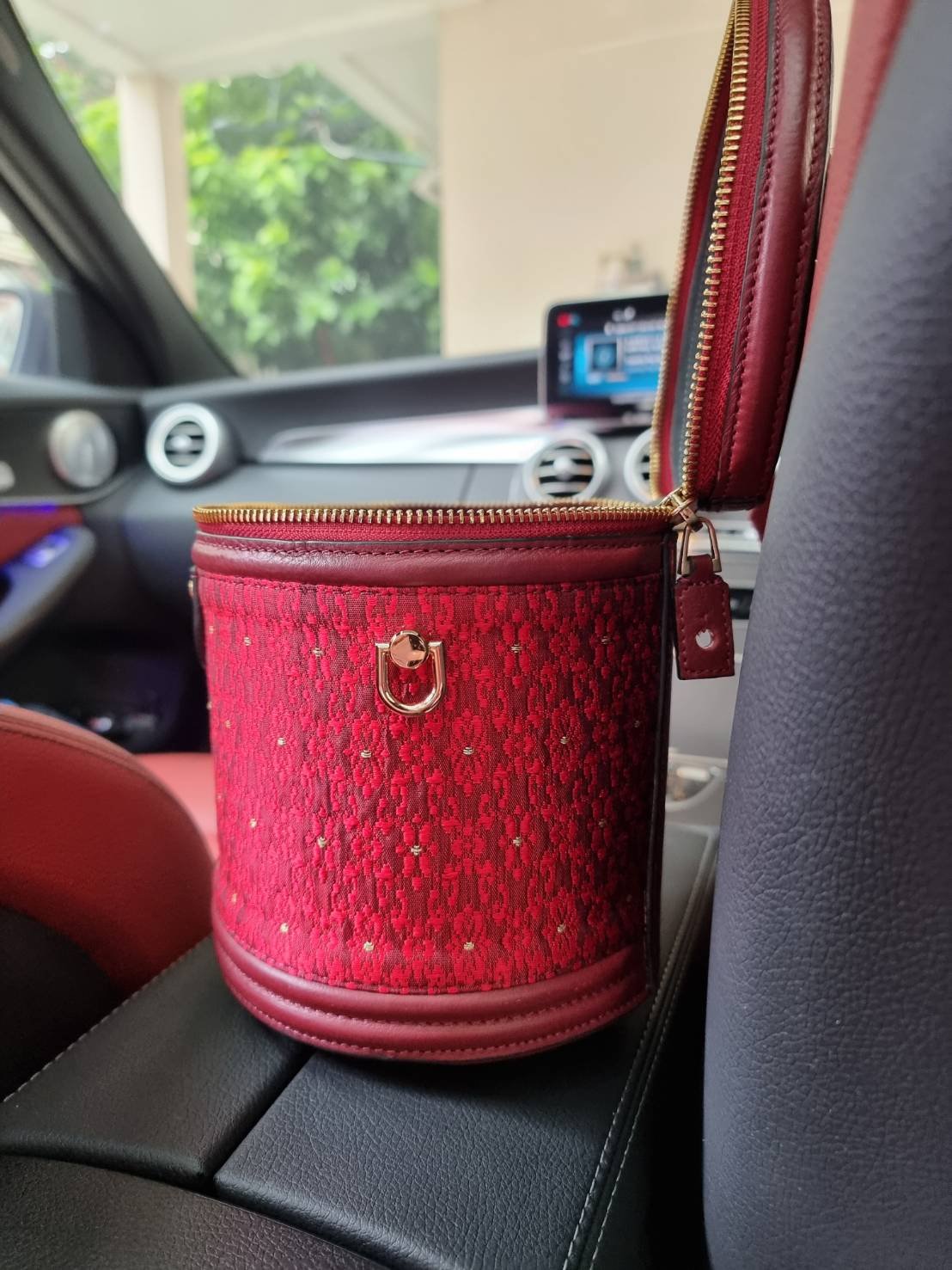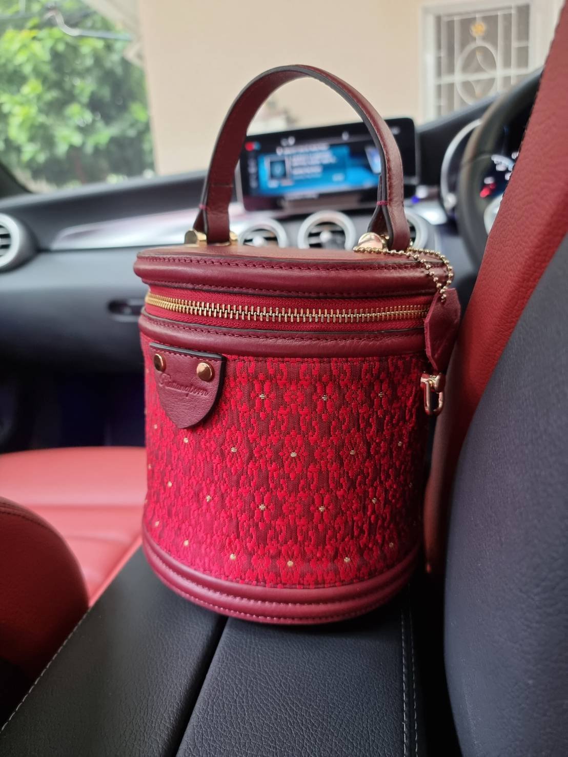 กระเป๋าผลิตจากผ้าไหมยกดอกลำพูนสีแดงเลือดหมู
