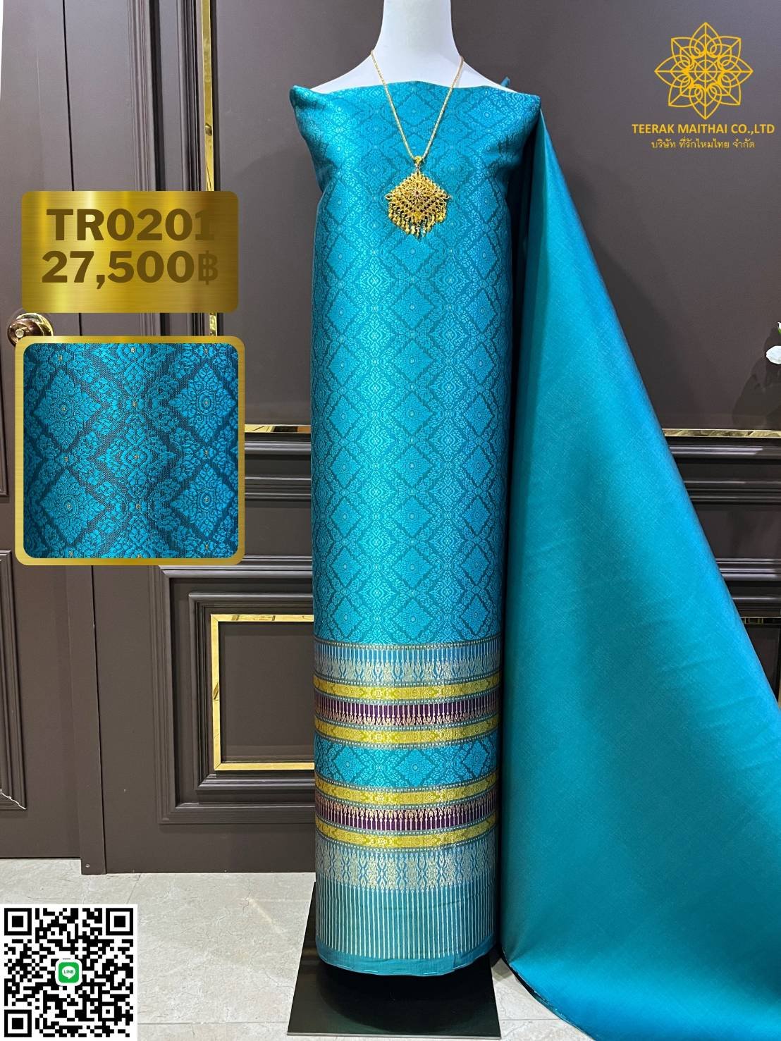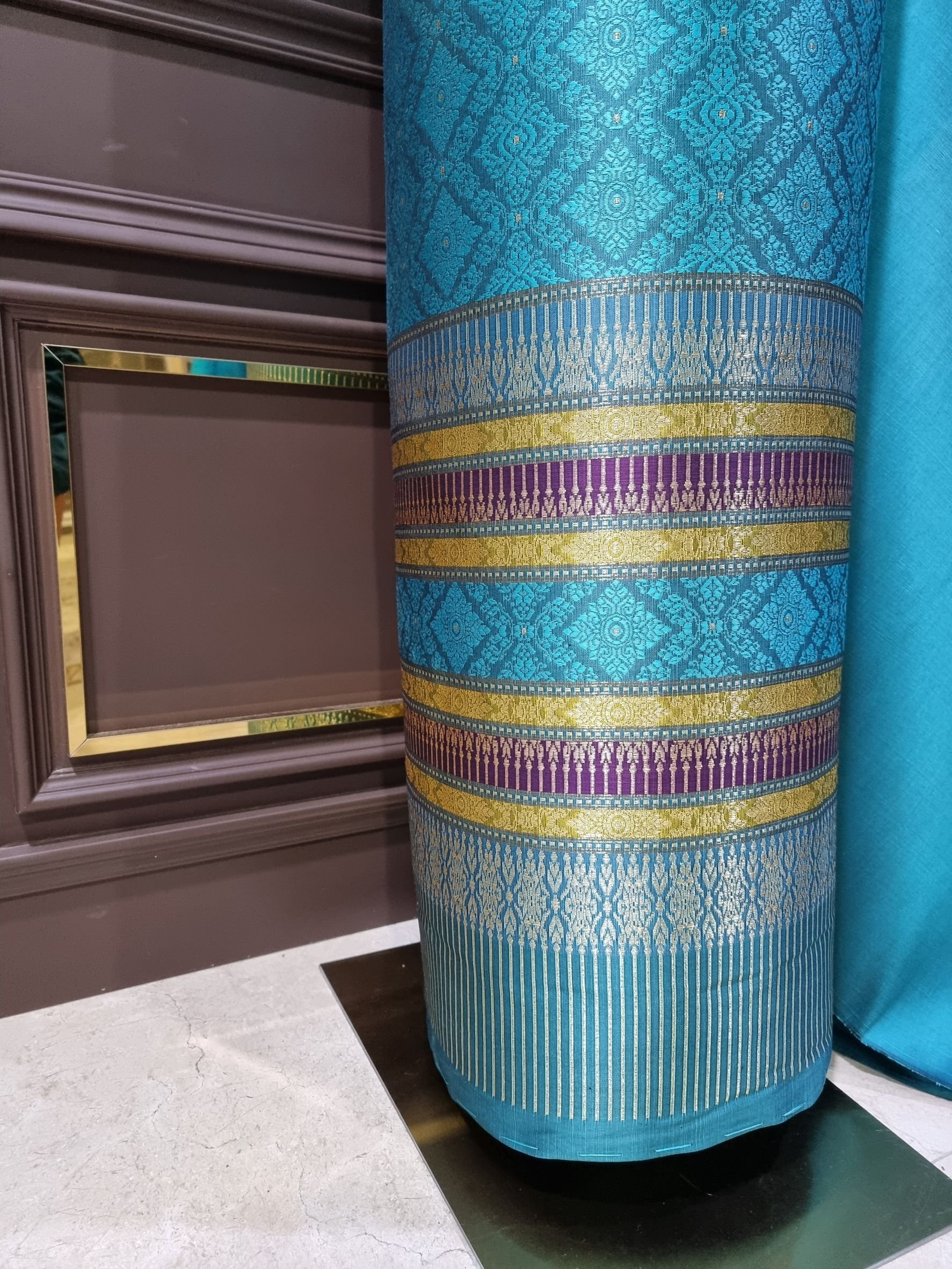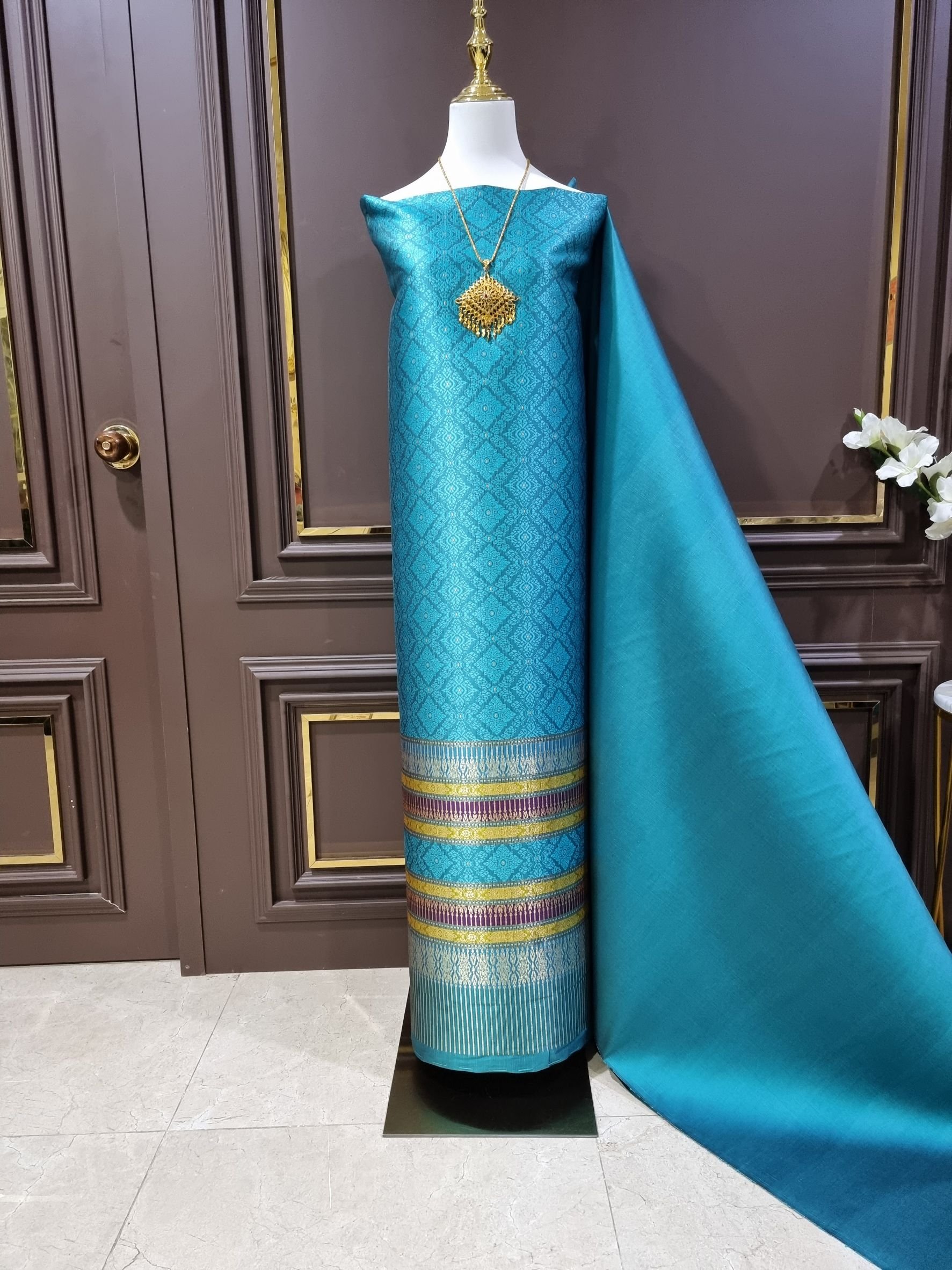 ผ้าไหมยกดอกลำพูนสีฟ้าน้ำทะเลเกาะเชิงดิ้นเงิน