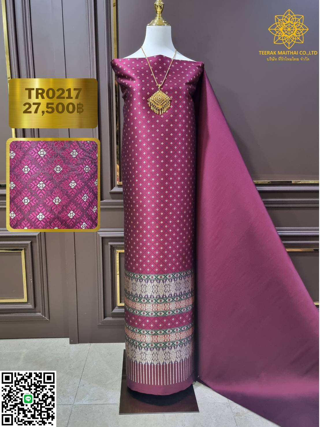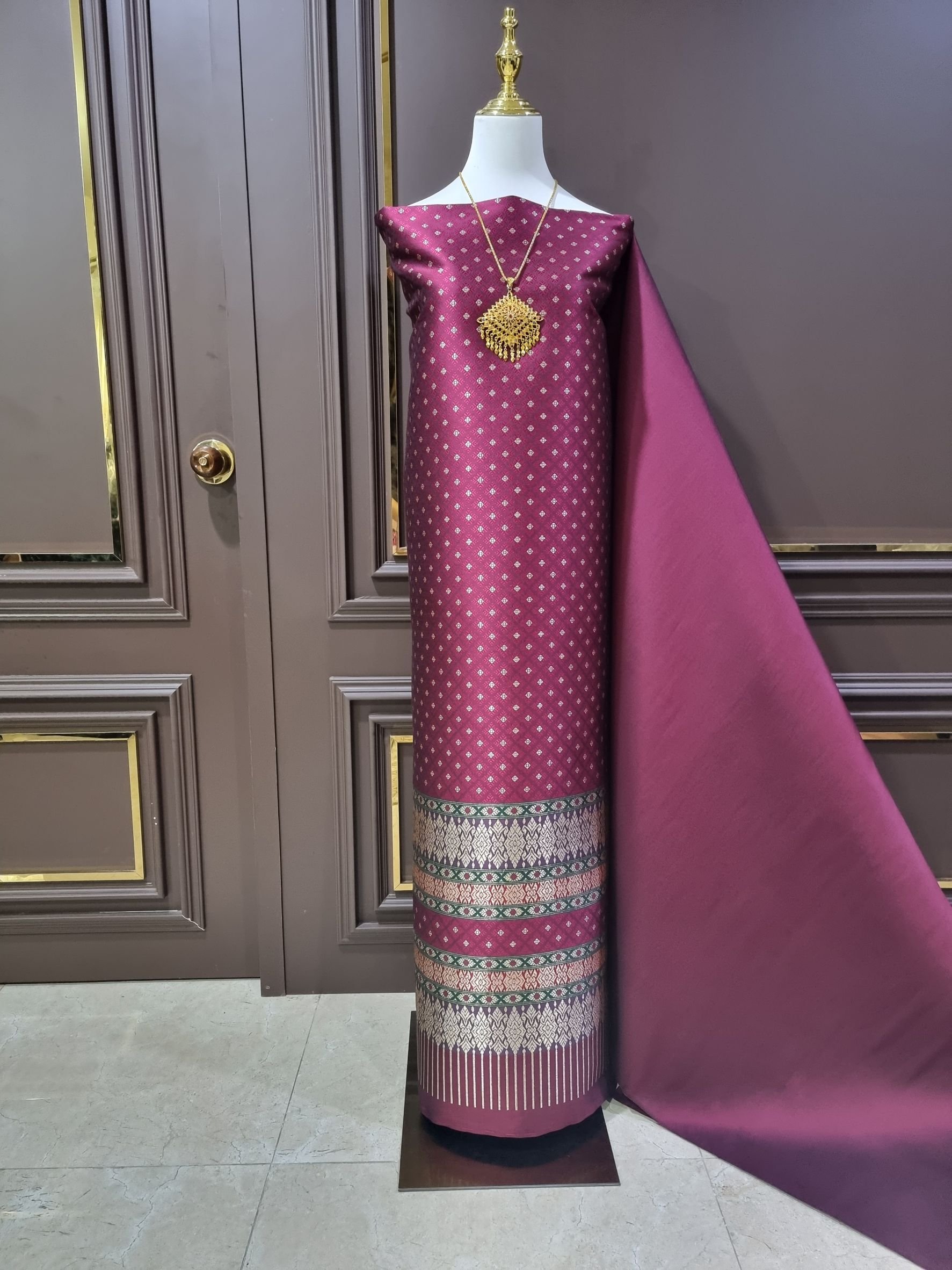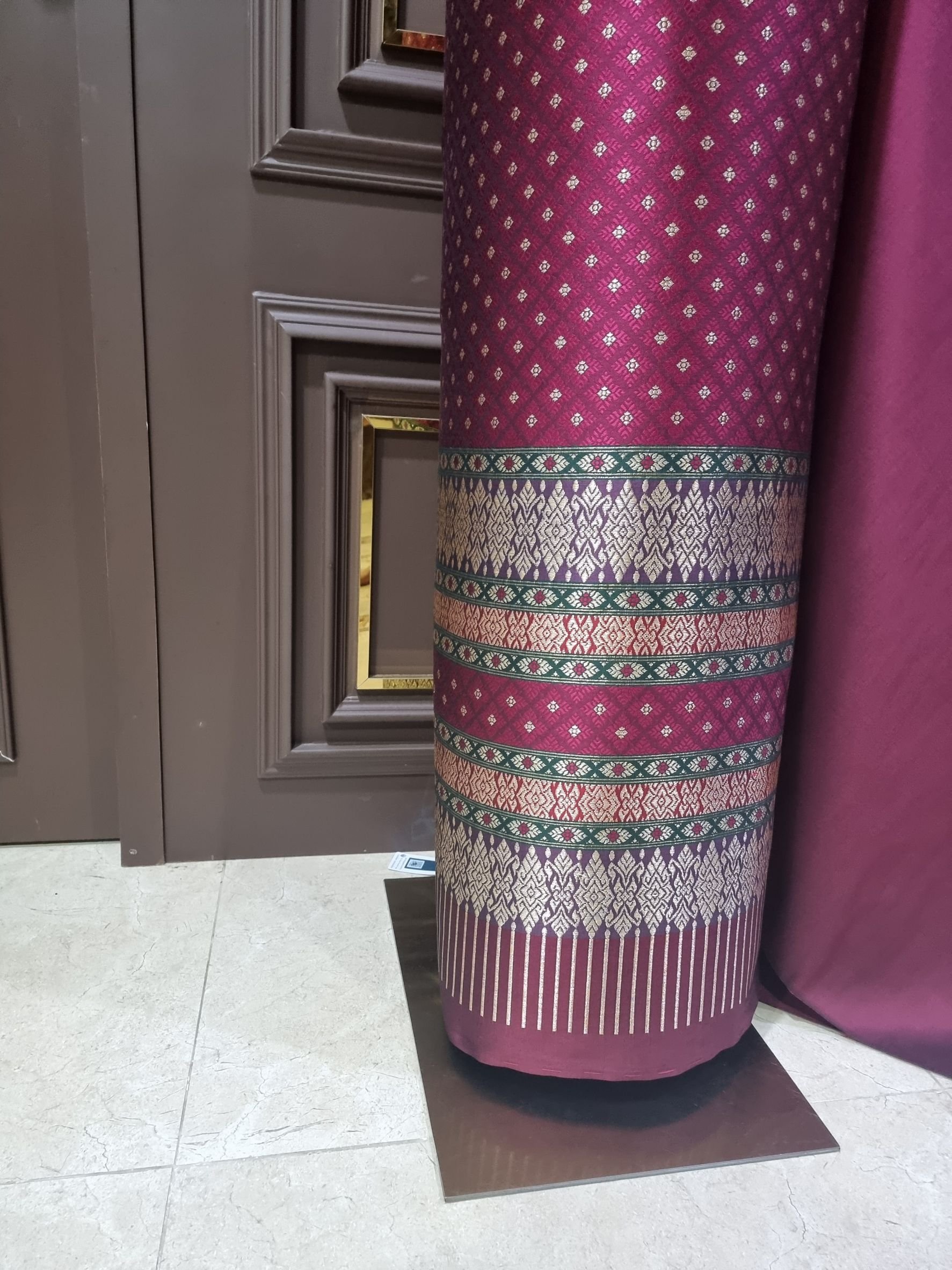 ผ้าไหมยกดอกลำพูนสีแดงเลือดหมูดิ้นทอง
