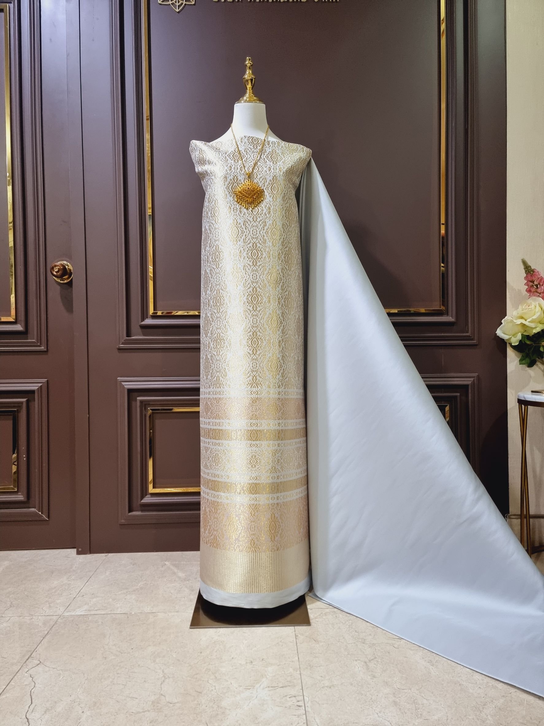 ลายสุริยะฉาย ผ้าไหมยกใหญ่ลำพูนสีขาวออฟไวท์ยกดอกดิ้นเงิน