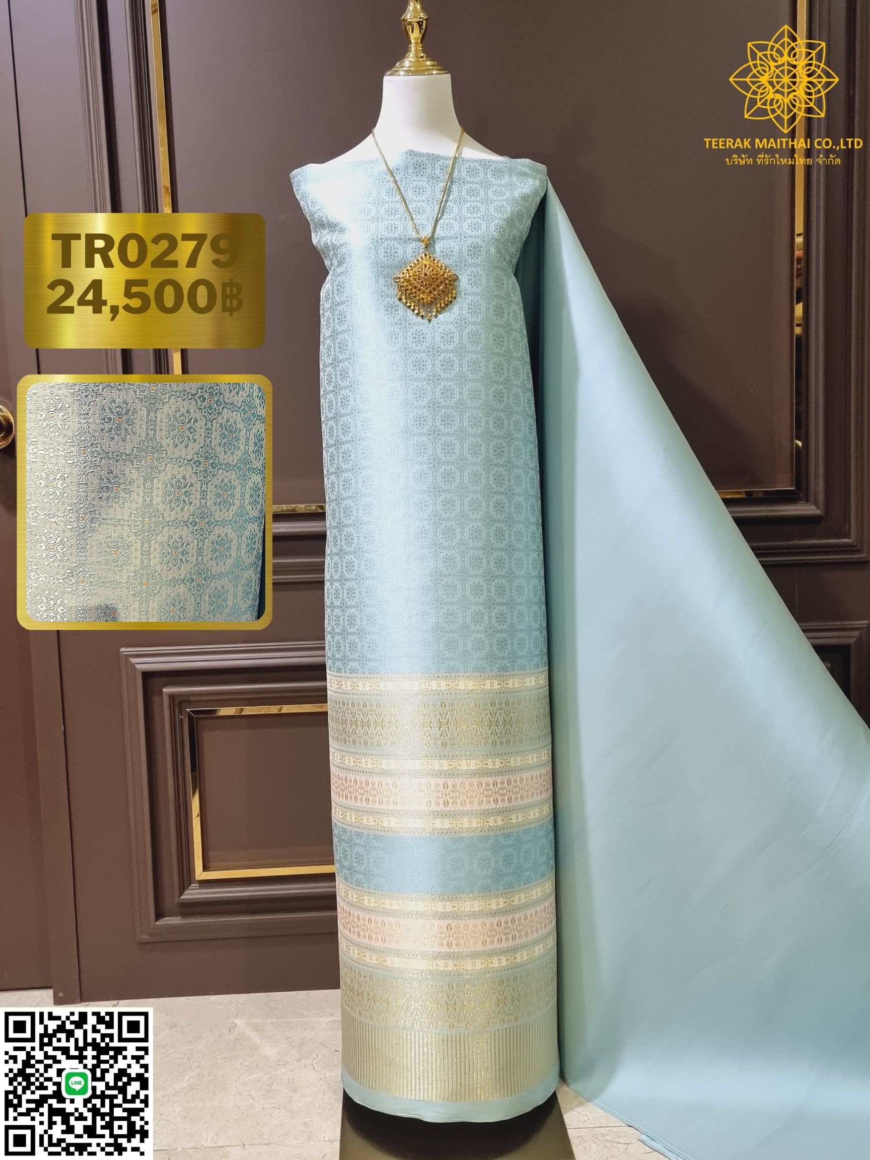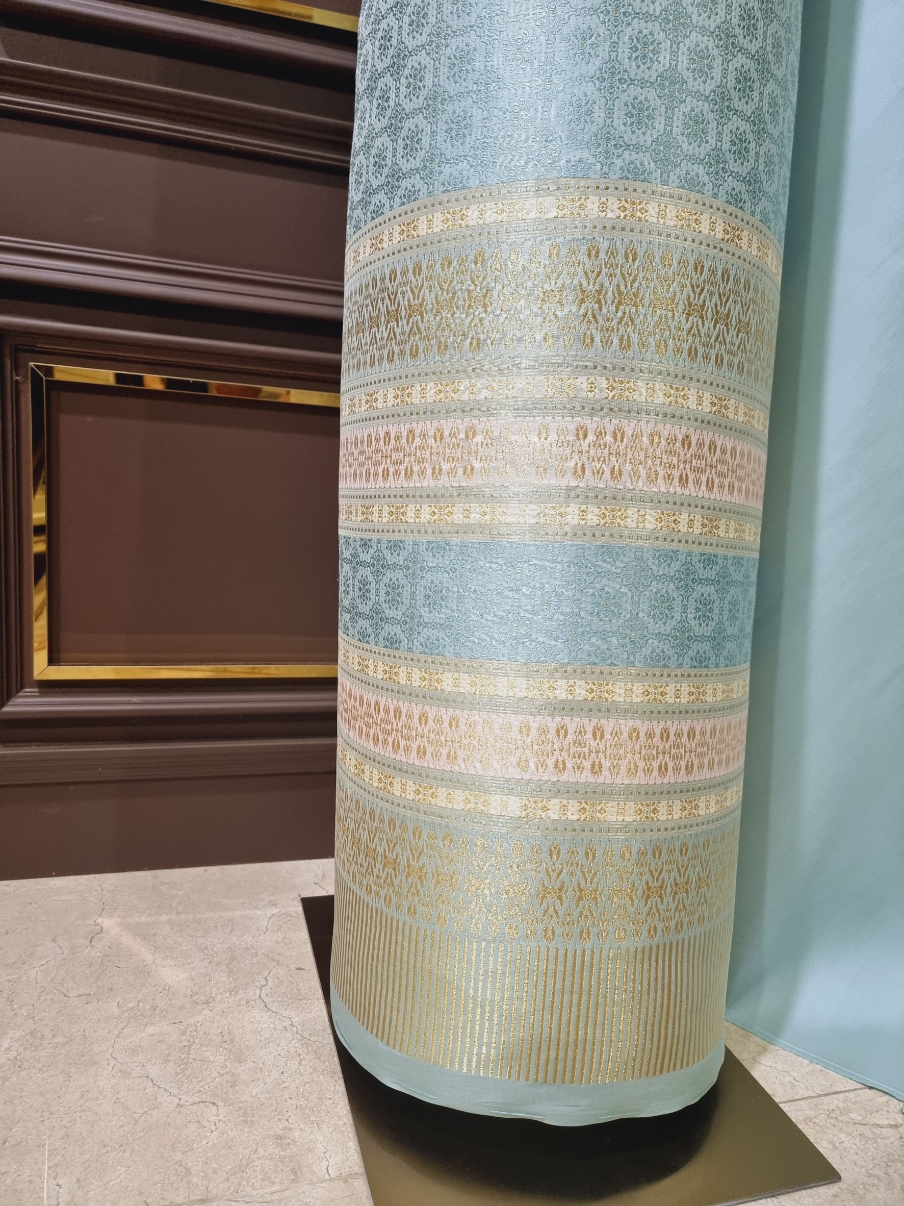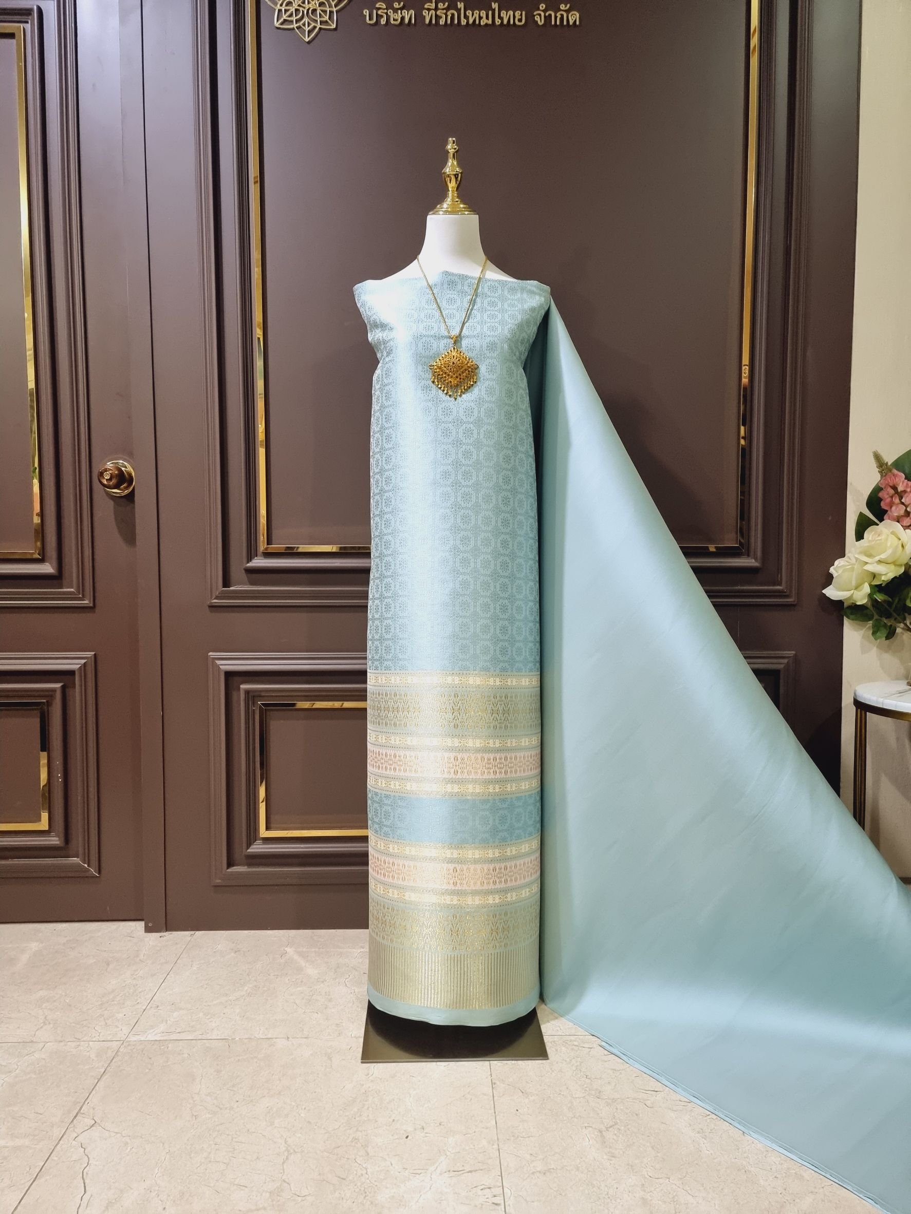 ผ้าไหมลำพูนสีฟ้าเทาเกาะเชิงดิ้นทอง