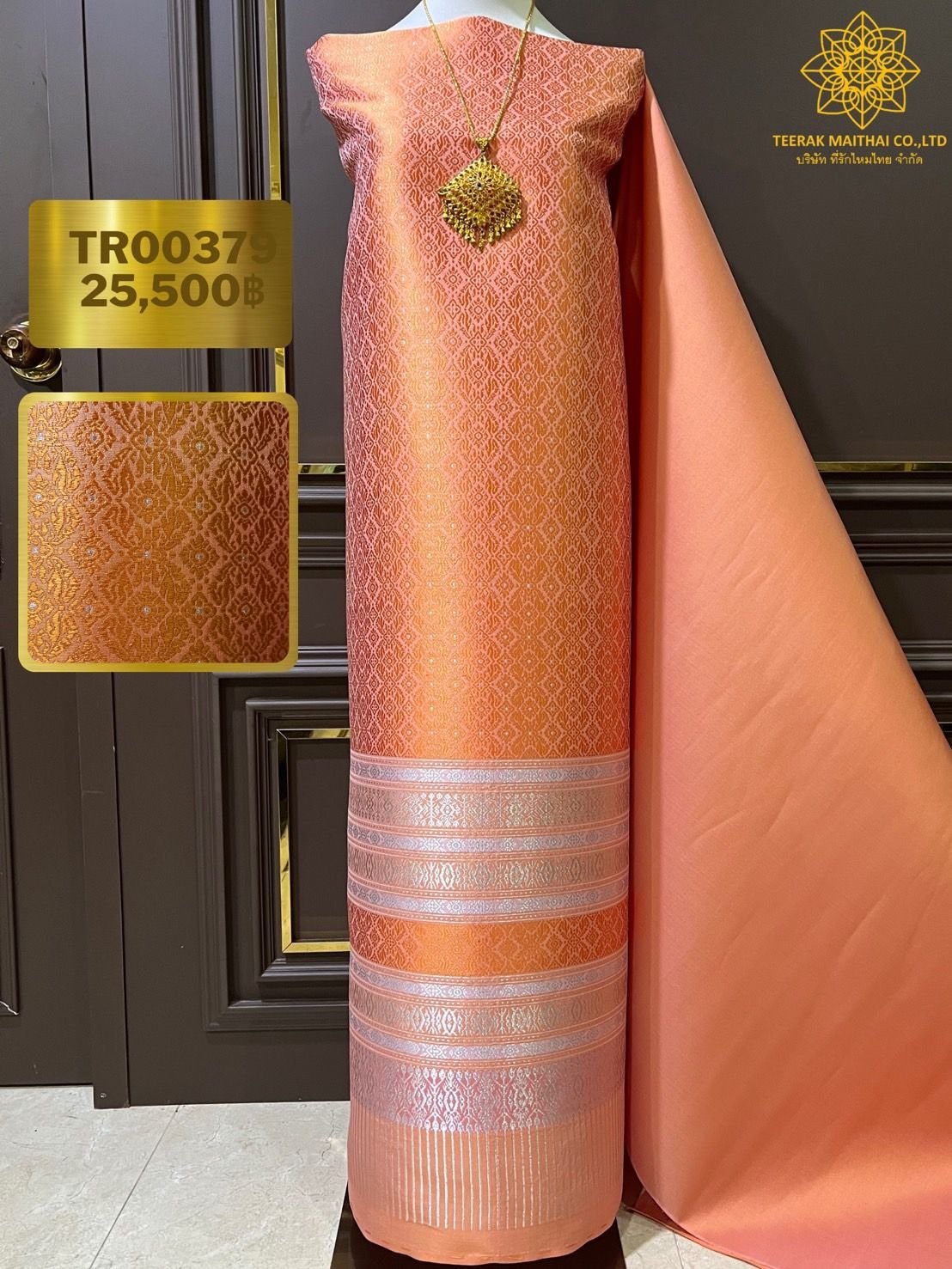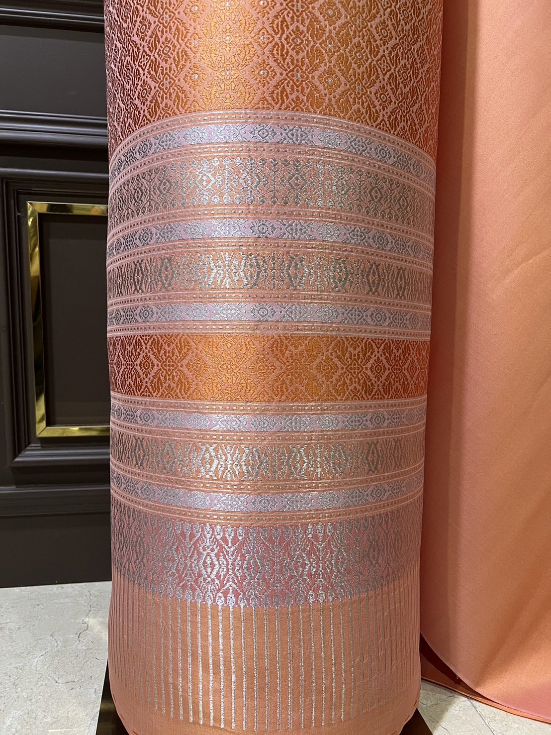 ลายพิกุลสลักต้นเทียน ผ้าไหมลำพูนสีส้มเกาะเชิงดิ้นเงิน