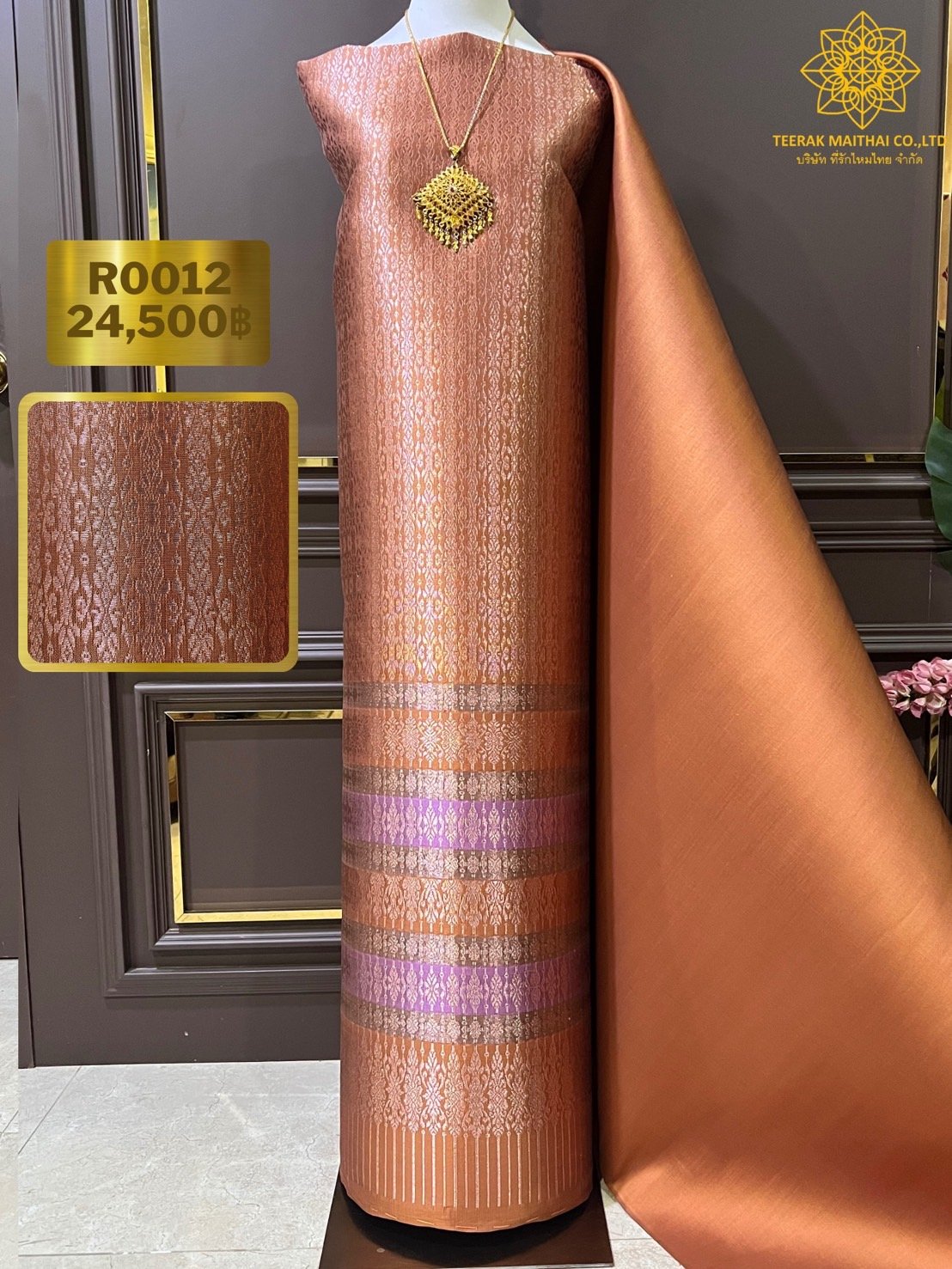 ลายชะเอมเทศ ยกใหญ่สีน้ำตาลทองเกาะเชิงดิ้นชมพูยกดอกดิ้นชมพู