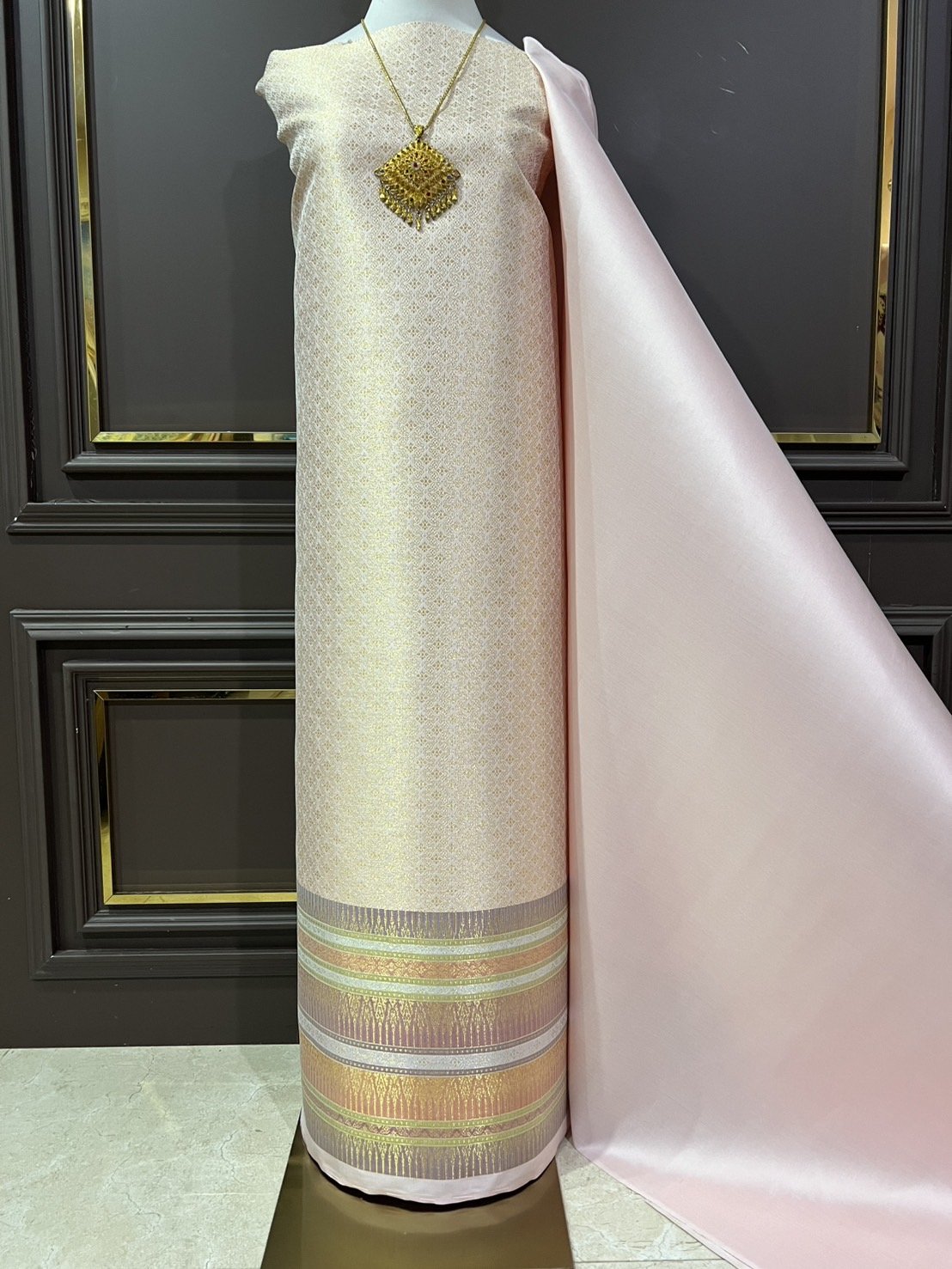 ลายพิกุลโบราณ ยกใหญ่ลำพูนสีชมพูหวานยกดอกดิ้นทอง