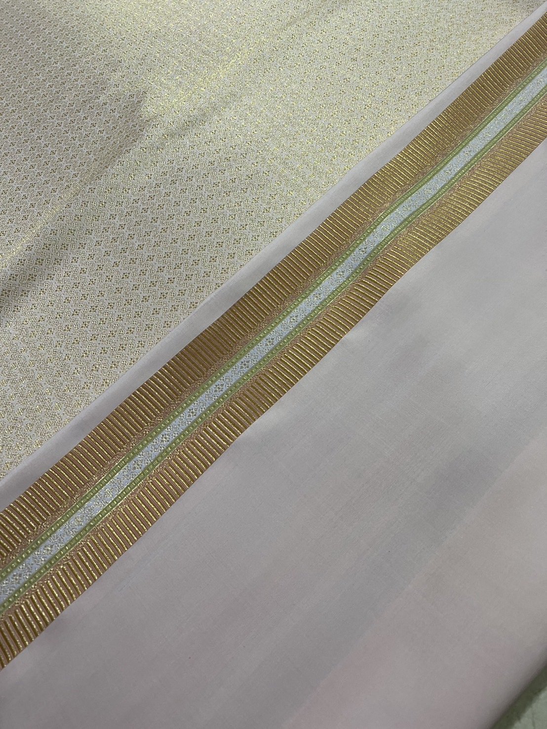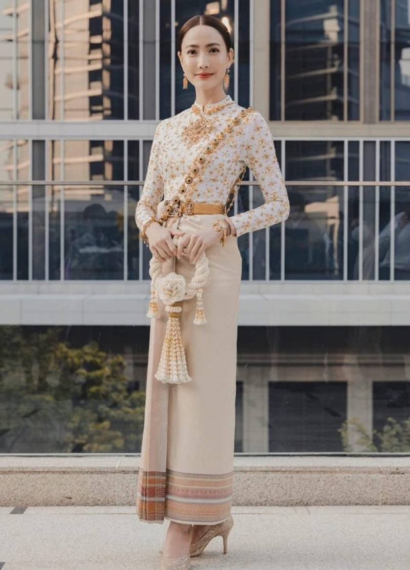 ลายราชสำนัก ยกใหญ่ลำพูนสีขาวออฟไวท์เกาะเชิงดิ้นเงินเกษรดิ้นเงิน
