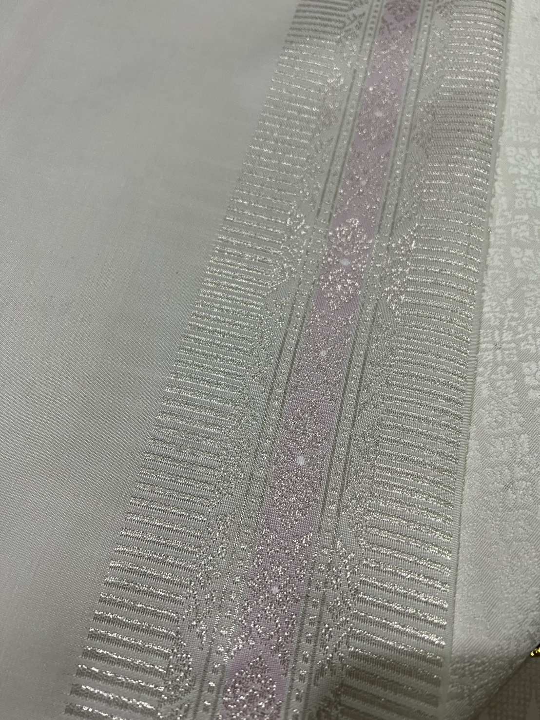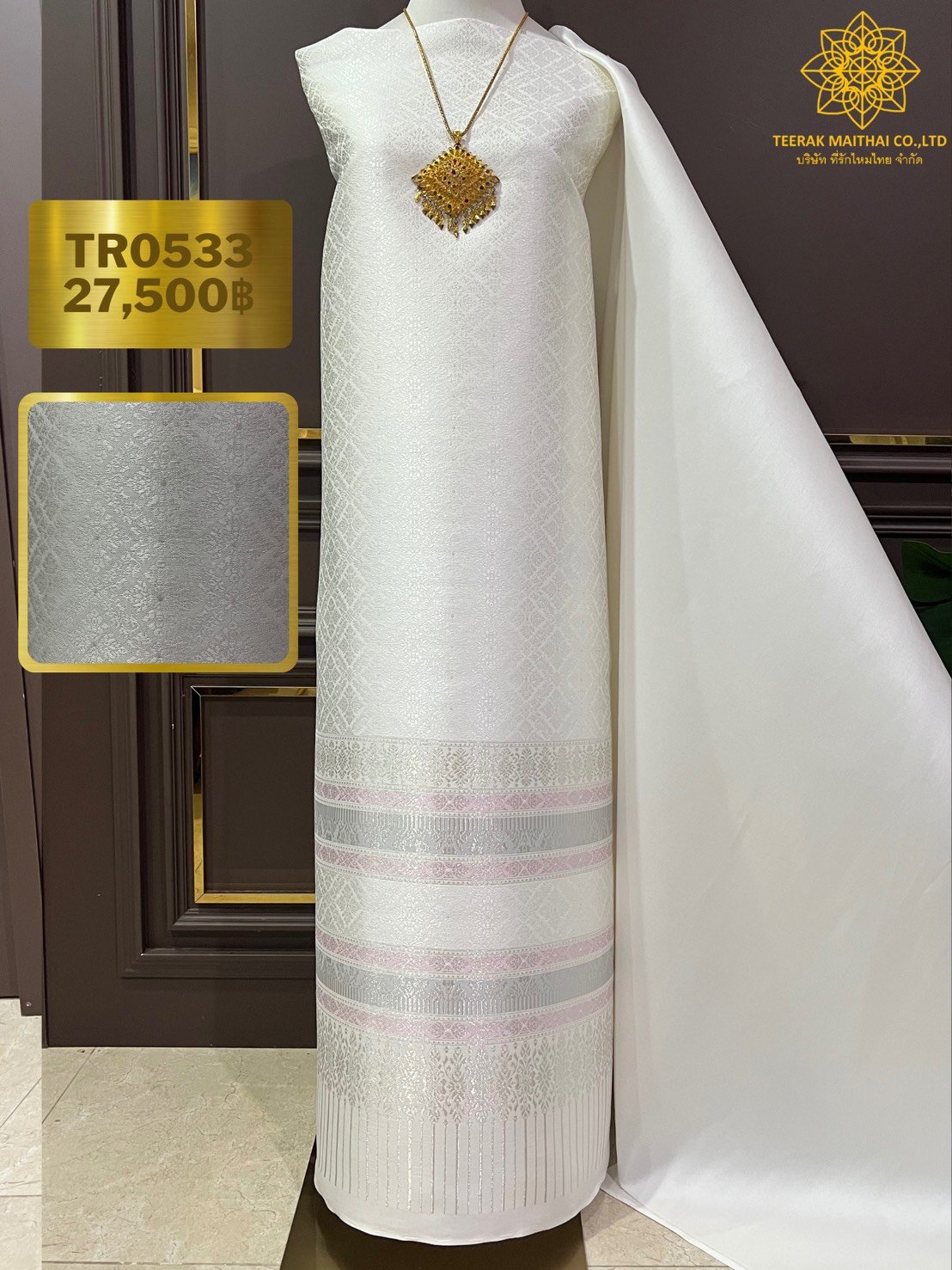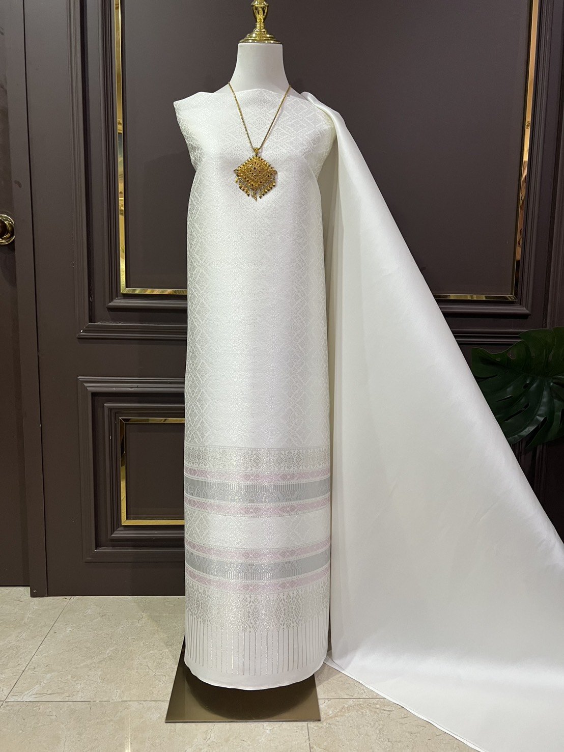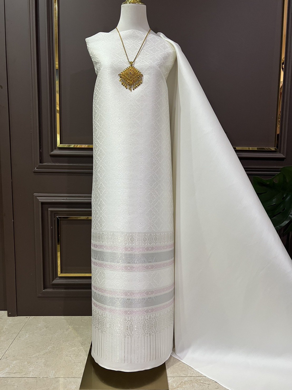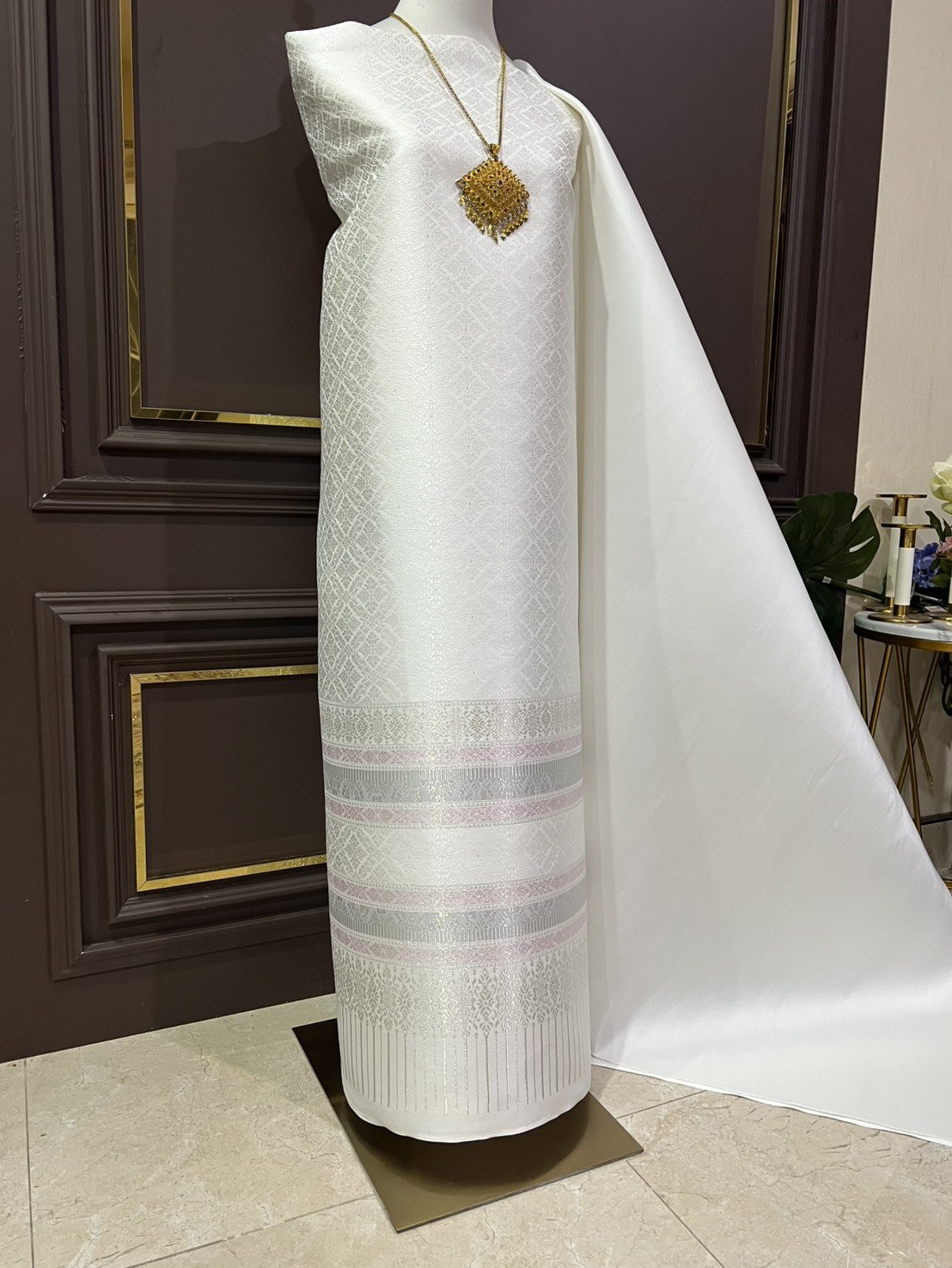 ลายราชสำนัก ยกใหญ่ลำพูนสีขาวออฟไวท์เกาะเชิงดิ้นเงินเกษรดิ้นเงิน