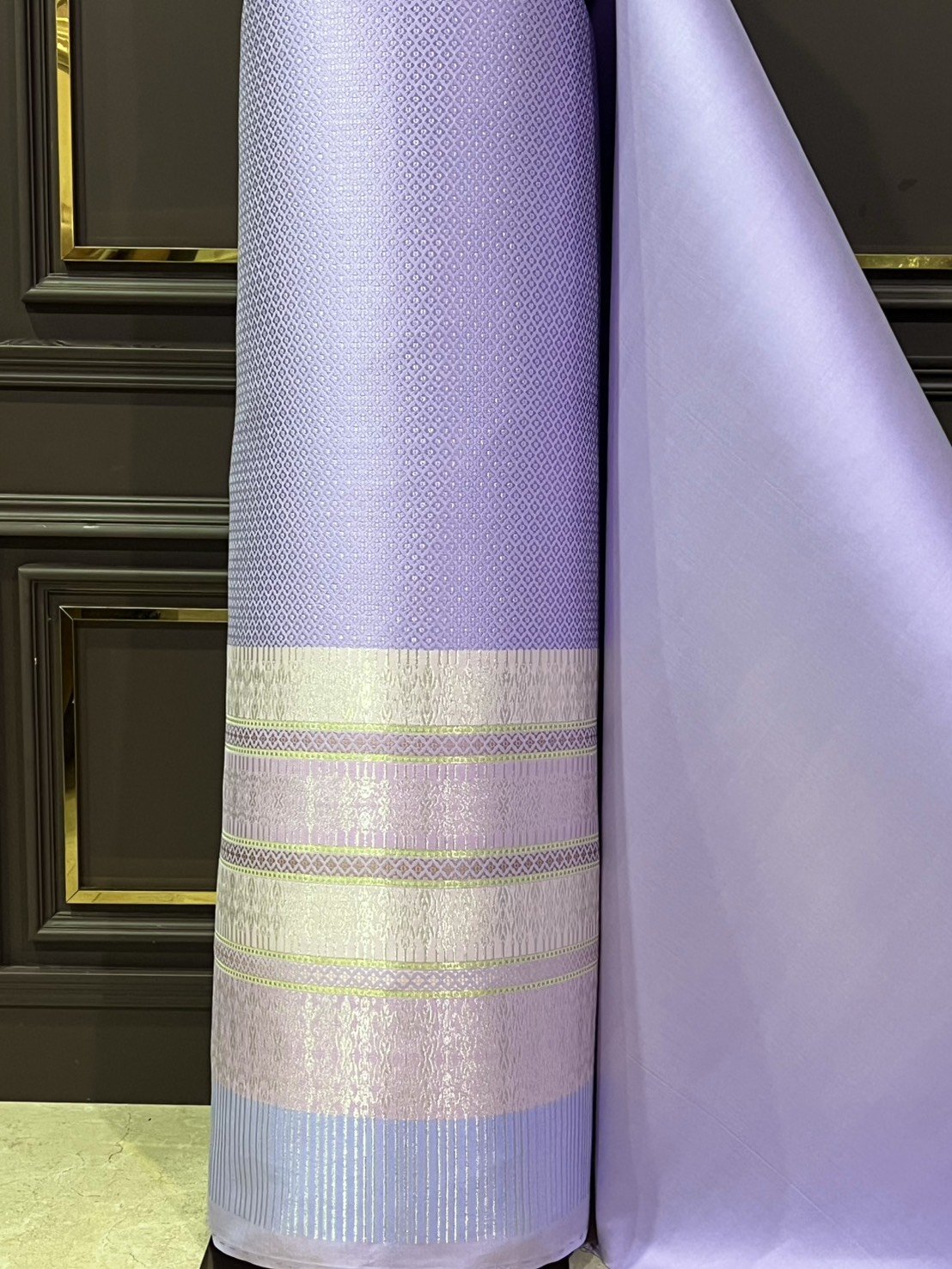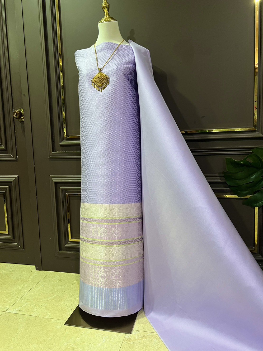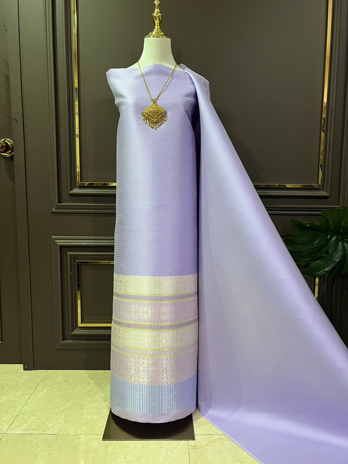 ลายช่อพิกุล ผ้าไหมยกดอกลำพูนสีม่วงพาสเทลเกาะเชิงดิ้นเงิน สอดเกษรดิ้นเงิน