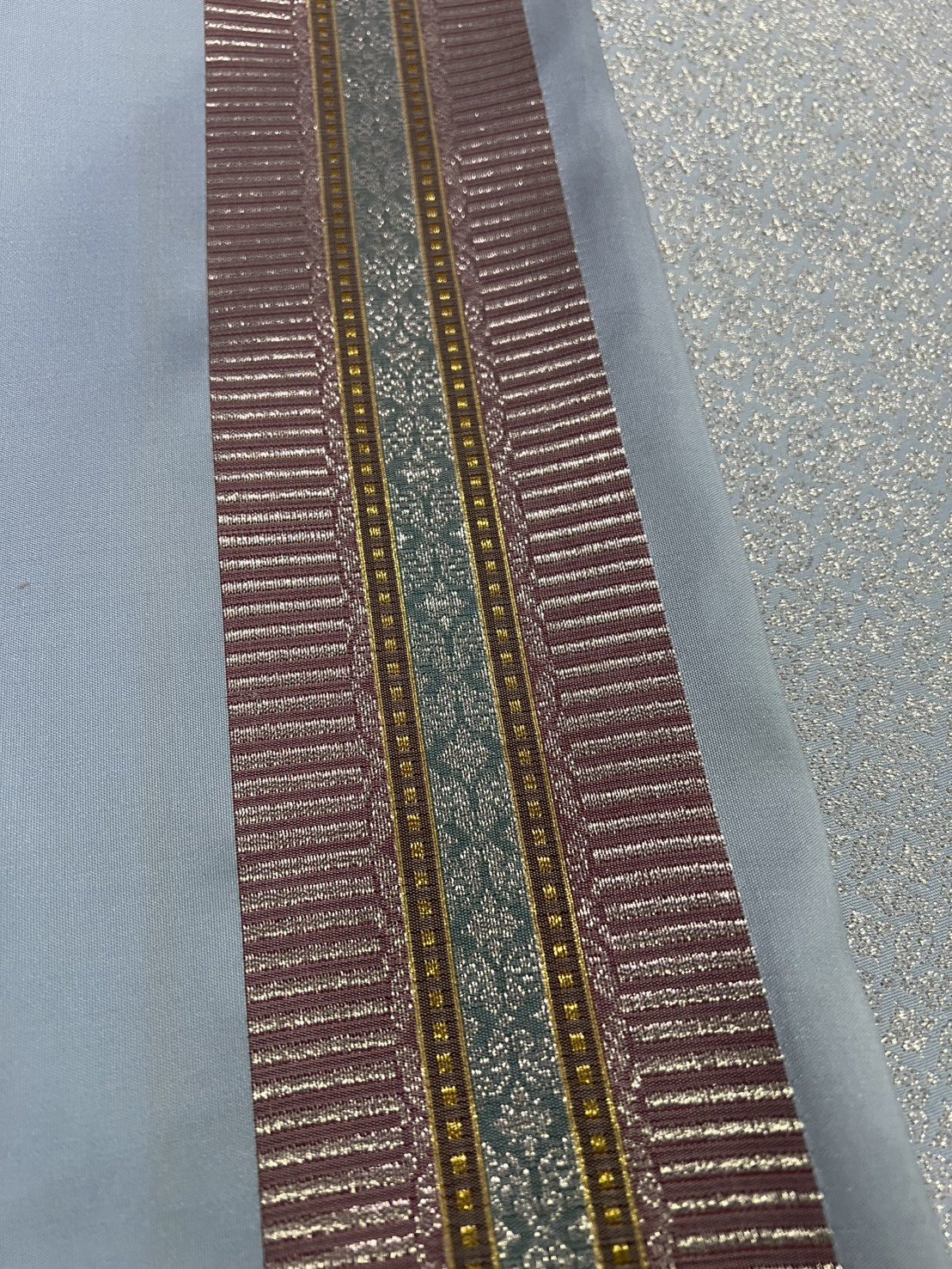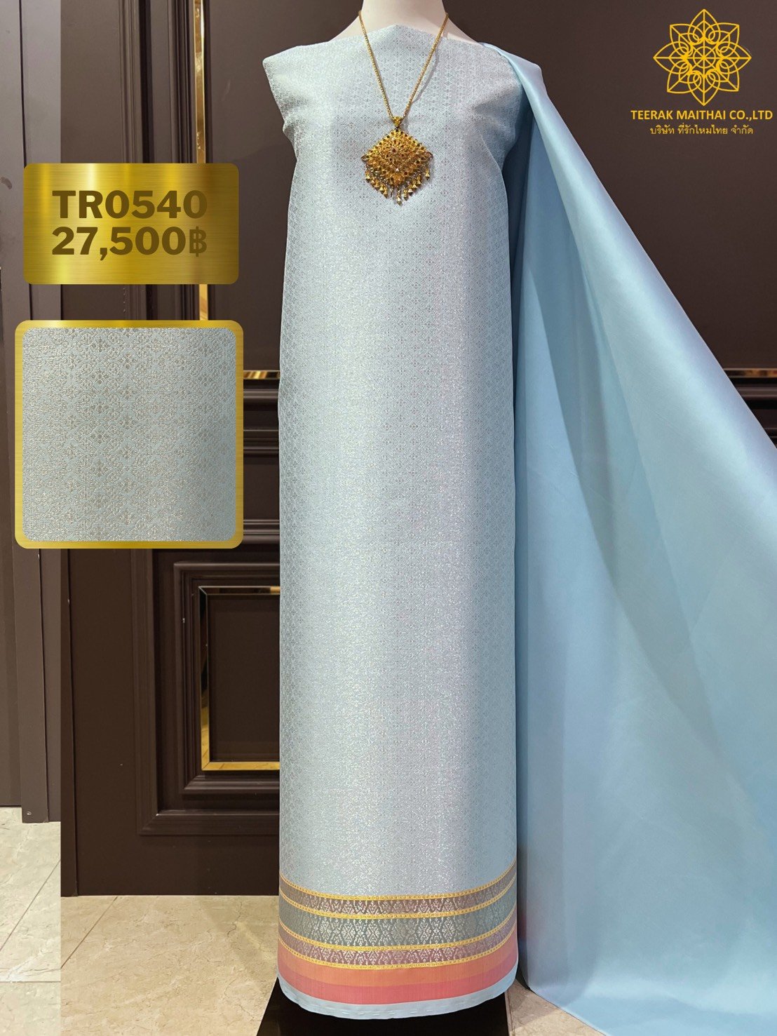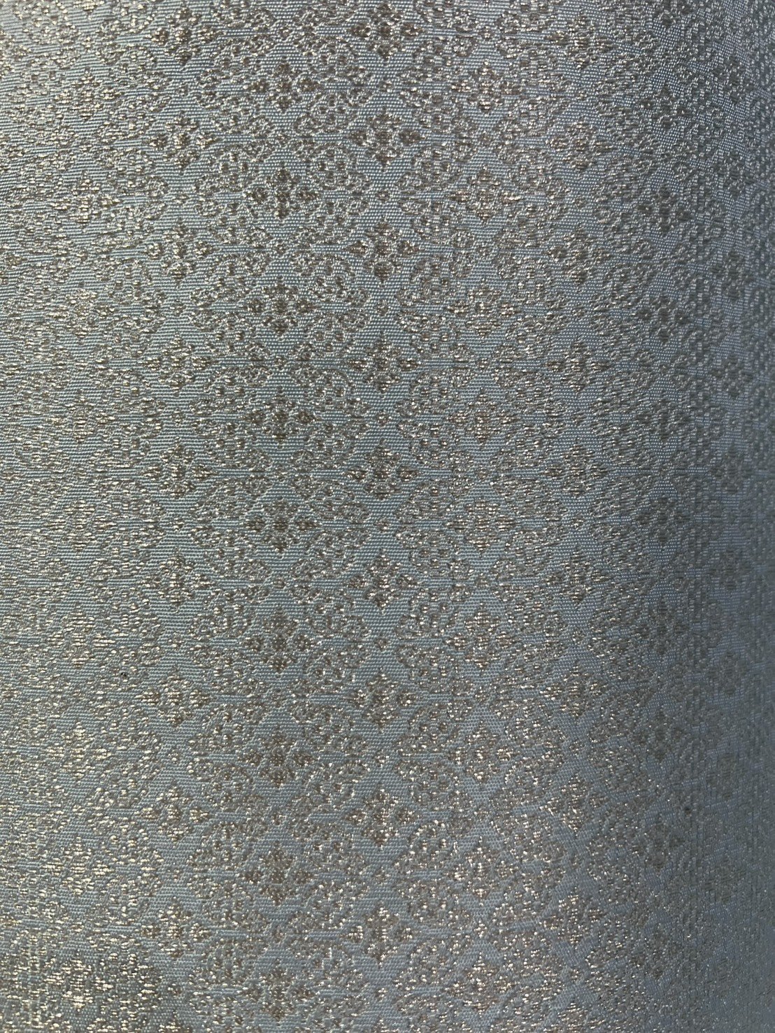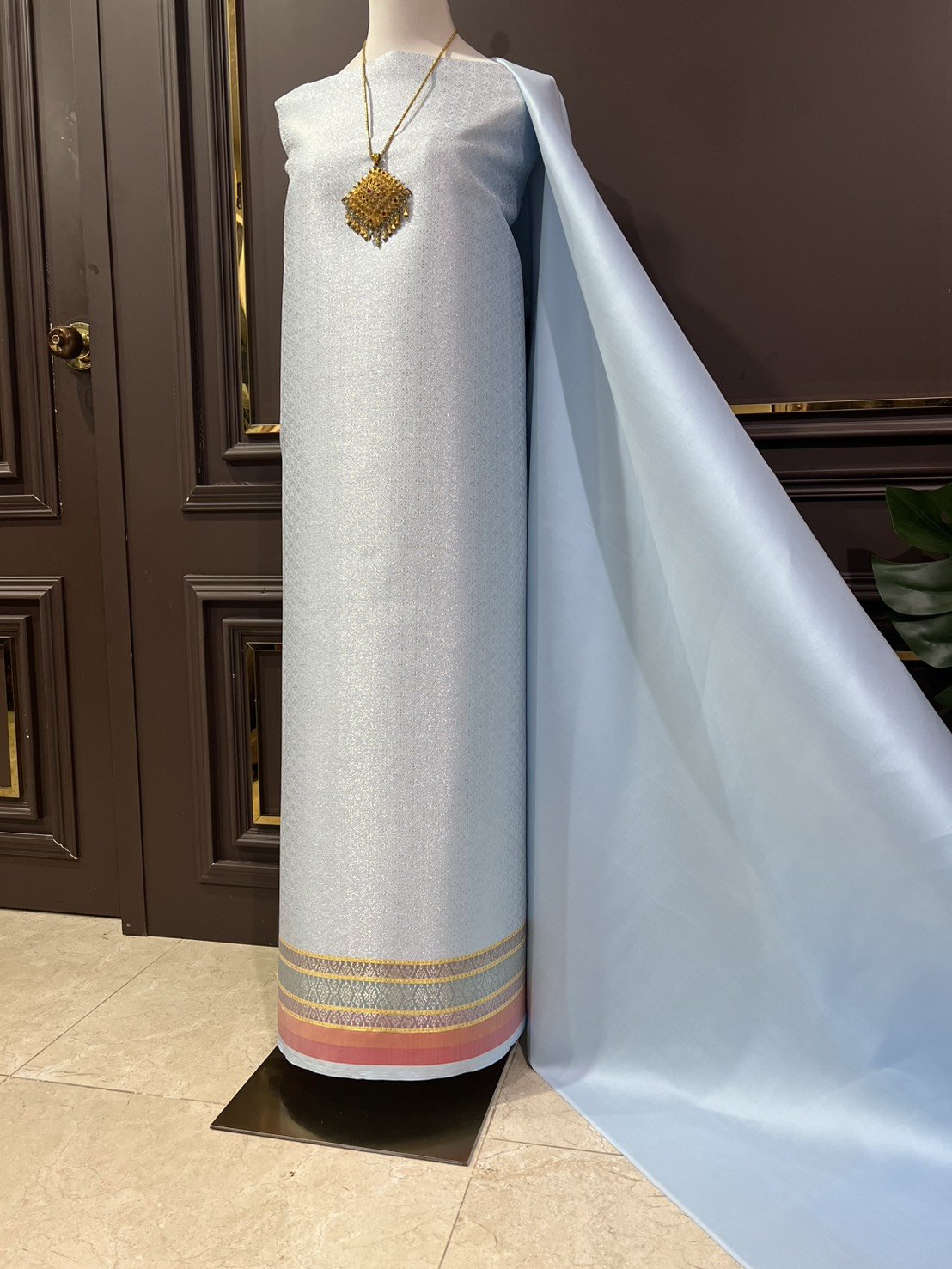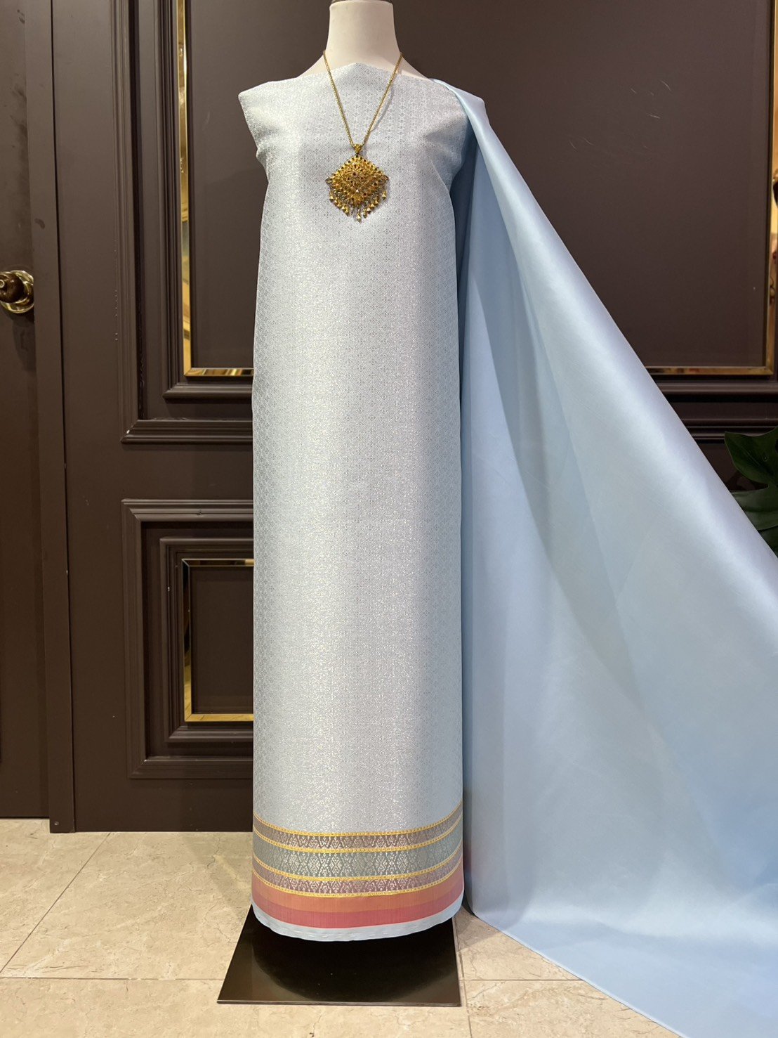 ลายพิกุลโบราณ ผ้าไหมยกดอกลำพูนสีฟ้าพาสเทลยกดอกดิ้นเงิน