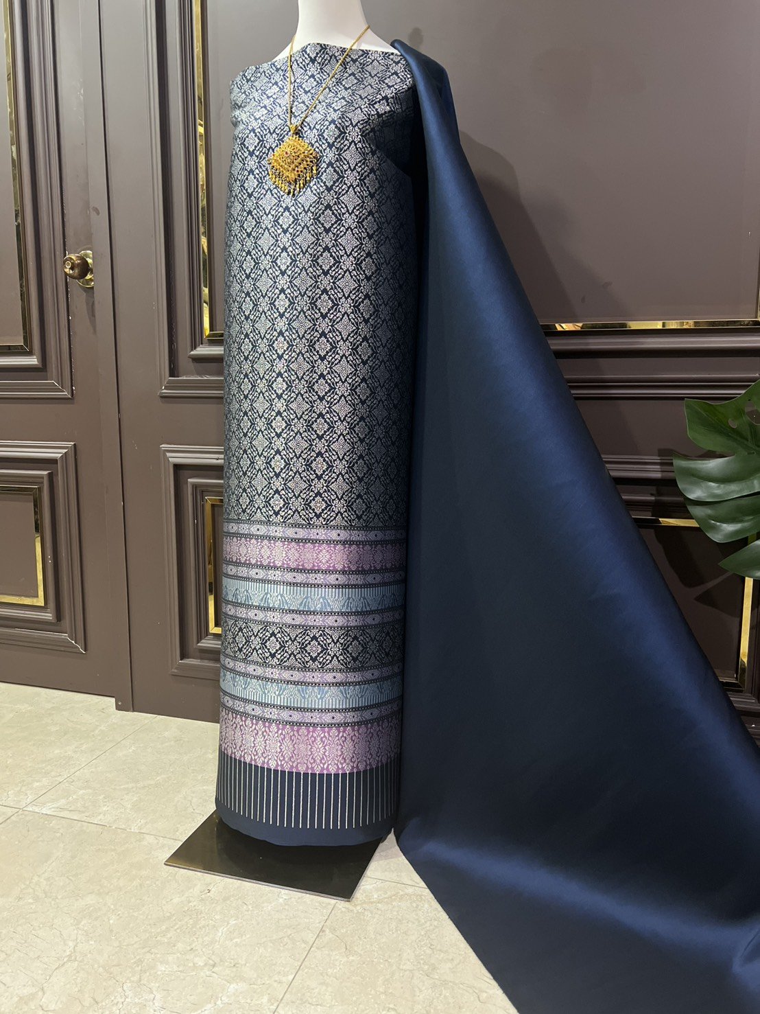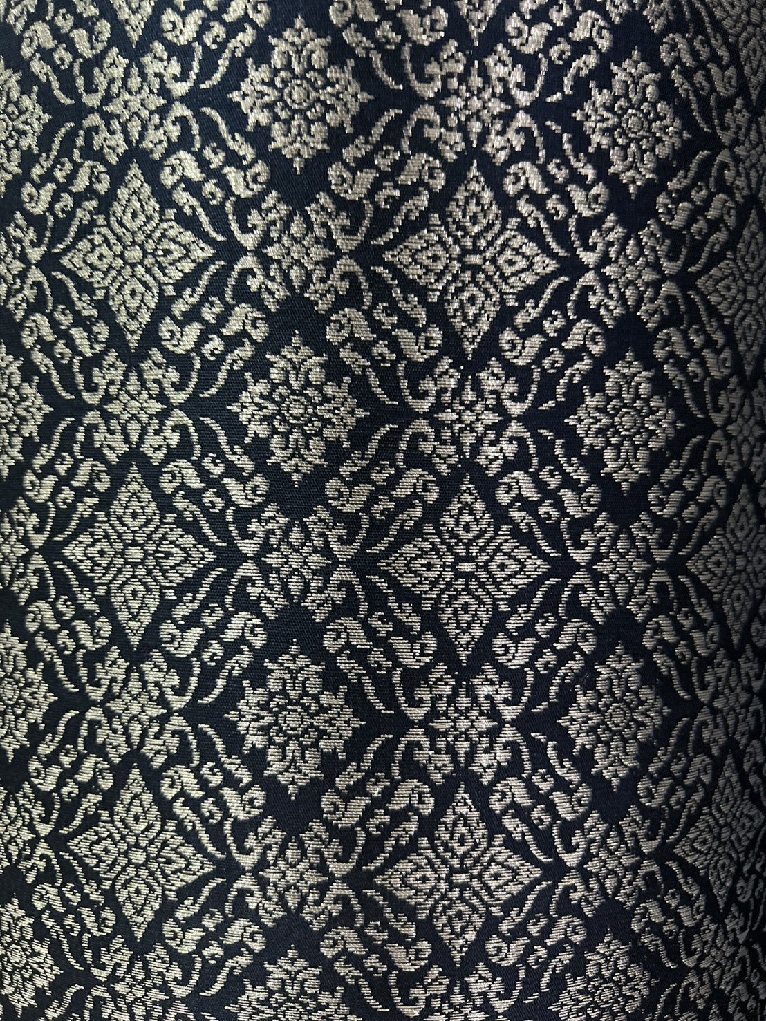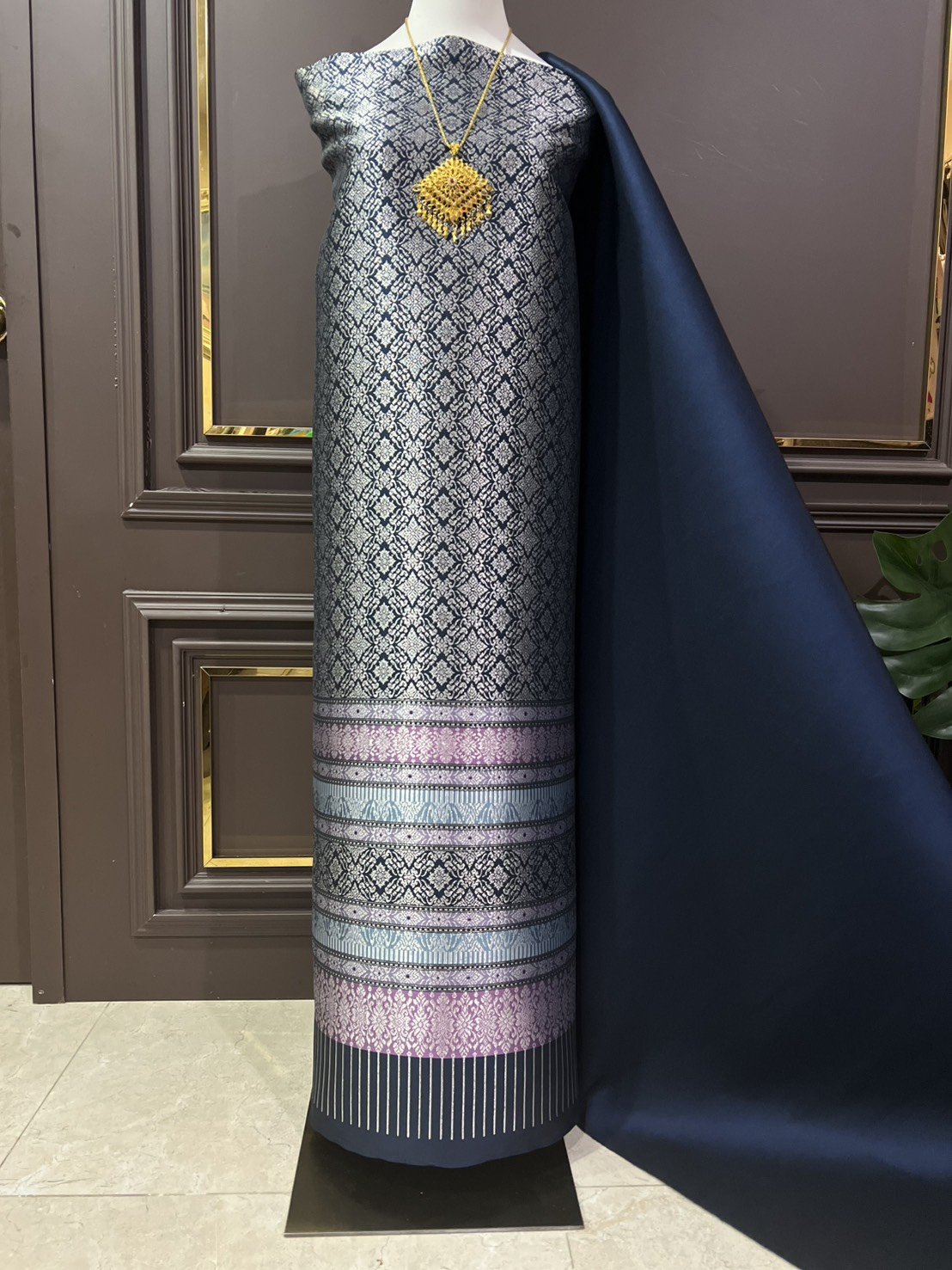 ลายขวัญนารี ผ้าไหมยกใหญ่ลำพูนสีกรมยกดอกดิ้นเงิน