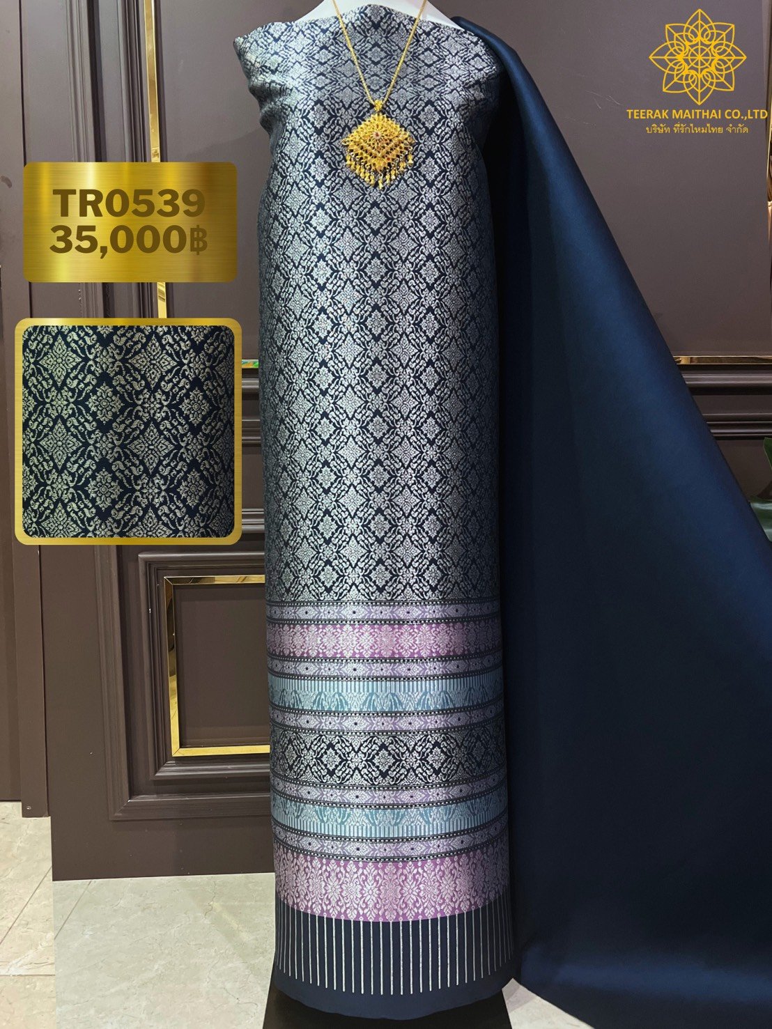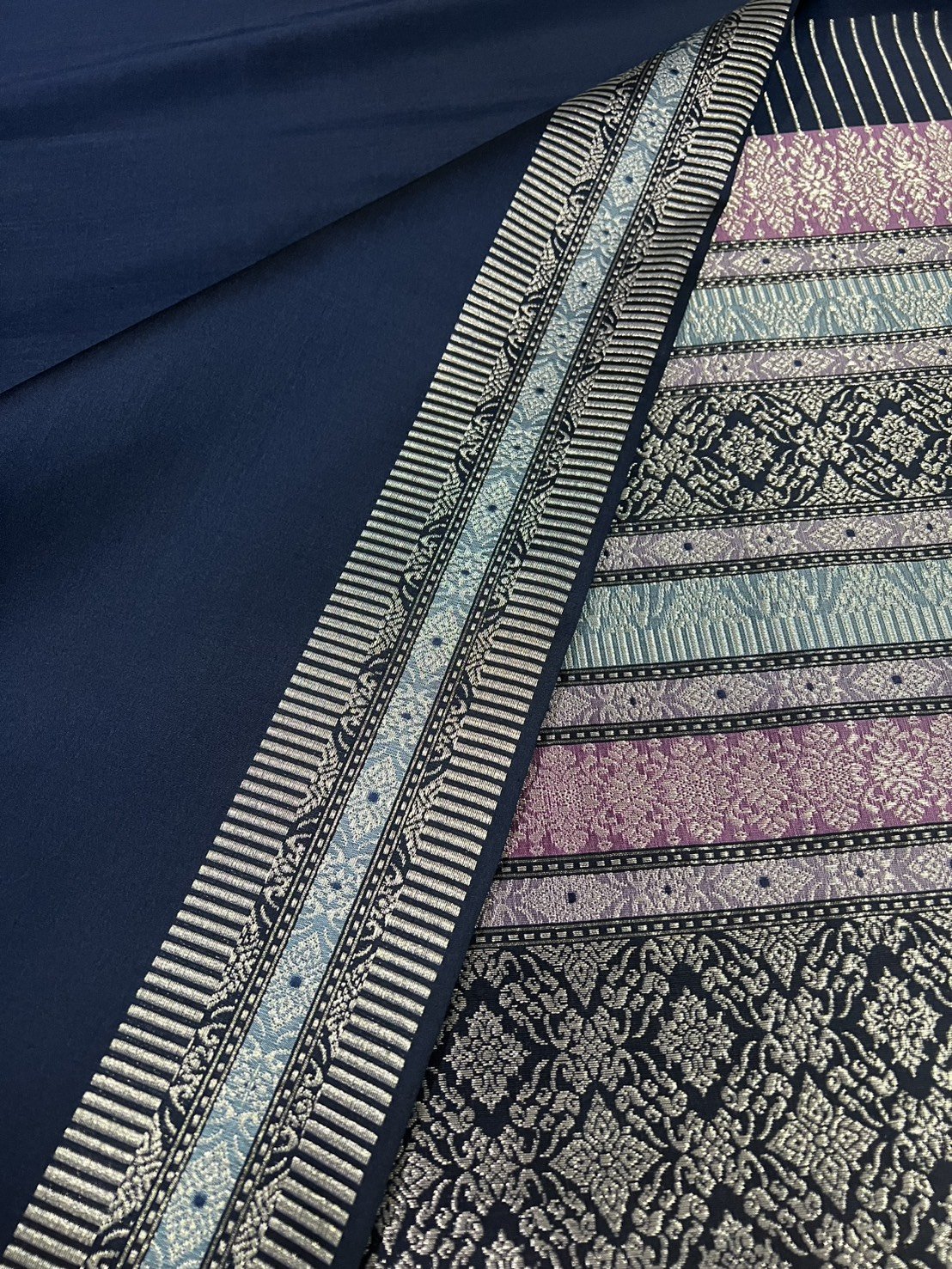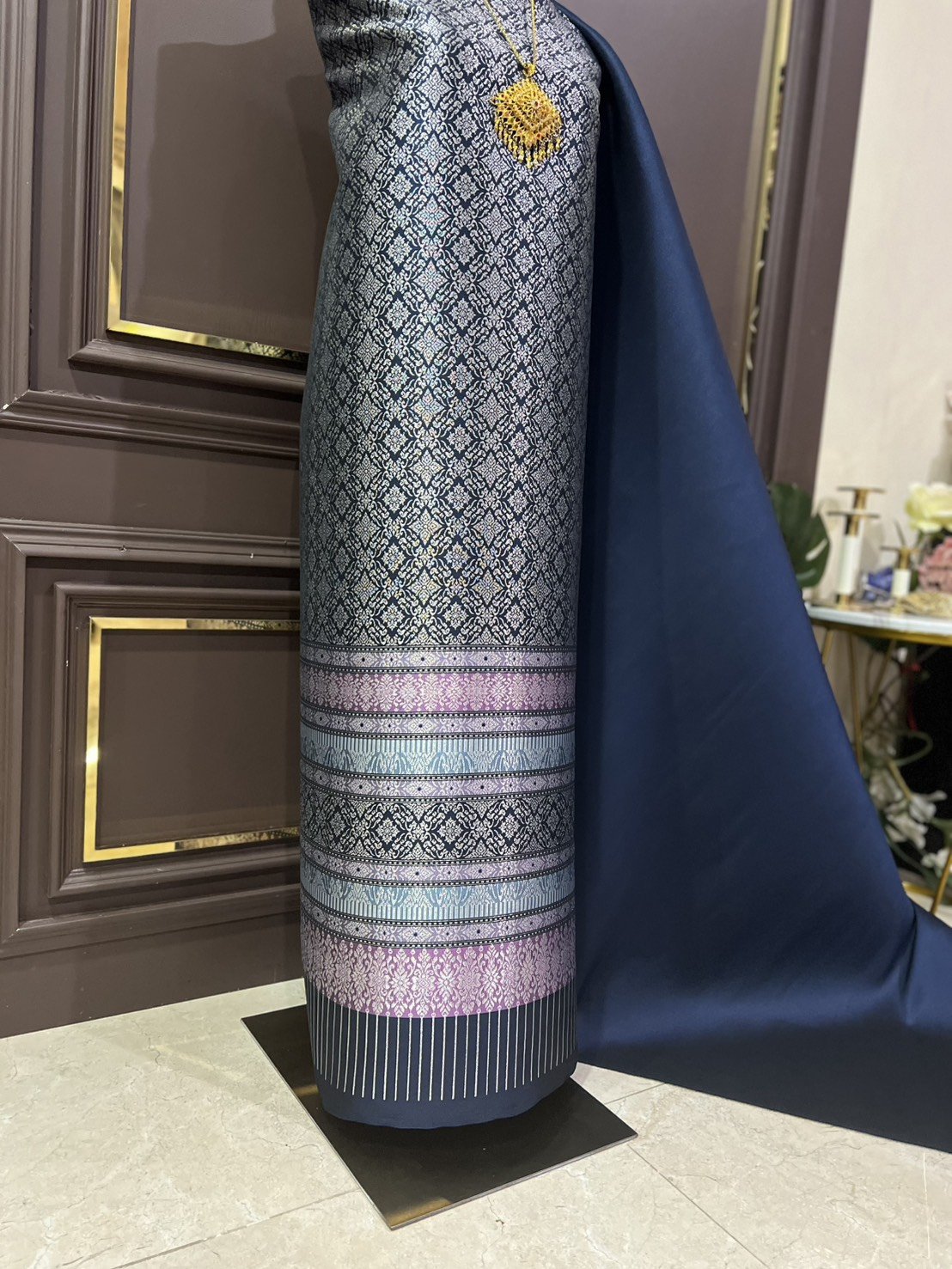 ลายขวัญนารี ผ้าไหมยกใหญ่ลำพูนสีกรมยกดอกดิ้นเงิน