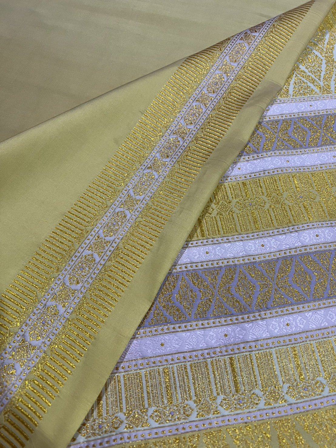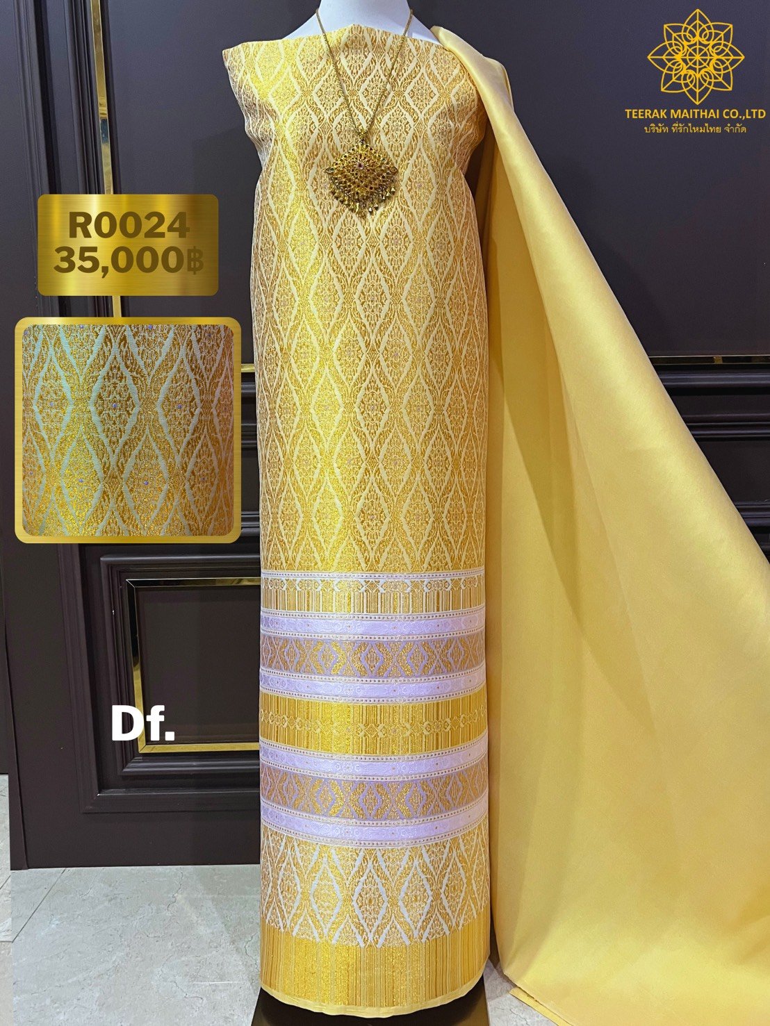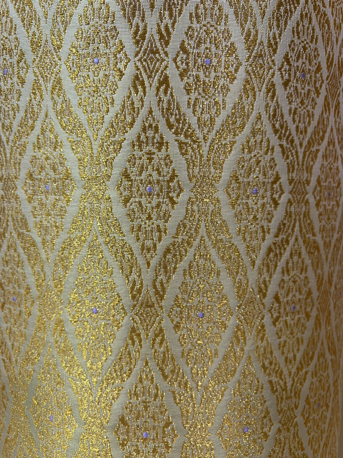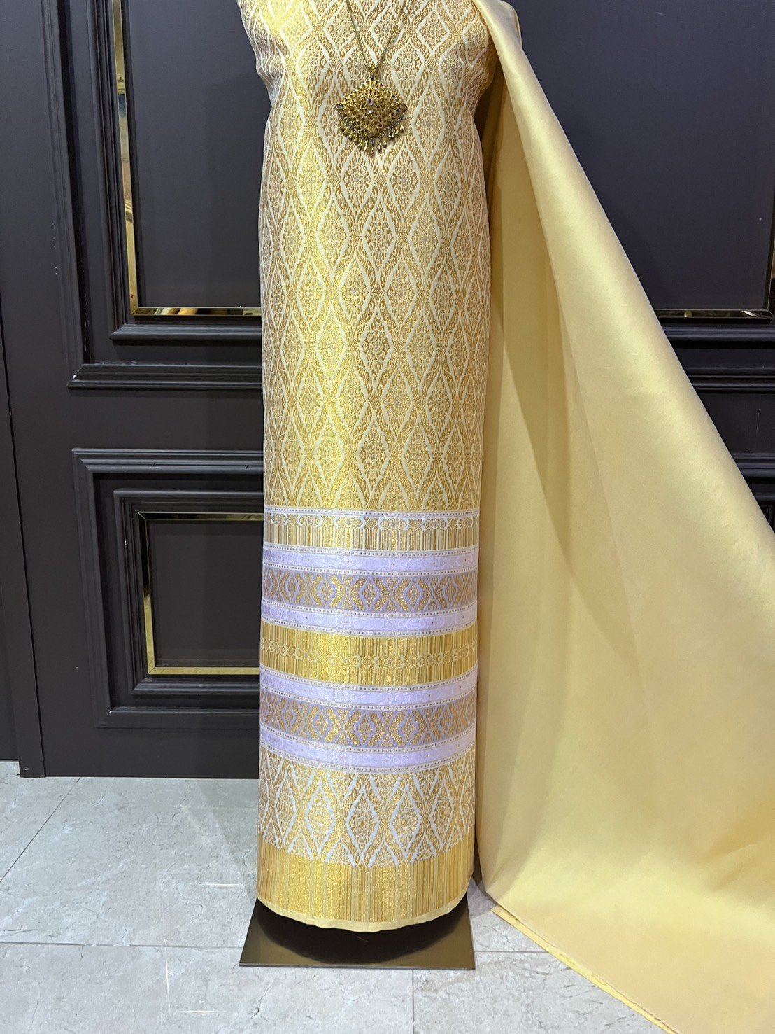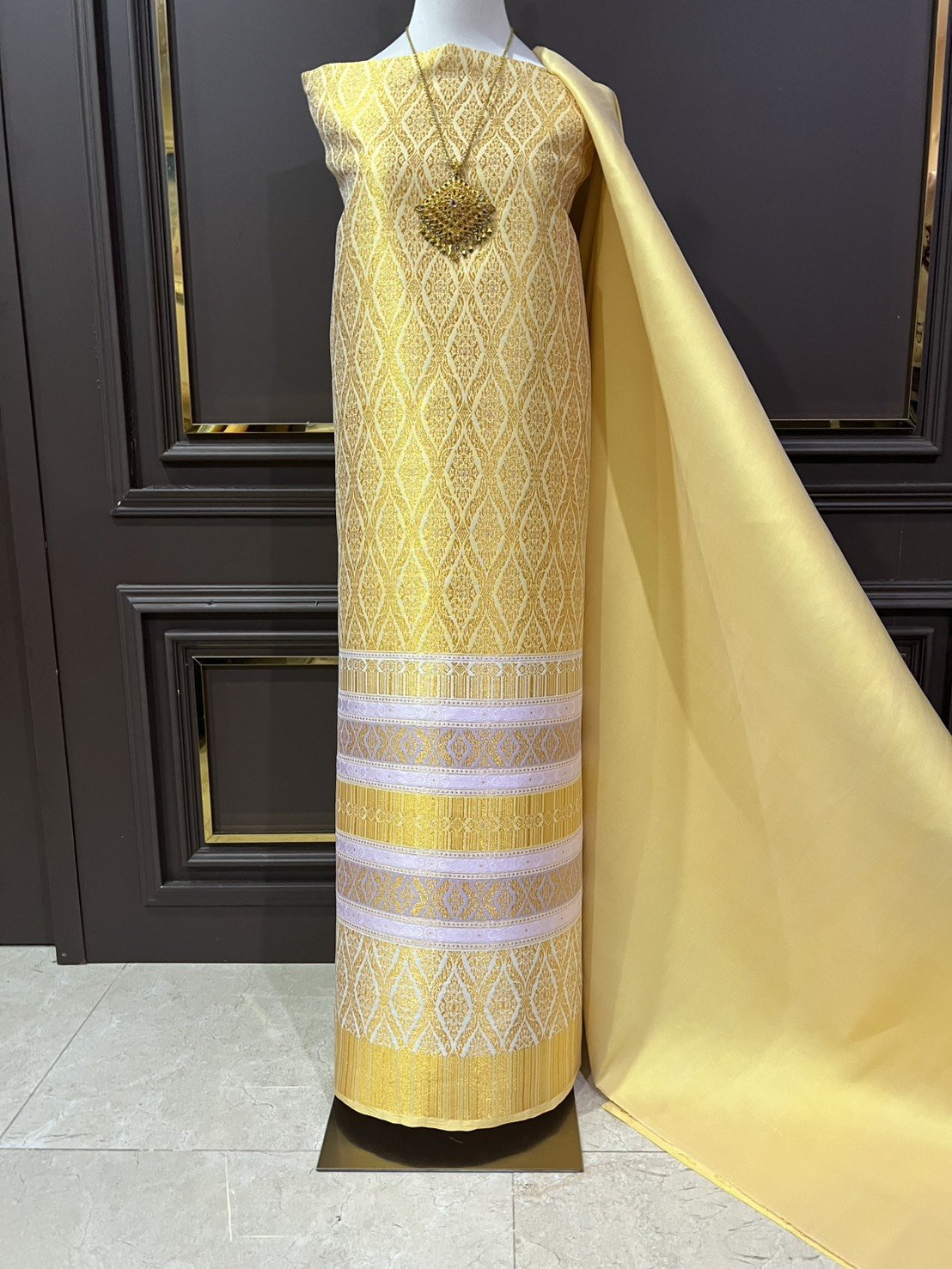 *มีตำหนิผ้าพื้น ลายเพชรรุ่งสุวรรณ ยกใหญ่ลำพูนสีเหลืองยกดอกดิ้นทอง