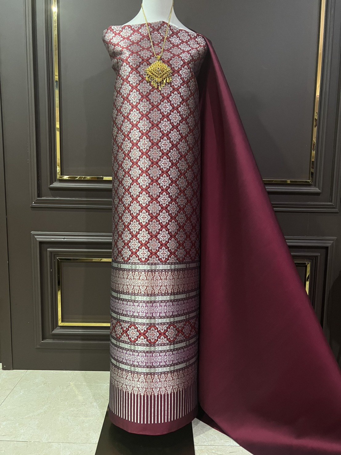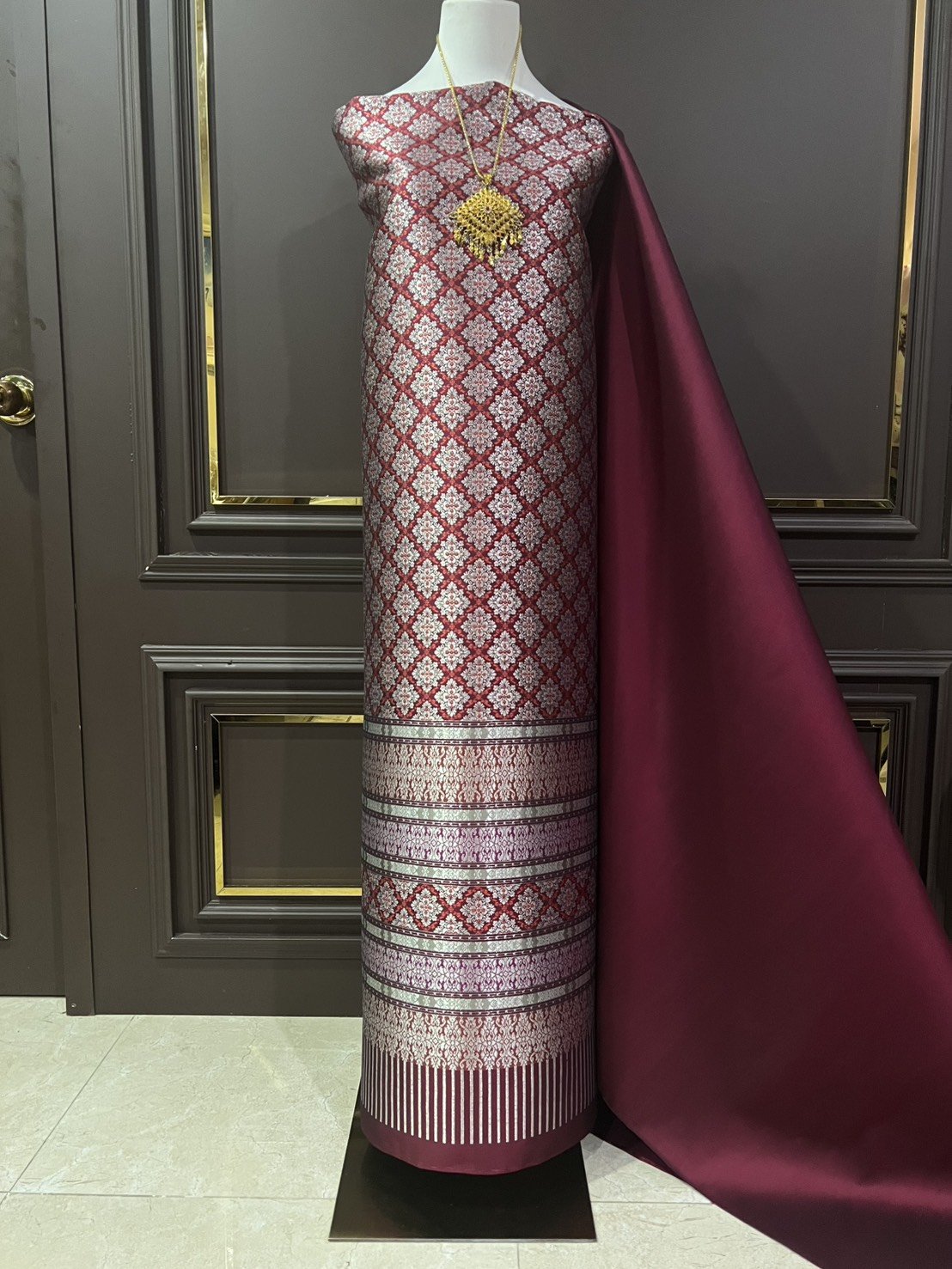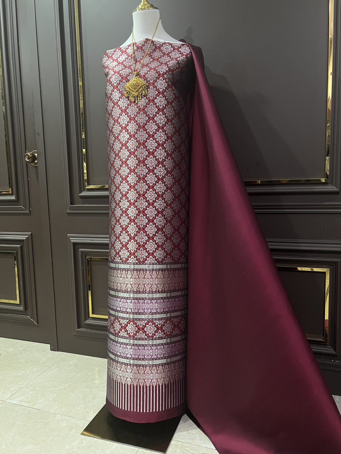 ลายบุปผาภิรมย์ ยกใหญ่ลำพูนสีแดงแยกกาบดิ้นเงินแยกดอกไหมสีแดง