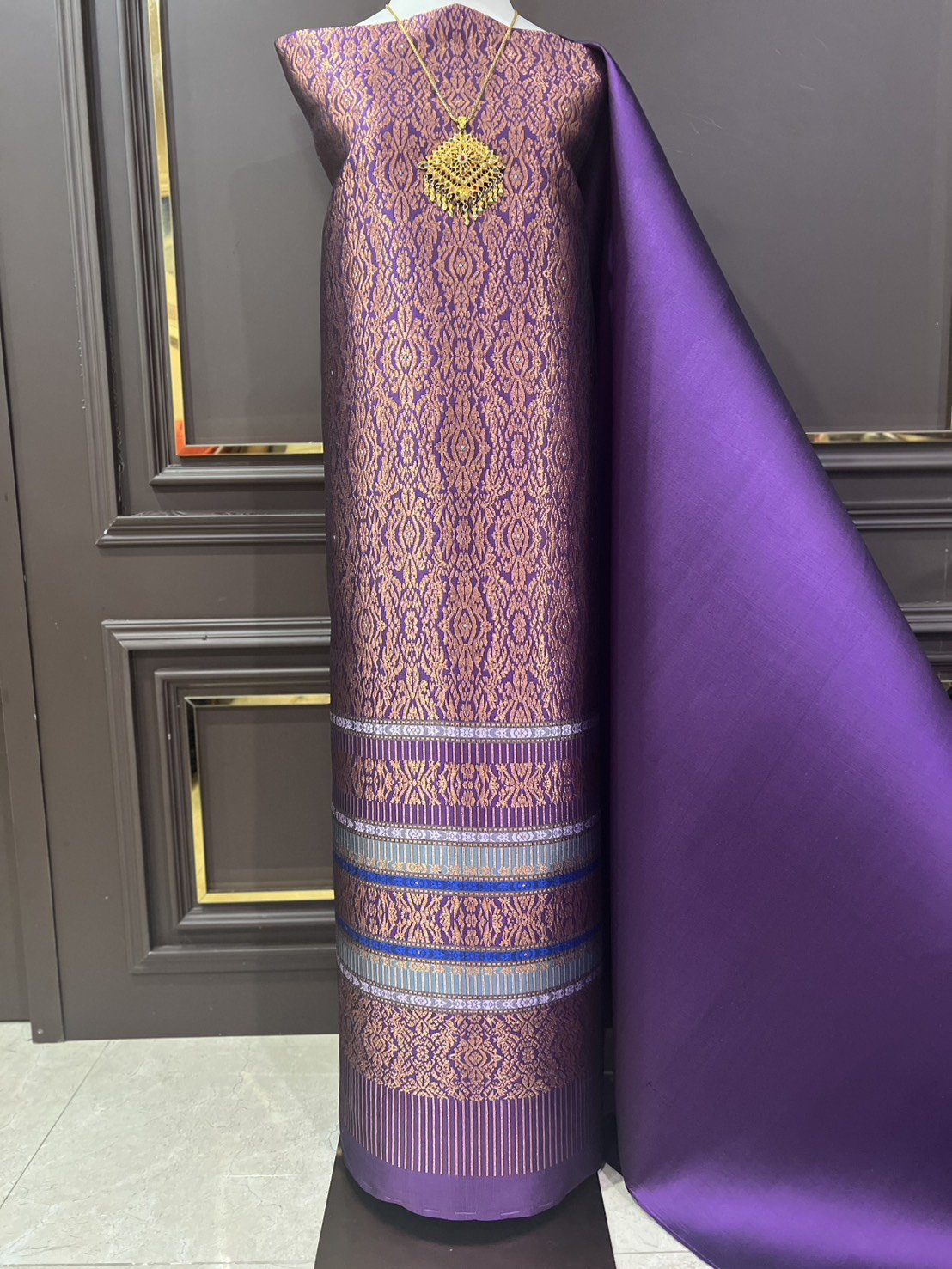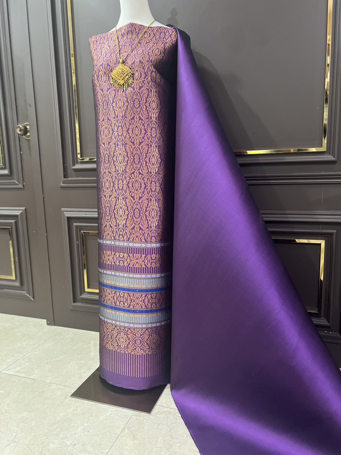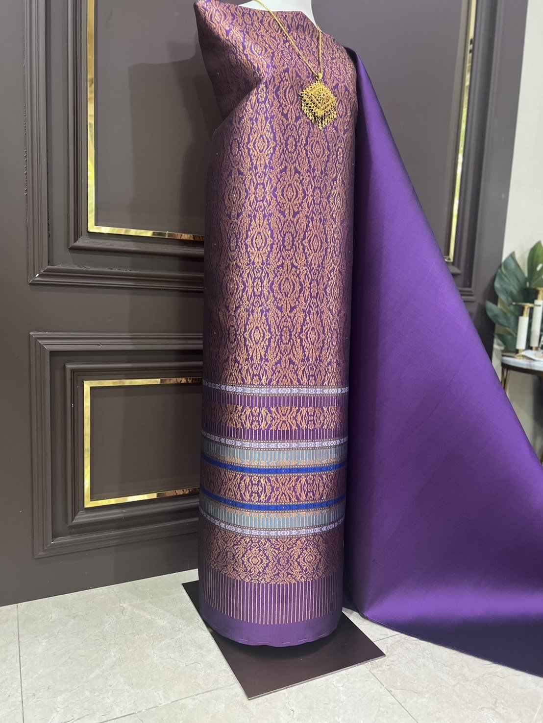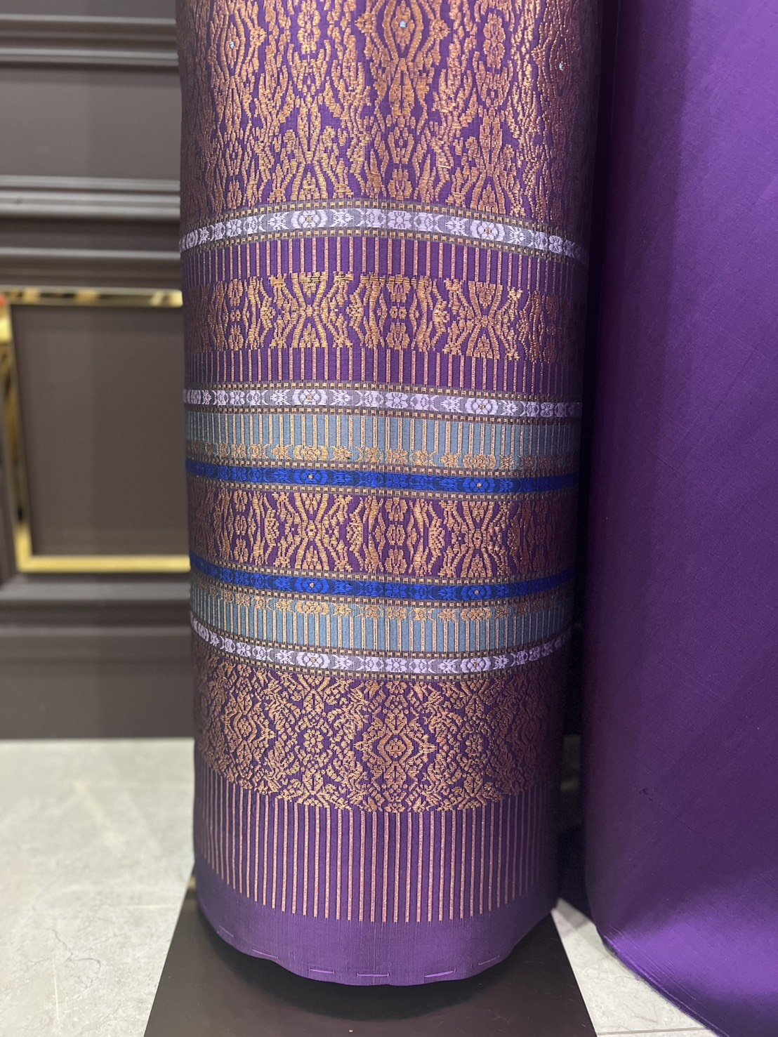 ลายอินเดีย ยกใหญ่ลำพูนสีม่วงพระเทพยกดอกดิ้นสีนาค