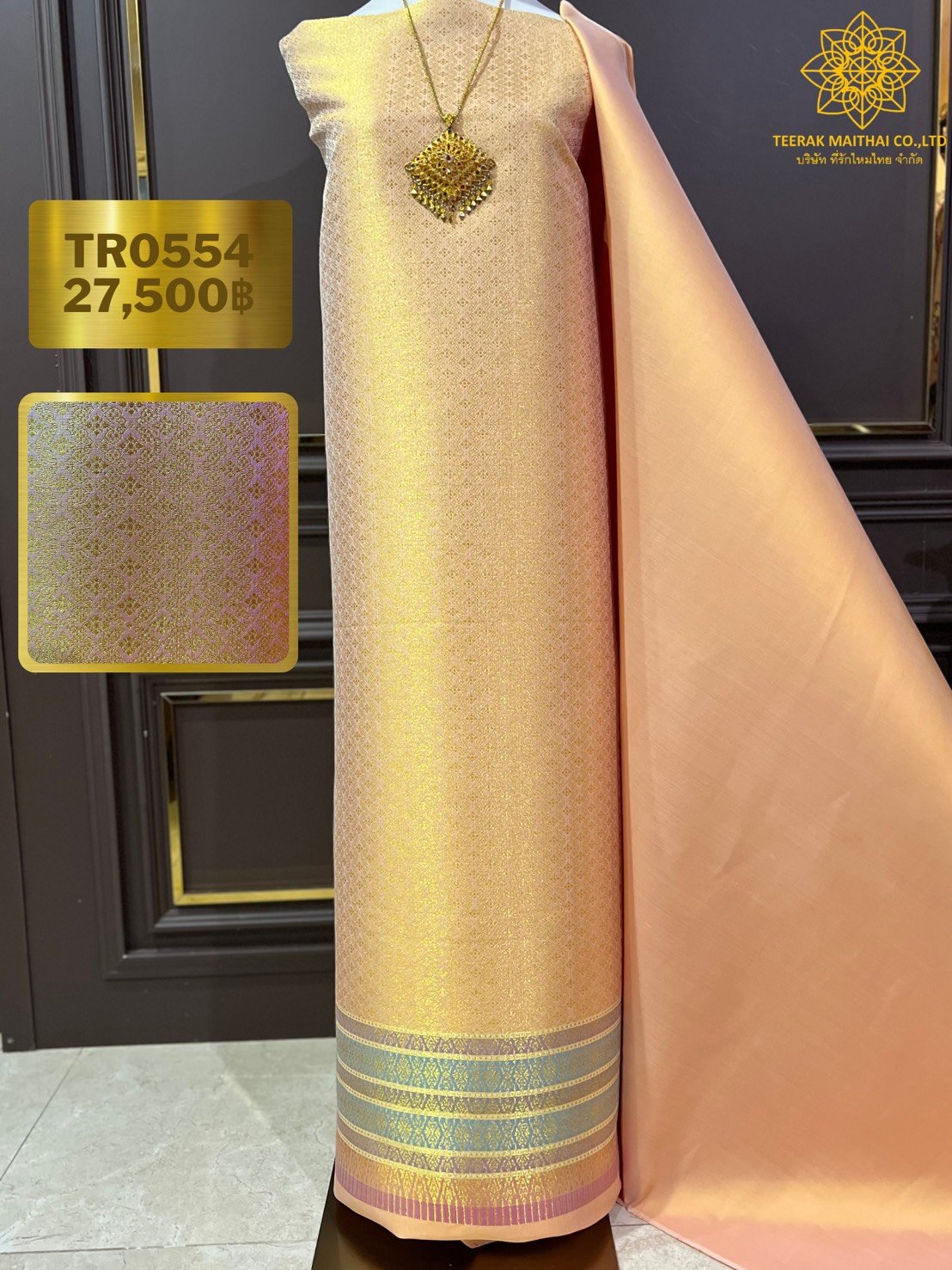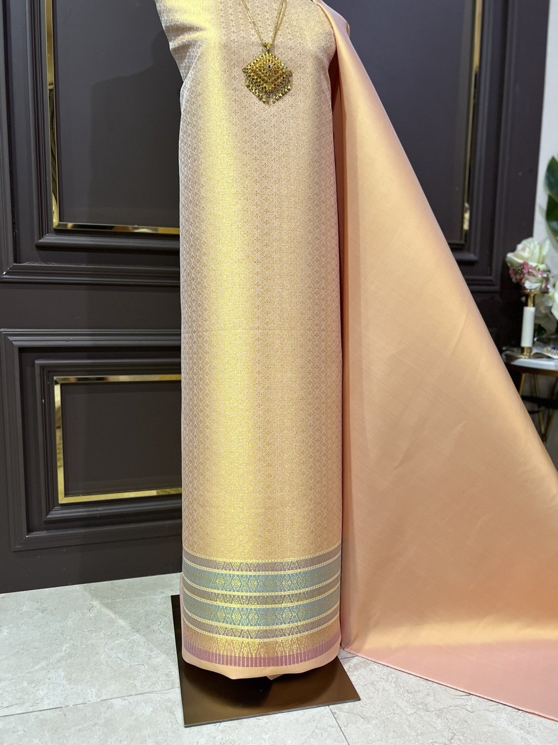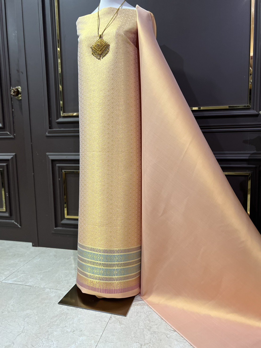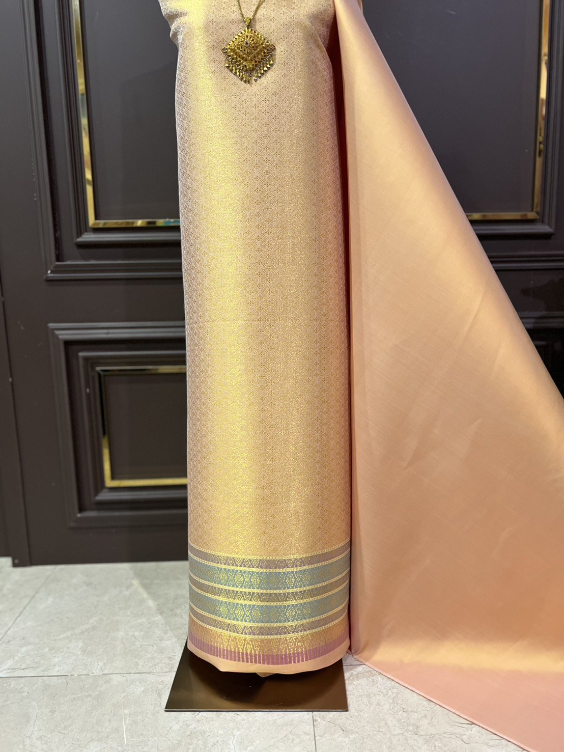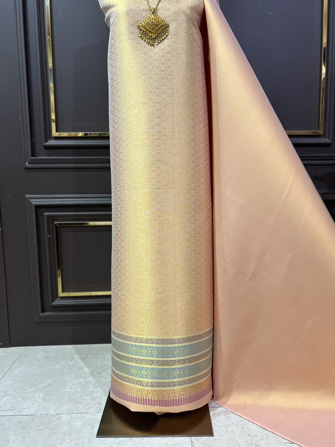 ลายพิกุลล้อมกรอบ ยกใหญ่ลำพูนสีชมพูหวานเกาะเชิงดิ้นทองสอดเกษรดิ้นทอง