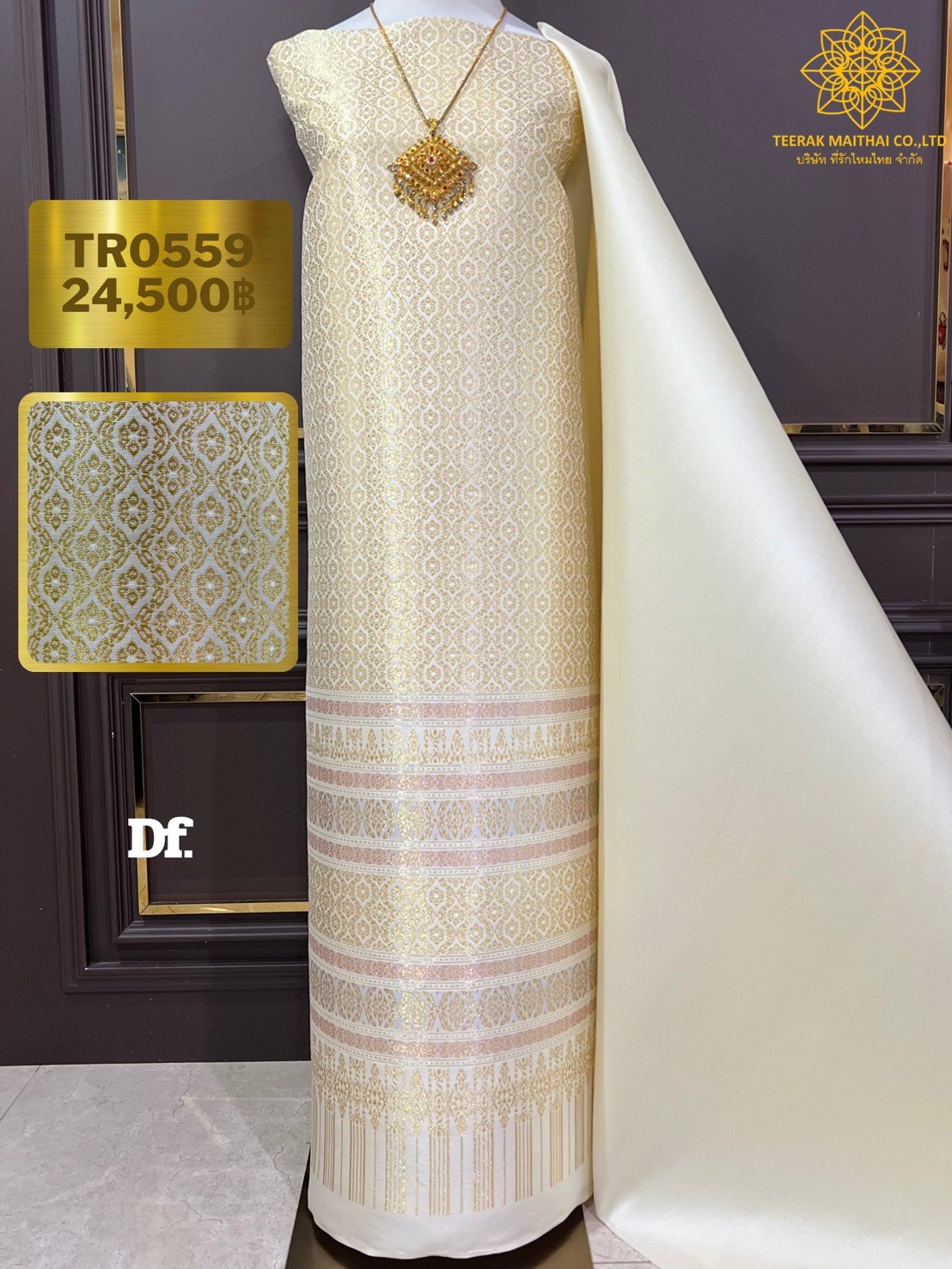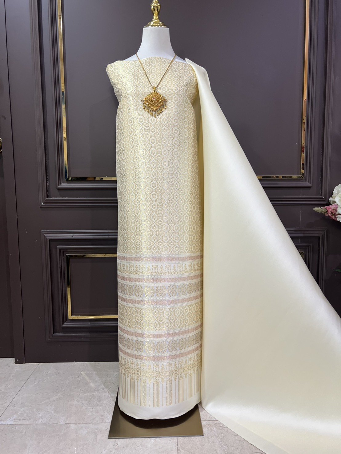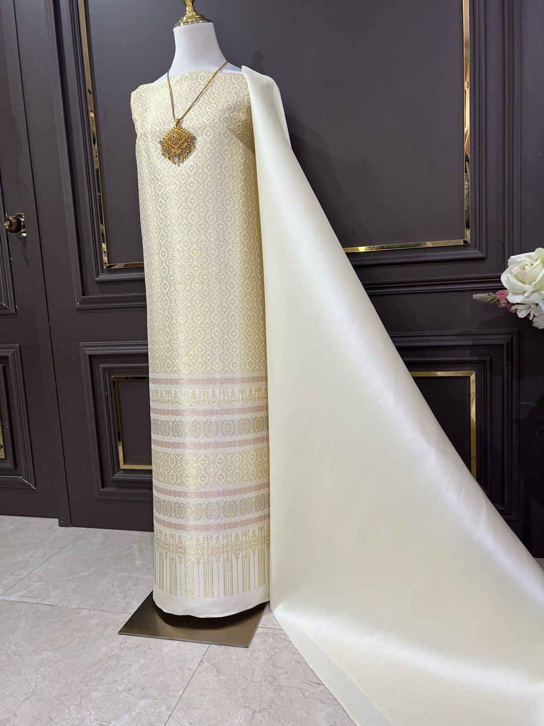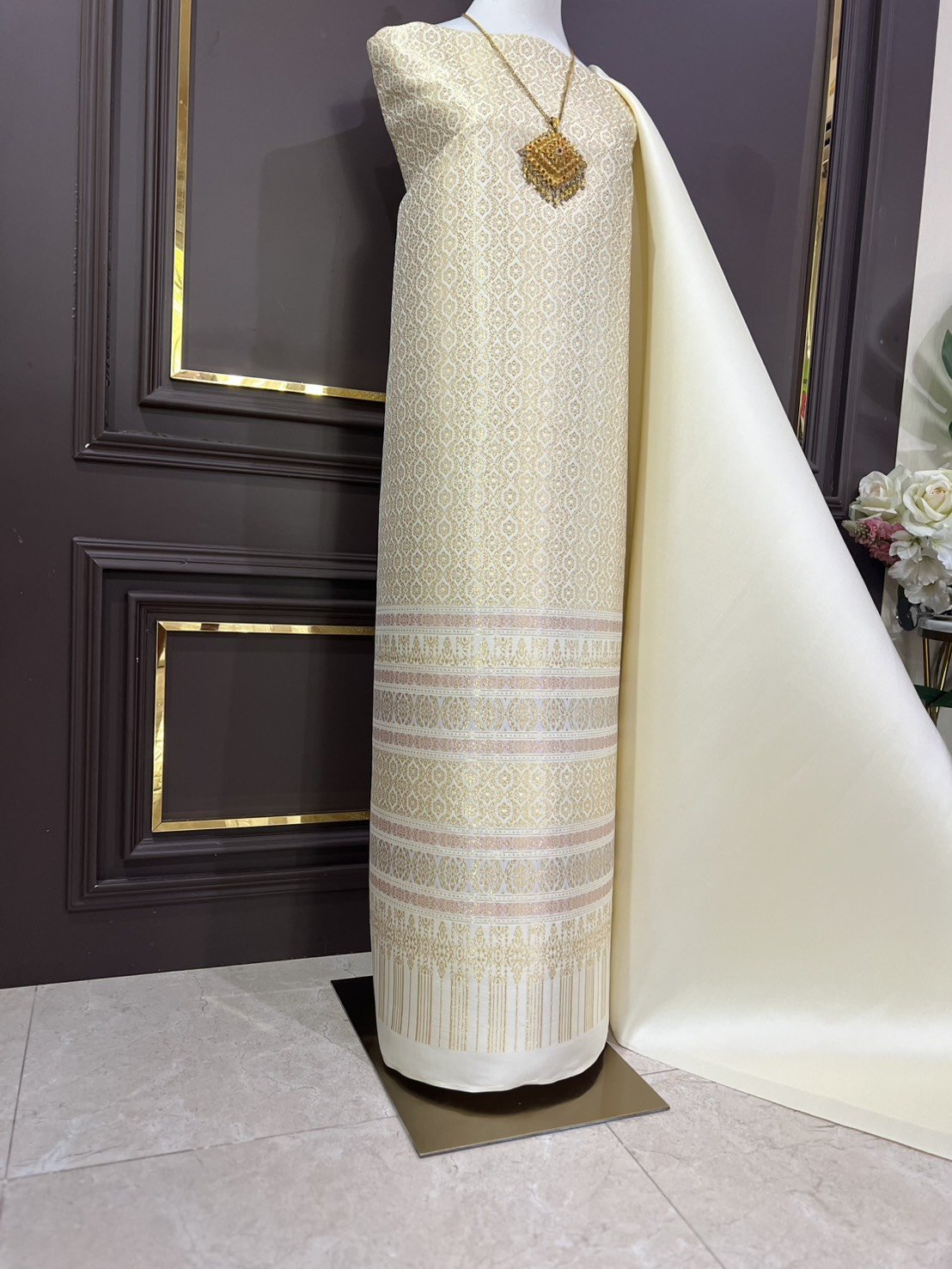 *มีตำหนิ ลายกระดังงา ยกใหญ่ลำพูนสีครีมอ่อนยกดอกดิ้นทอง