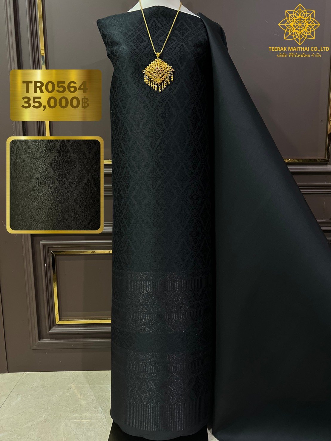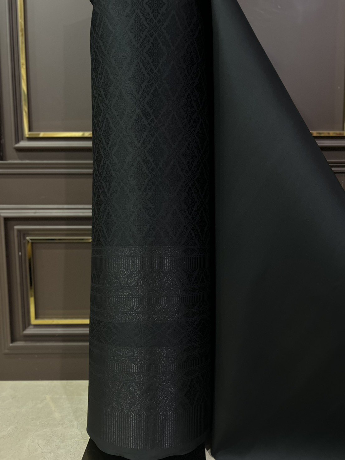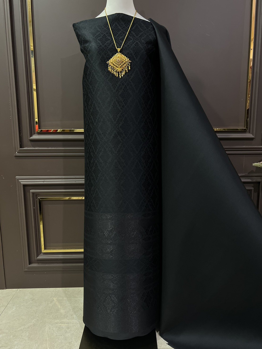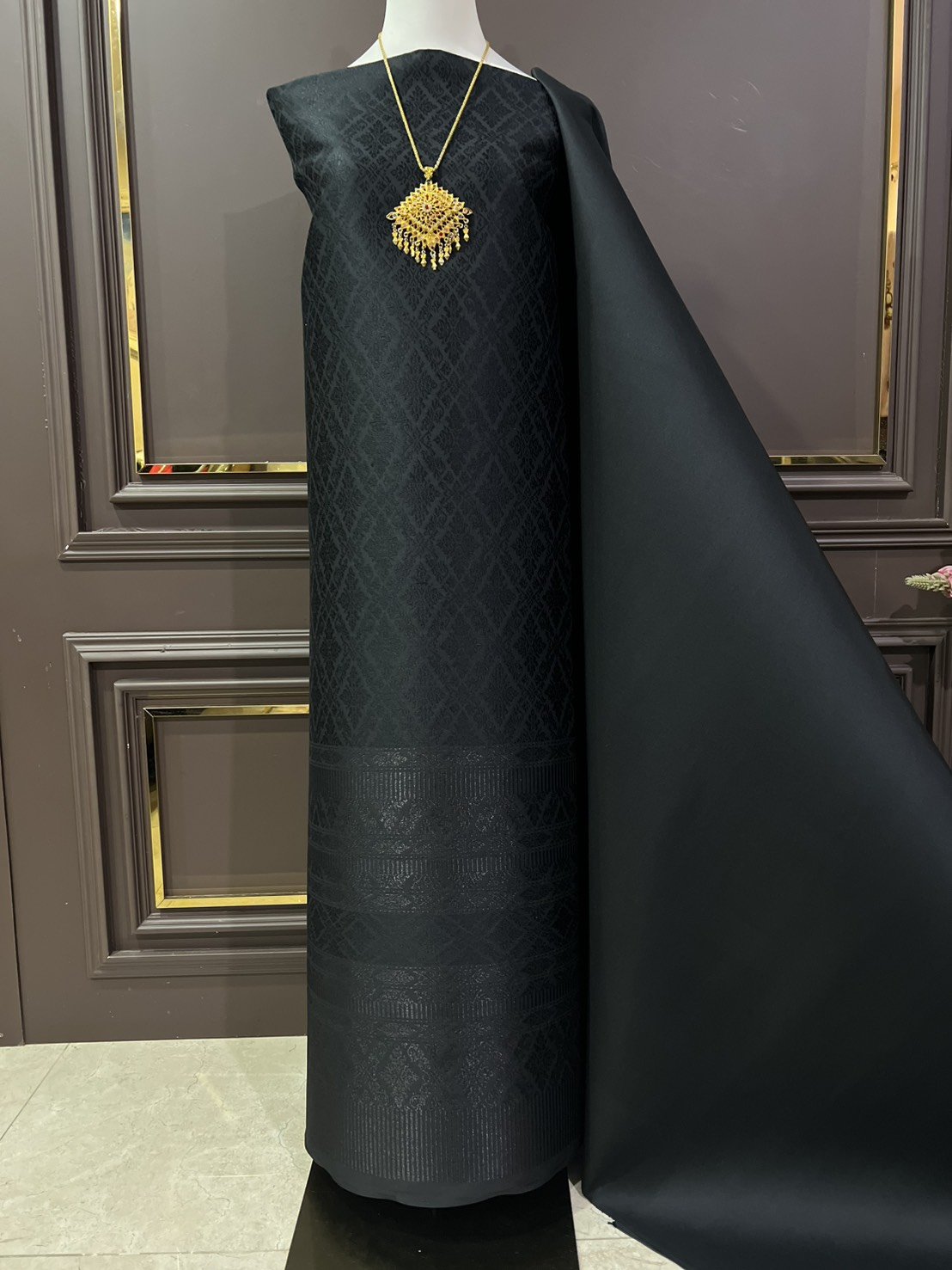 ลายราชสำนัก ยกใหญ่ลำพูนสีดำเกาะเชิงดิ้นดำ