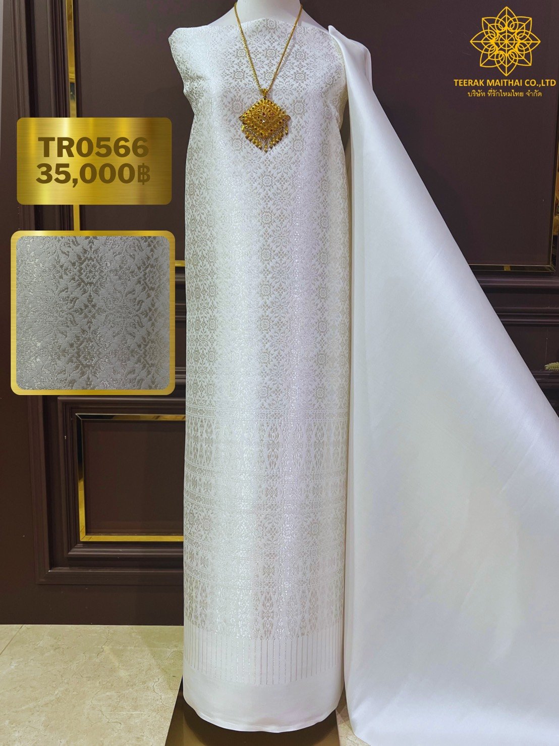 ลายแก้วกาหลง ยกใหญ่ลำพูนสีขาวออฟไวท์เกษรดิ้นเงินเกาะเชิงดิ้นเงิน