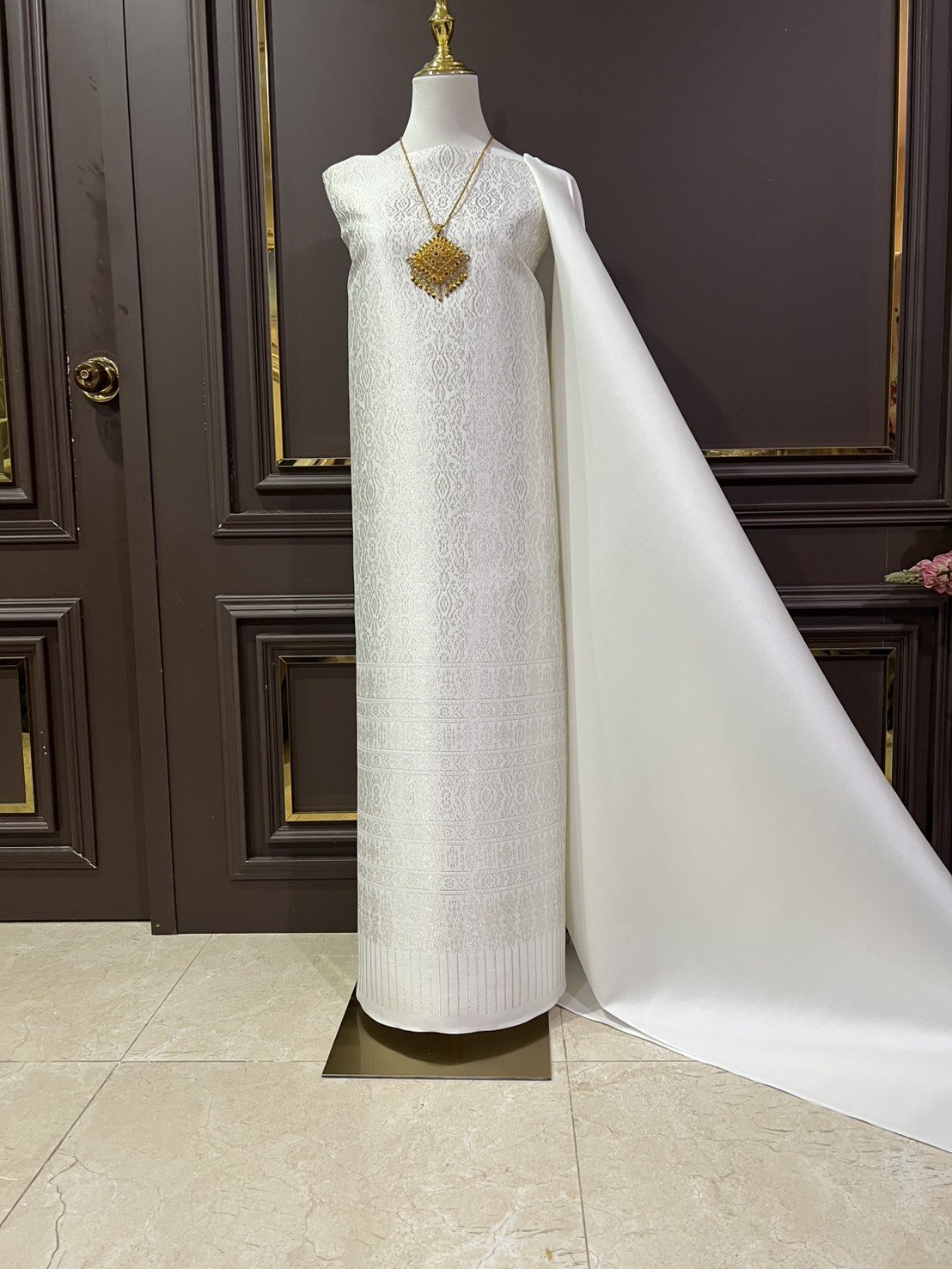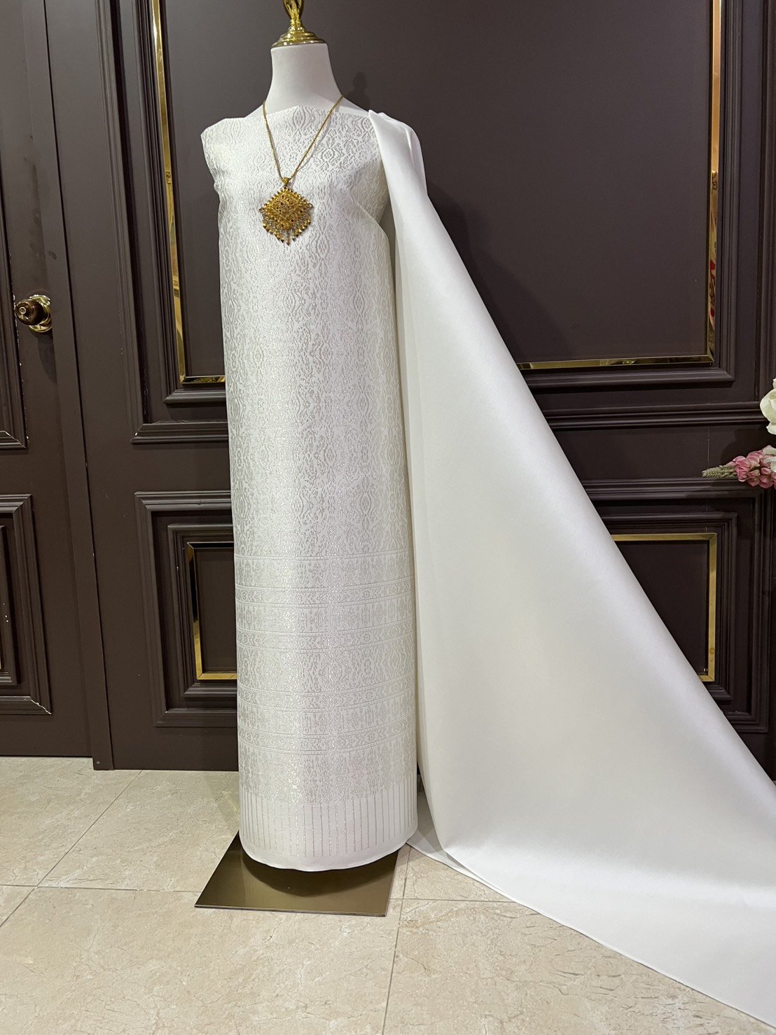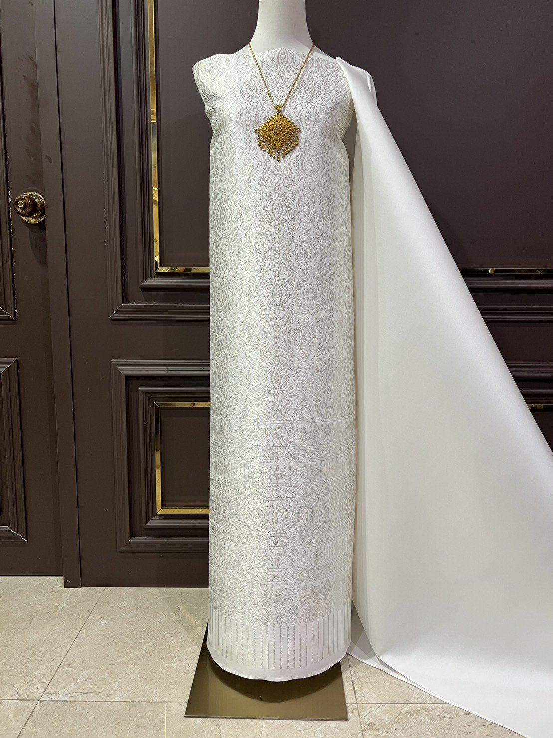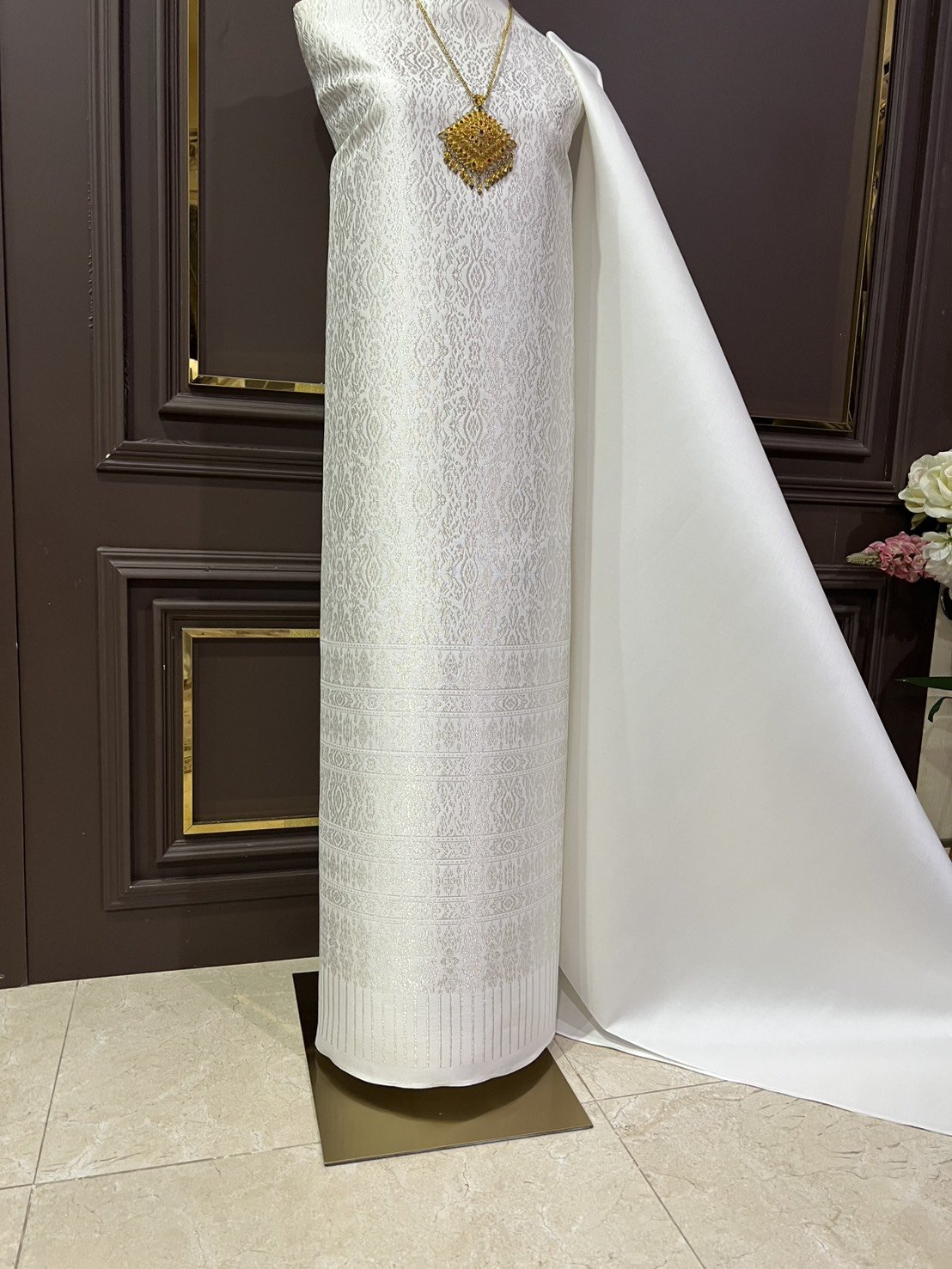 ลายพิกุลพราว ยกใหญ่ลำพูนสีขาวออฟไวท์เกาะเชิงดิ้นเงินสอดเกษรดิ้นเงิน