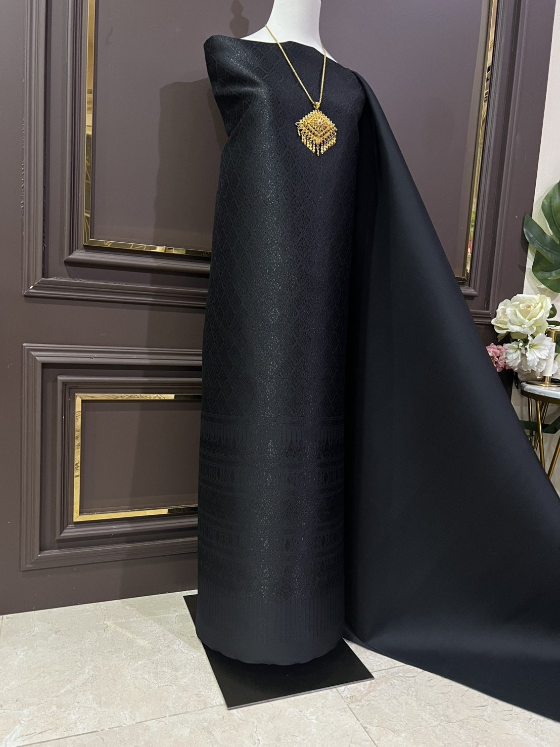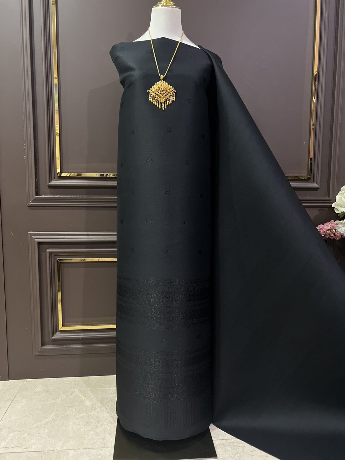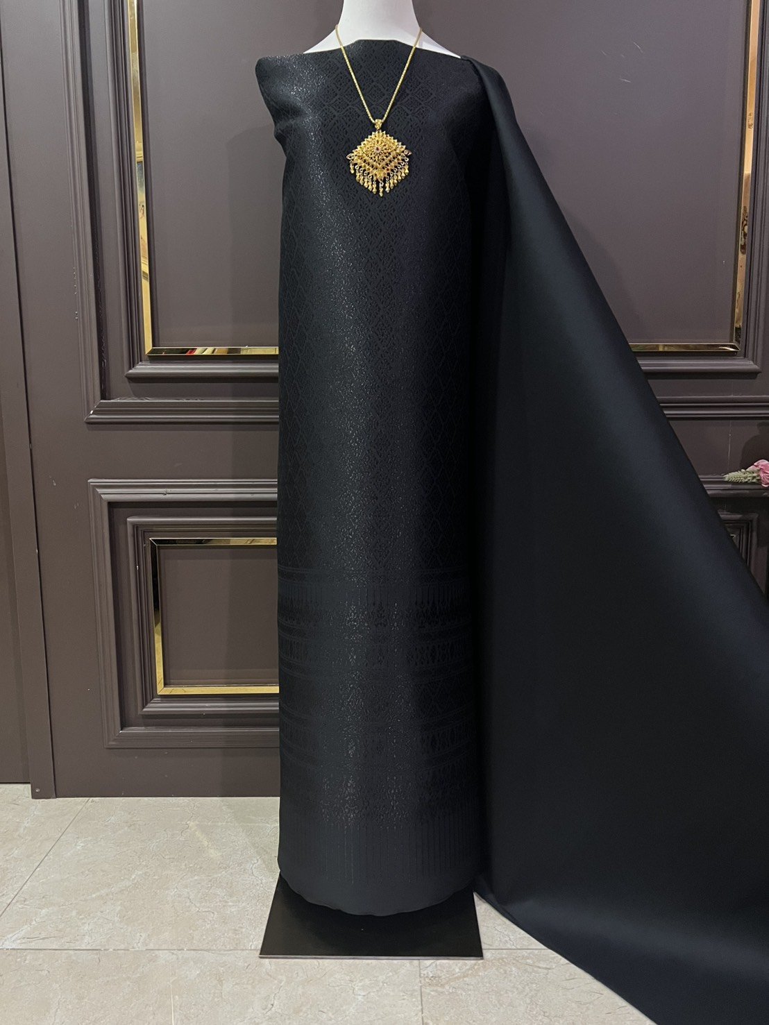 ลายพิกุลจักรดา ผ้าไหมลำพูนสีดำดิ้นทอง ประเภทยกดอกลอย