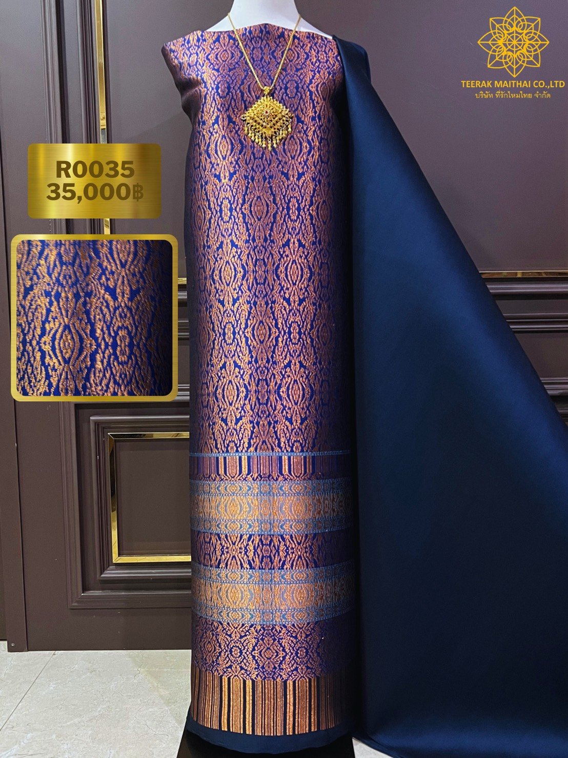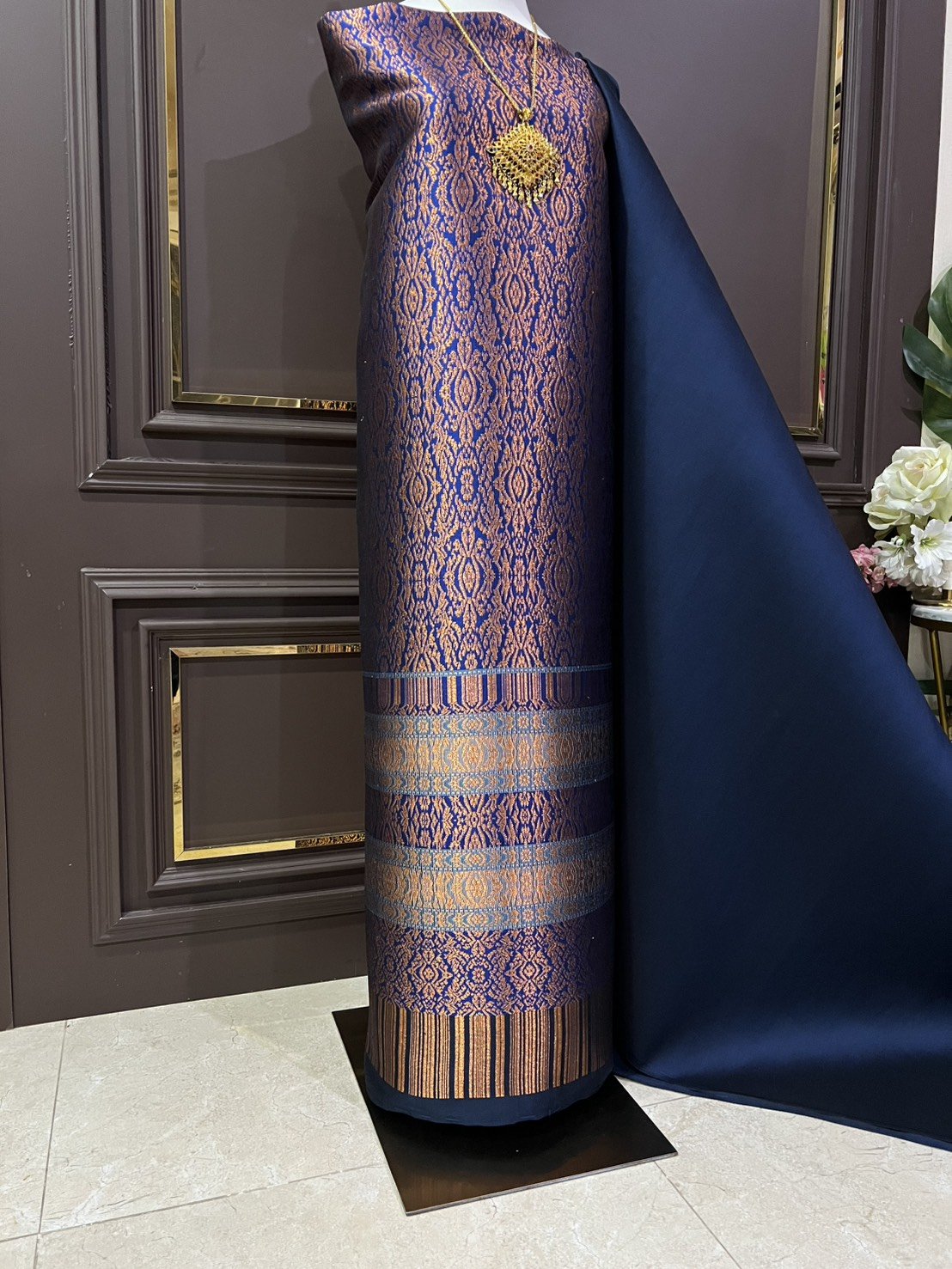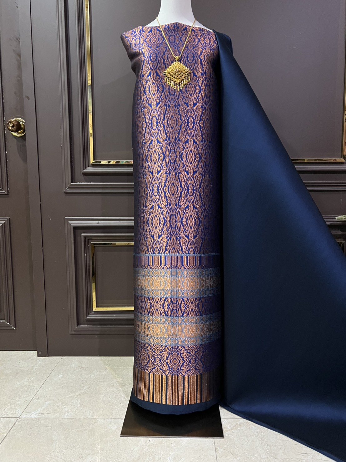 ผ้าไหมยกดอกลำพูนสีกรมยกดิ้นสีนาค