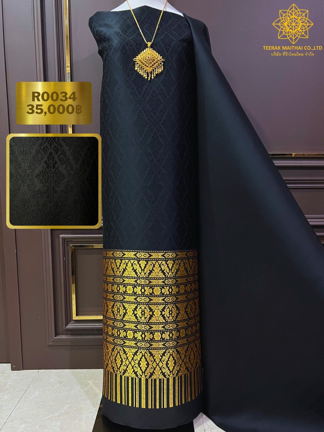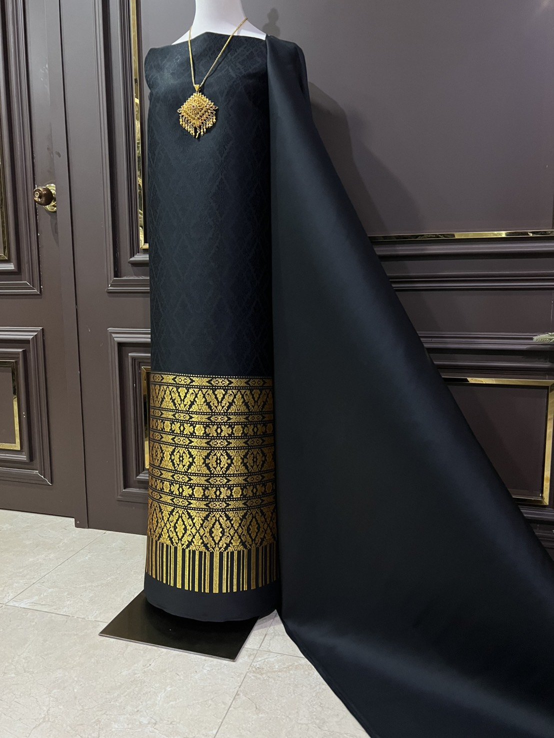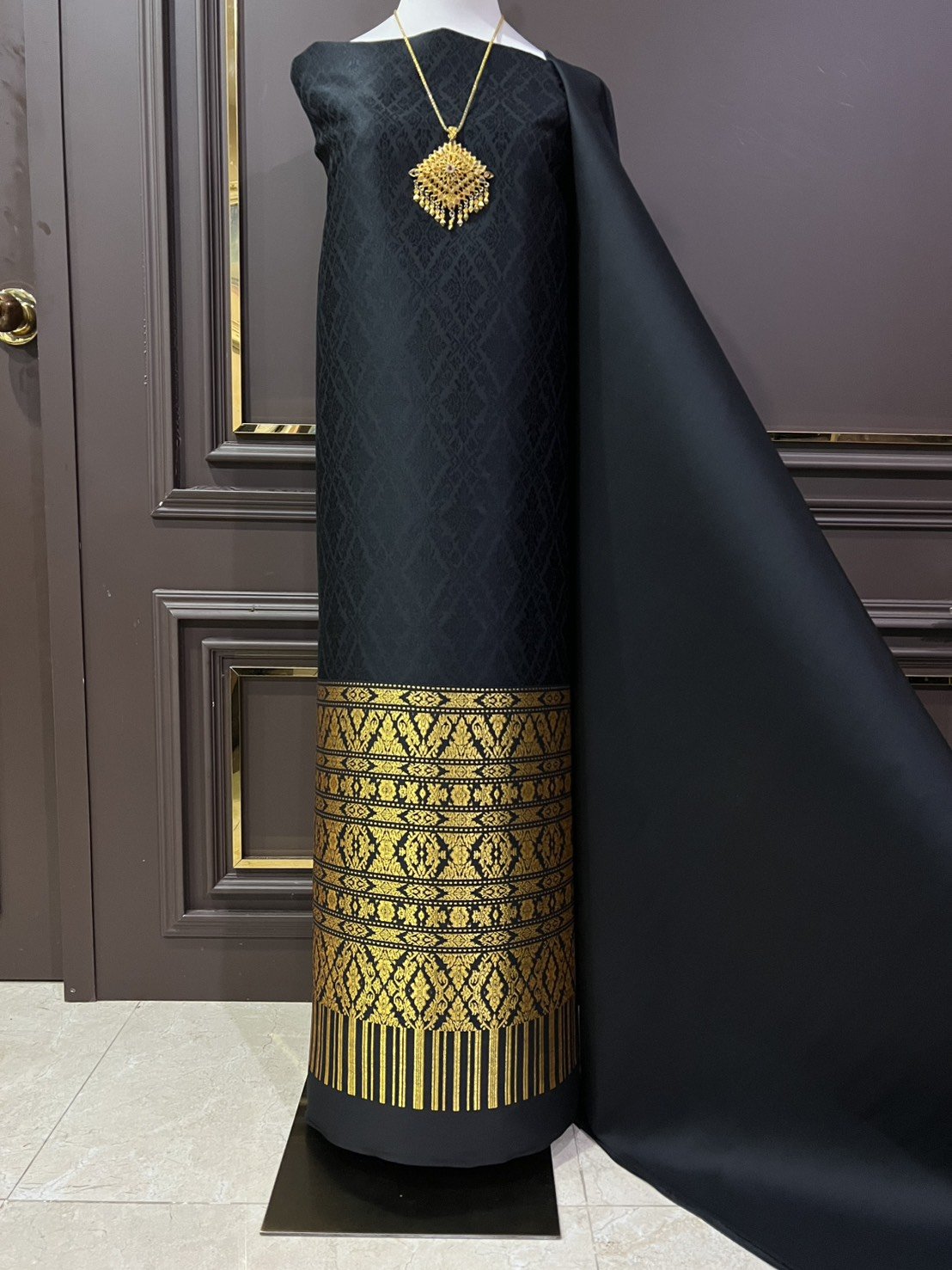 ผ้าไหมยกดอกลำพูนสีดำเชิงดิ้นทอง