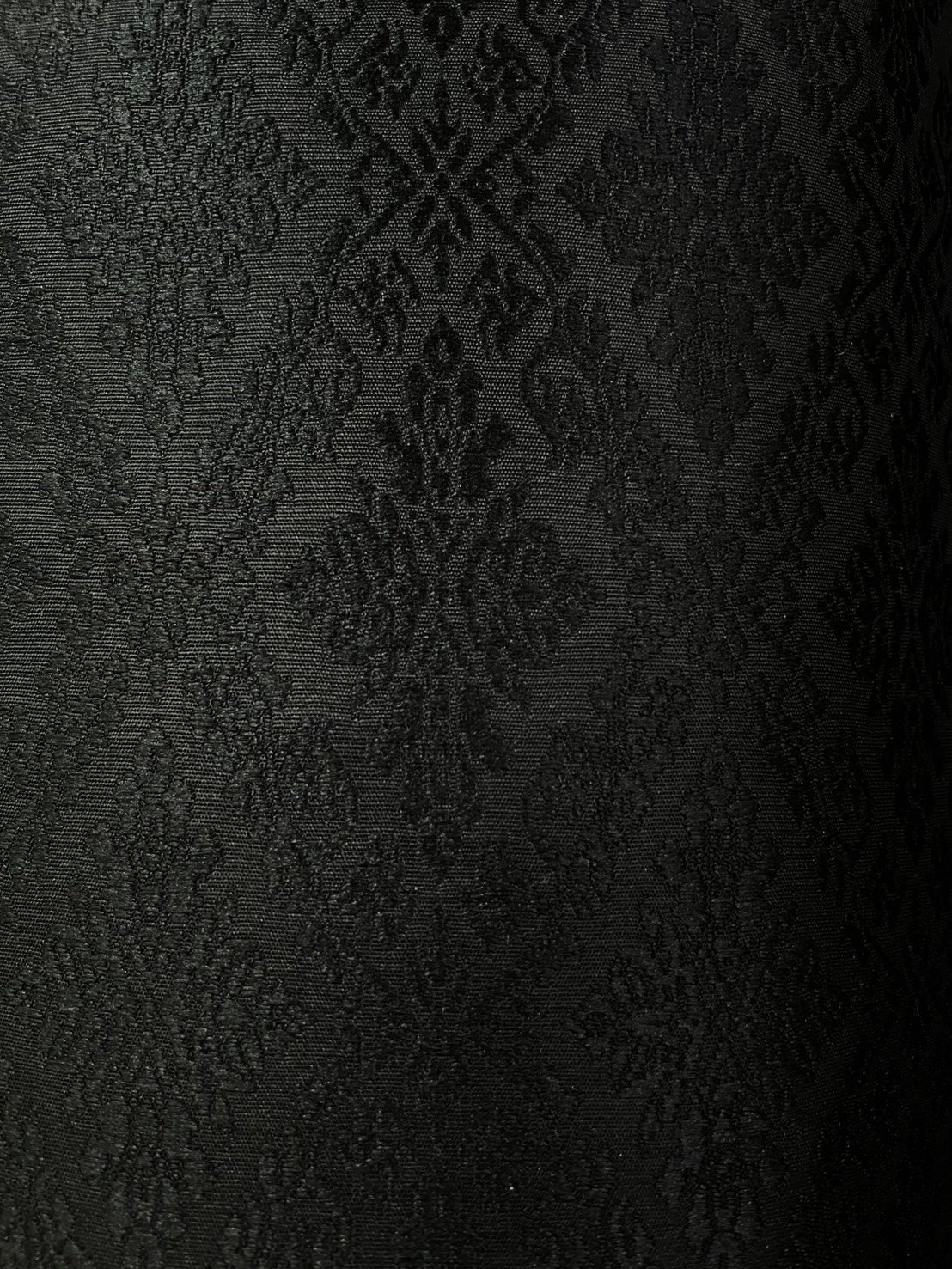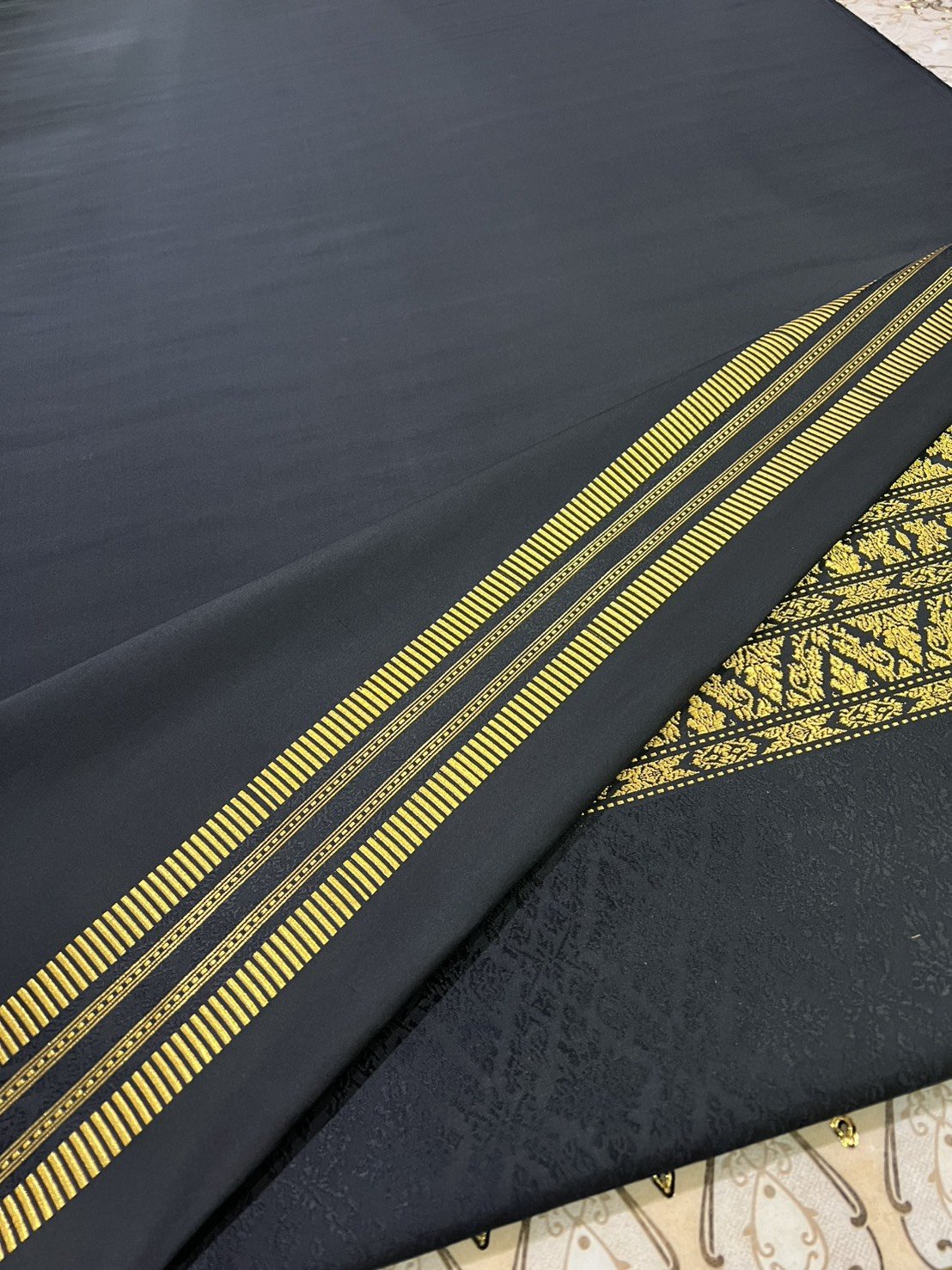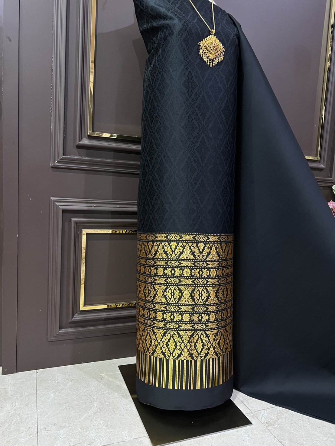 ลายราชสำนัก ผ้าไหมยกดอกลำพูนสีดำเกาะเชิงดิ้นทอง