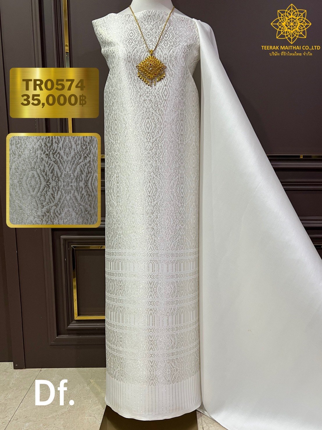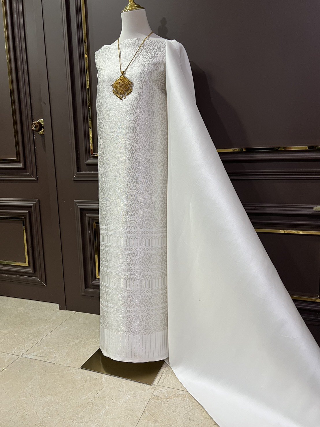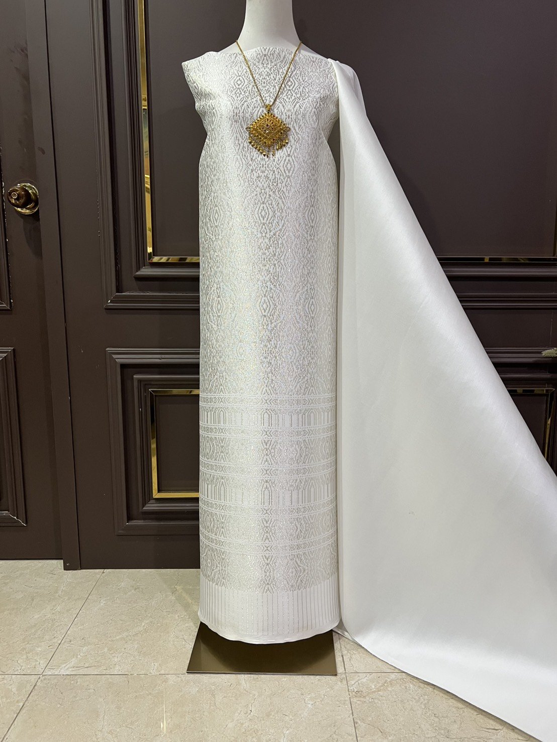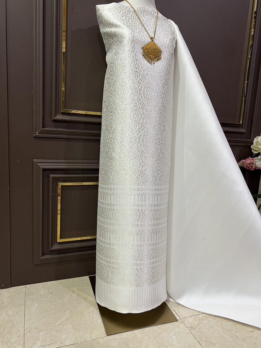 ลายพระราชสำนัก ยกใหญ่ลำพูนสีขาวออฟไวท์เกาะเชิงดิ้นเงินดอกข้อดิ้นทอง