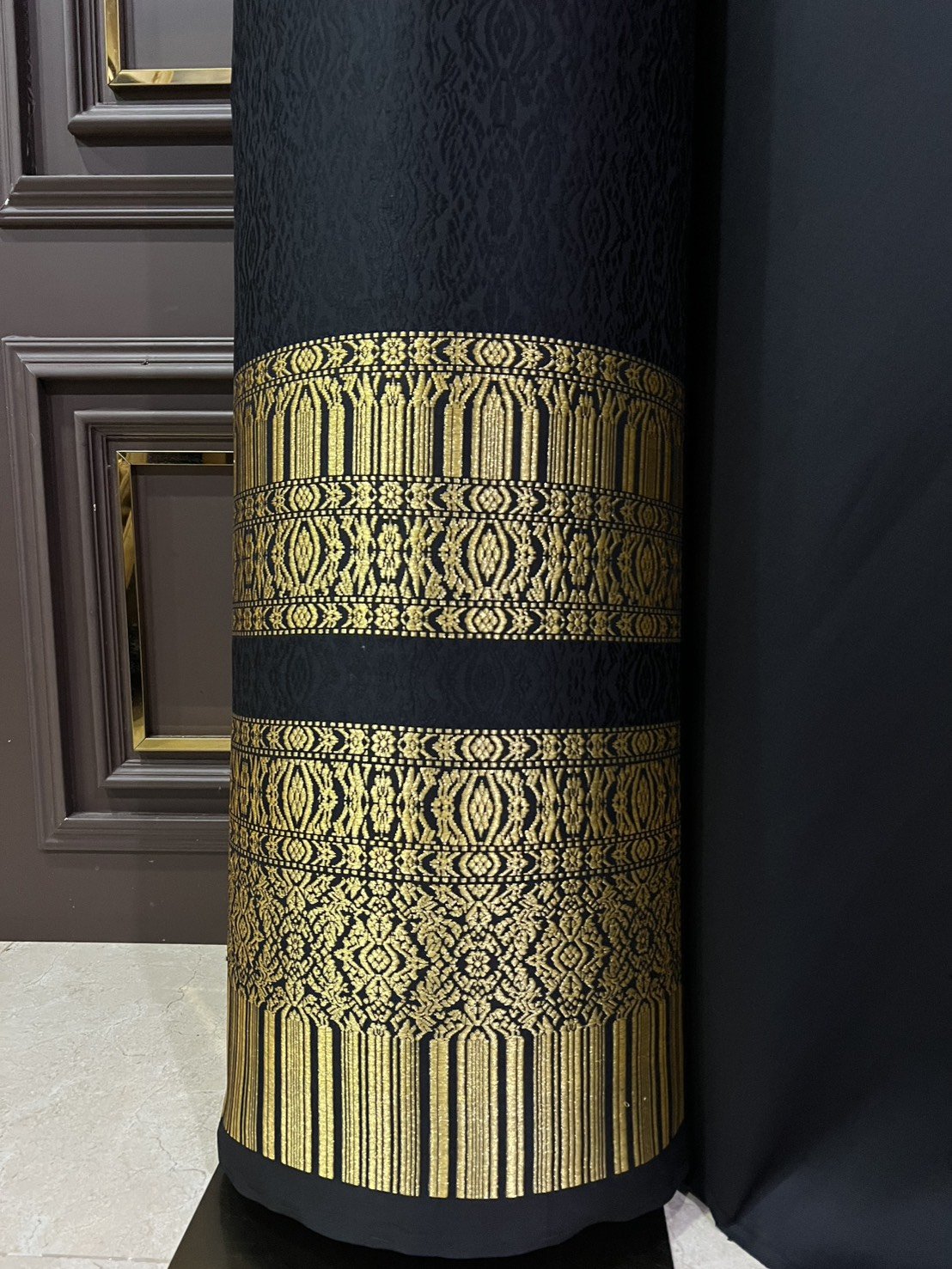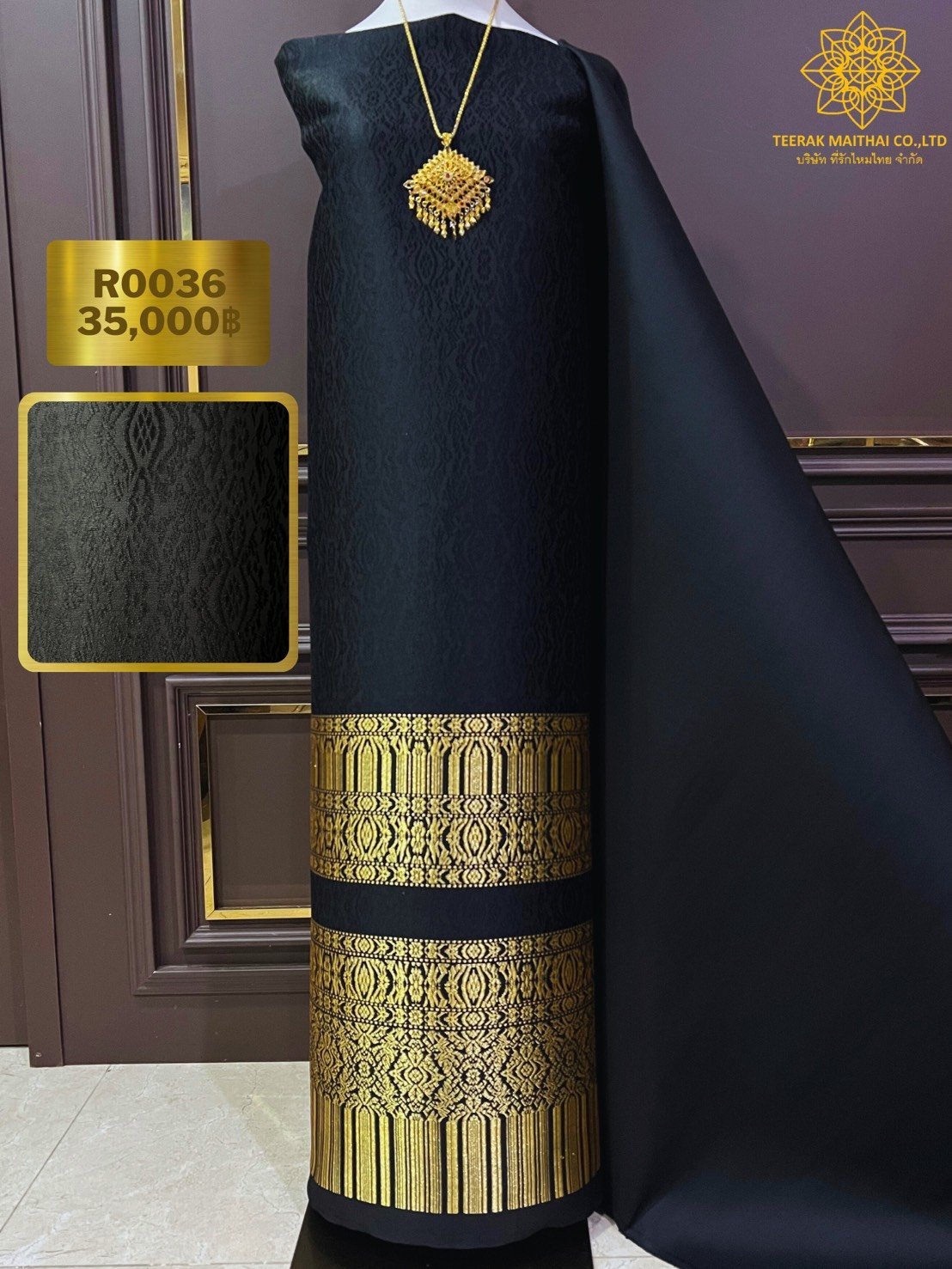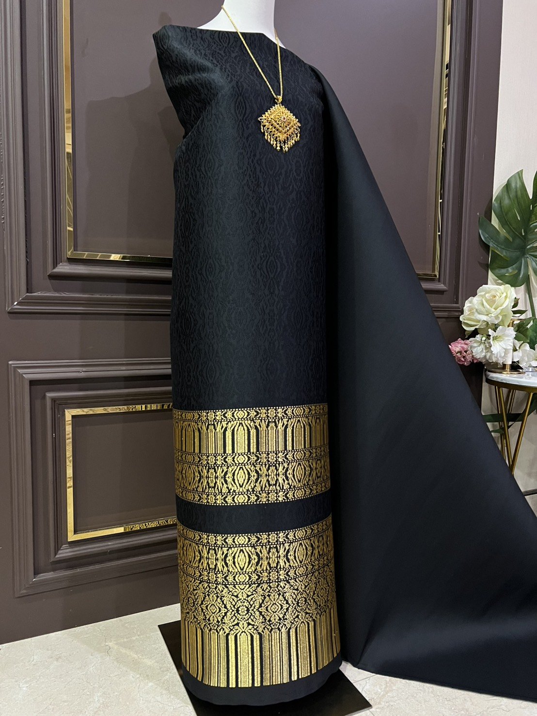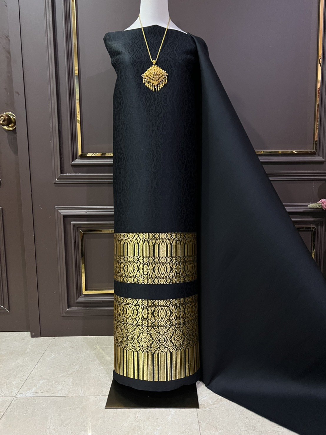 ผ้าไหมลำพูนสีดำเชิงดิ้นทอง