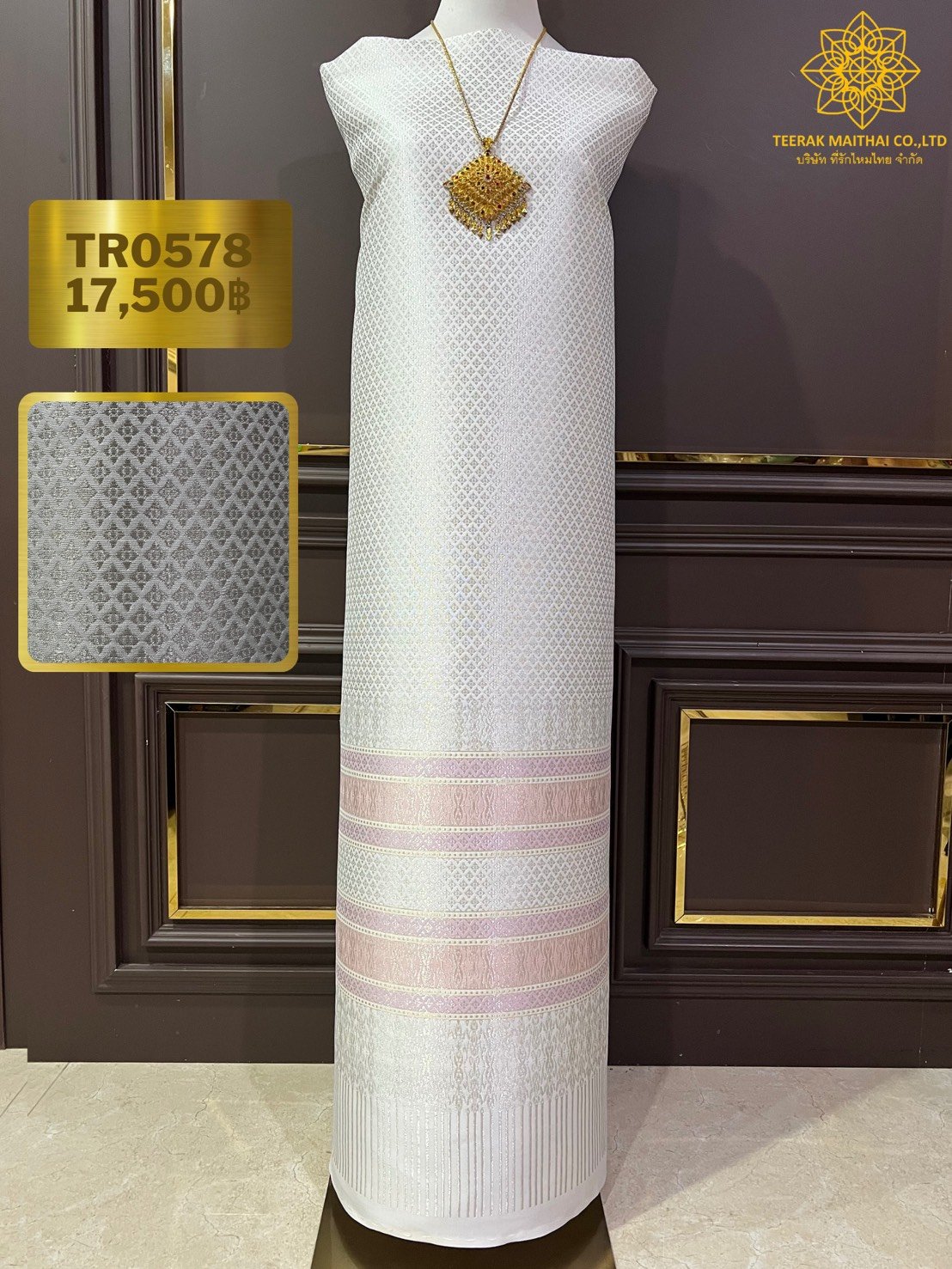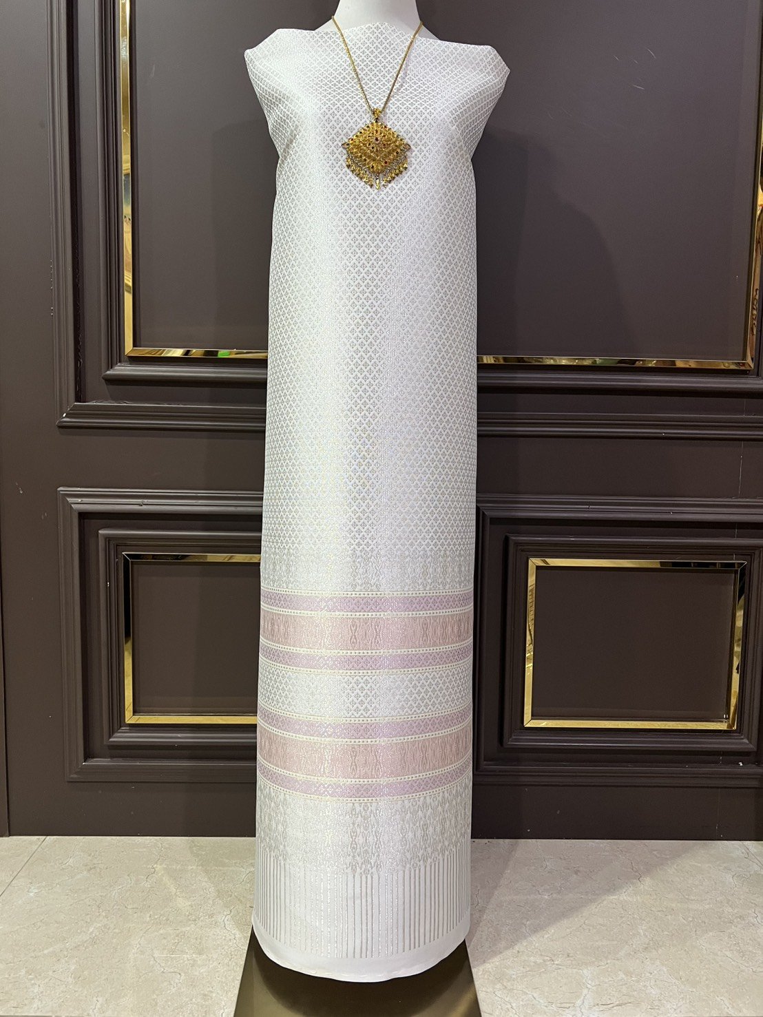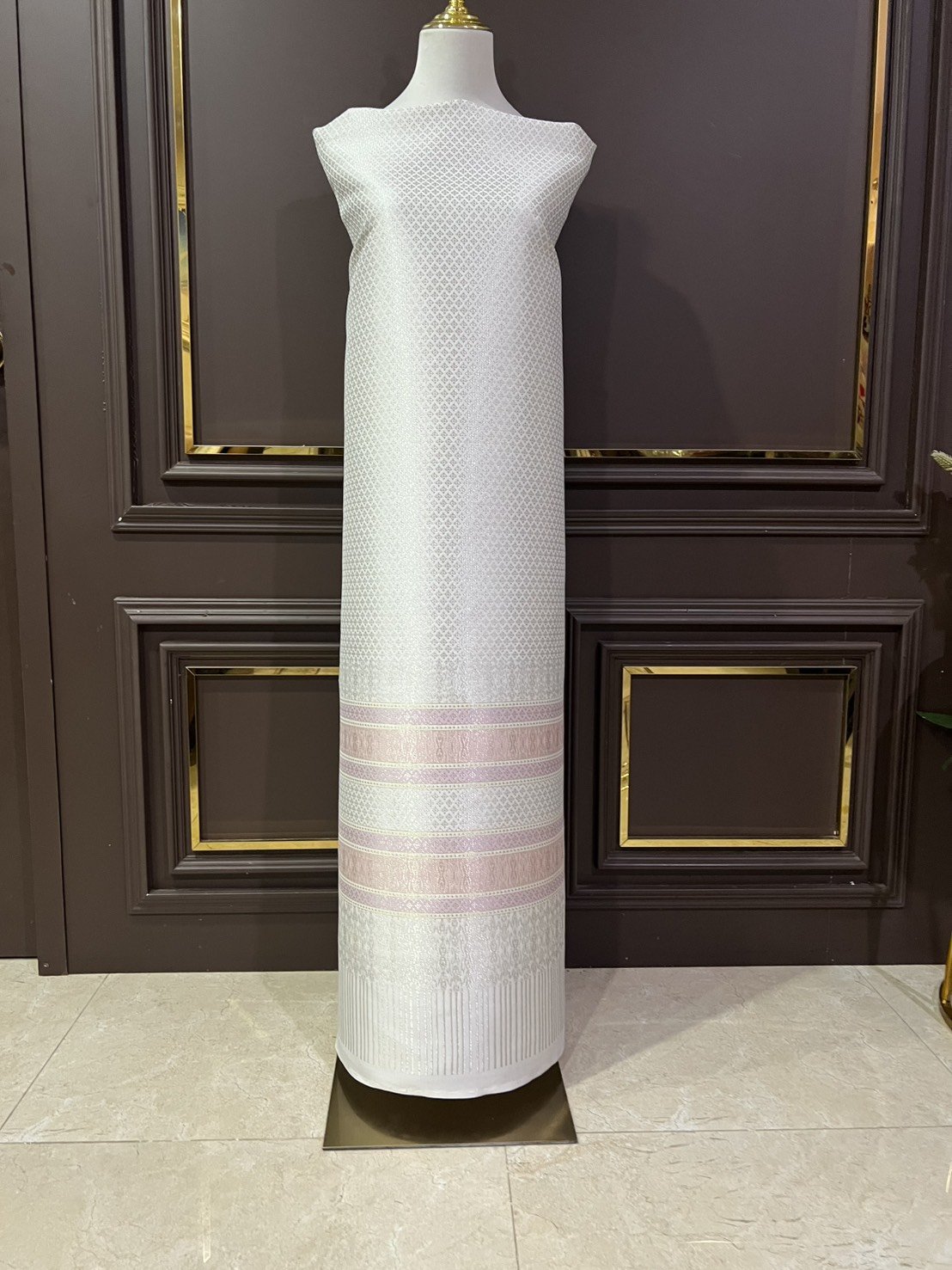 ลายพระราชสำนัก ยกใหญ่ลำพูนสีขาวออฟไวท์เกาะเชิงดิ้นเงินดอกข้อดิ้นทอง