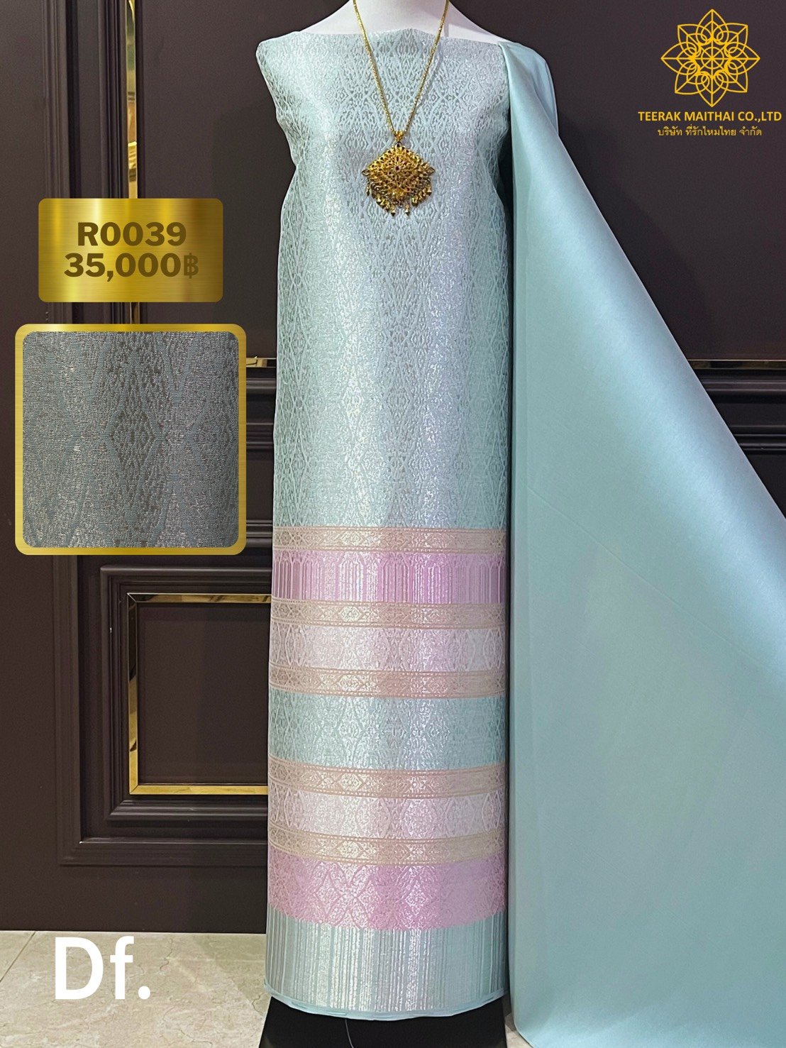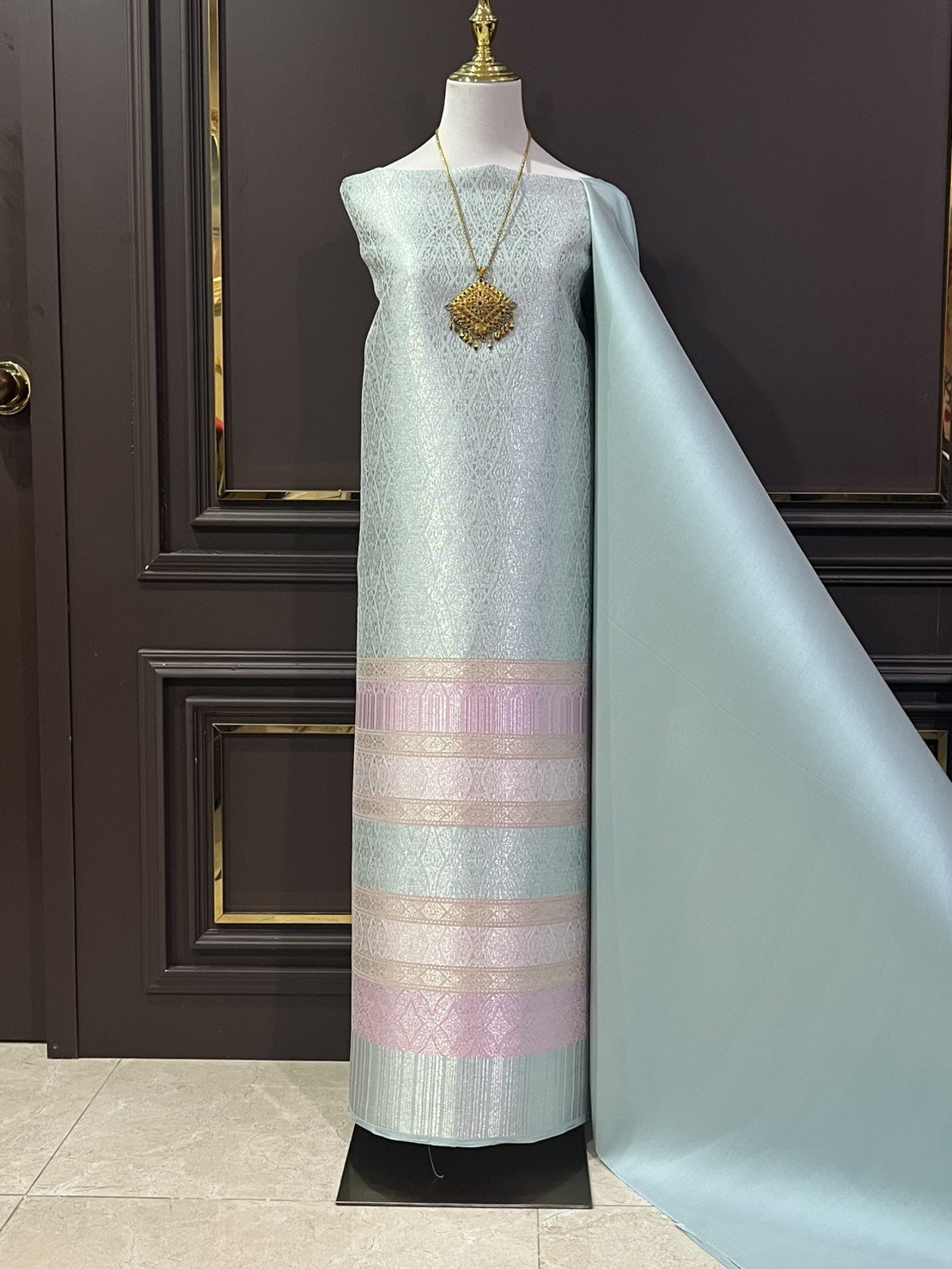 ลายพระราชสำนัก ยกใหญ่ลำพูนสีขาวออฟไวท์เกาะเชิงดิ้นเงินดอกข้อดิ้นทอง