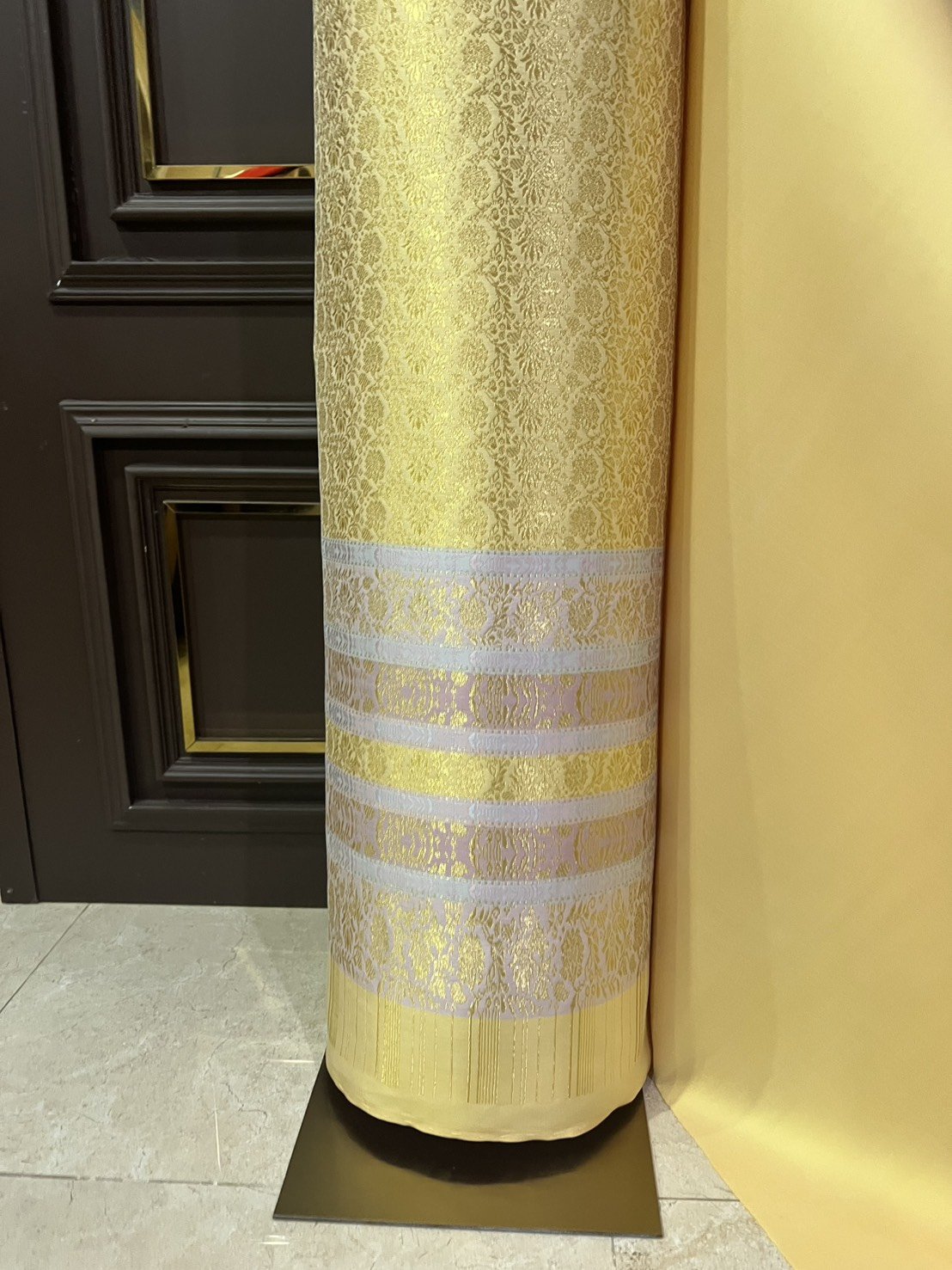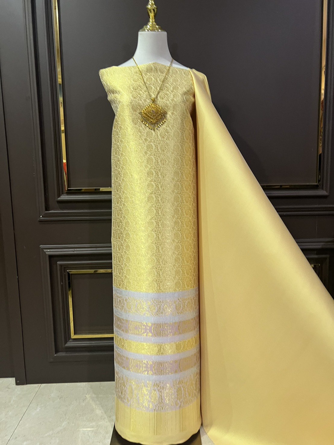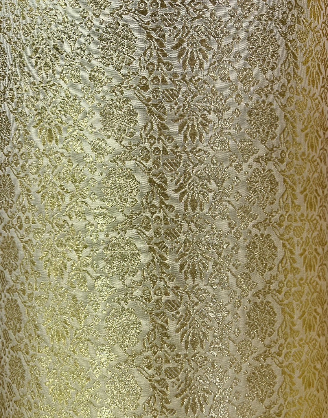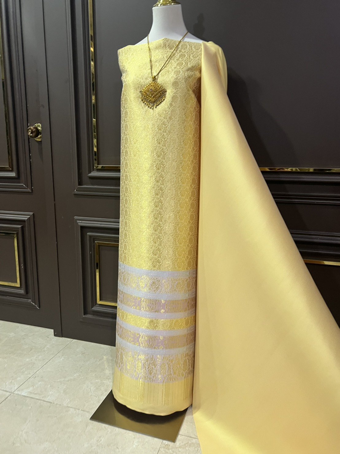 *มีตำหนิ ลายกุหลาบพันปี ยกใหญ่ลำพูนสีเหลือยกดอกดิ้นทอง