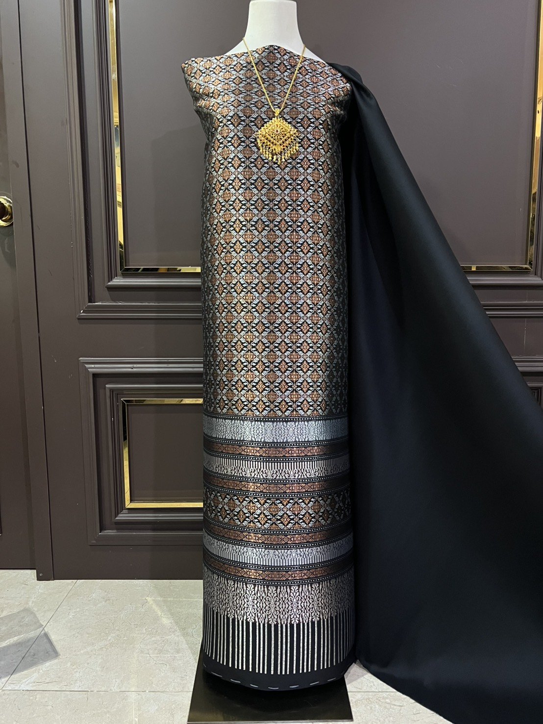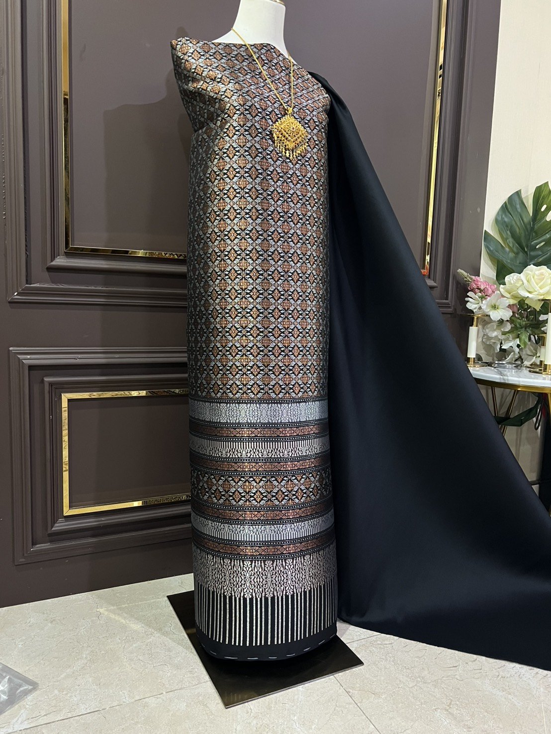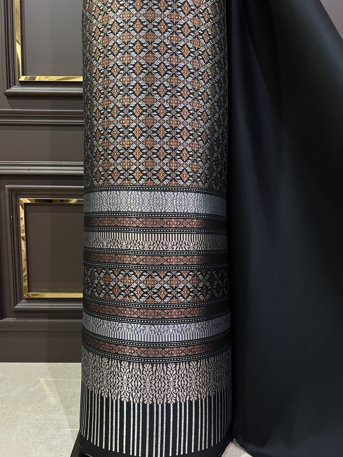 ลายบุษราคัมร้อยดวง ยกใหญ่ลำพูนสีดำกาบดิ้นเงินดอกดิ้นสีนาค