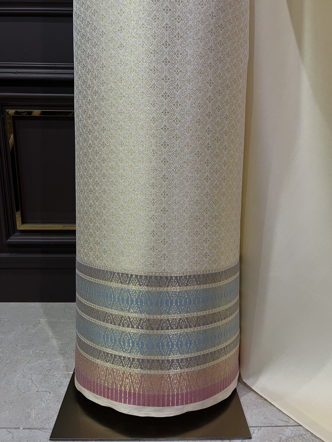 ลายบุษราคัมร้อยดวง ยกใหญ่ลำพูนสีม่วงเปลือกมังคุดกาบดิ้นทองดอกดิ้นสีม่วงเชิงดิ้นทอง