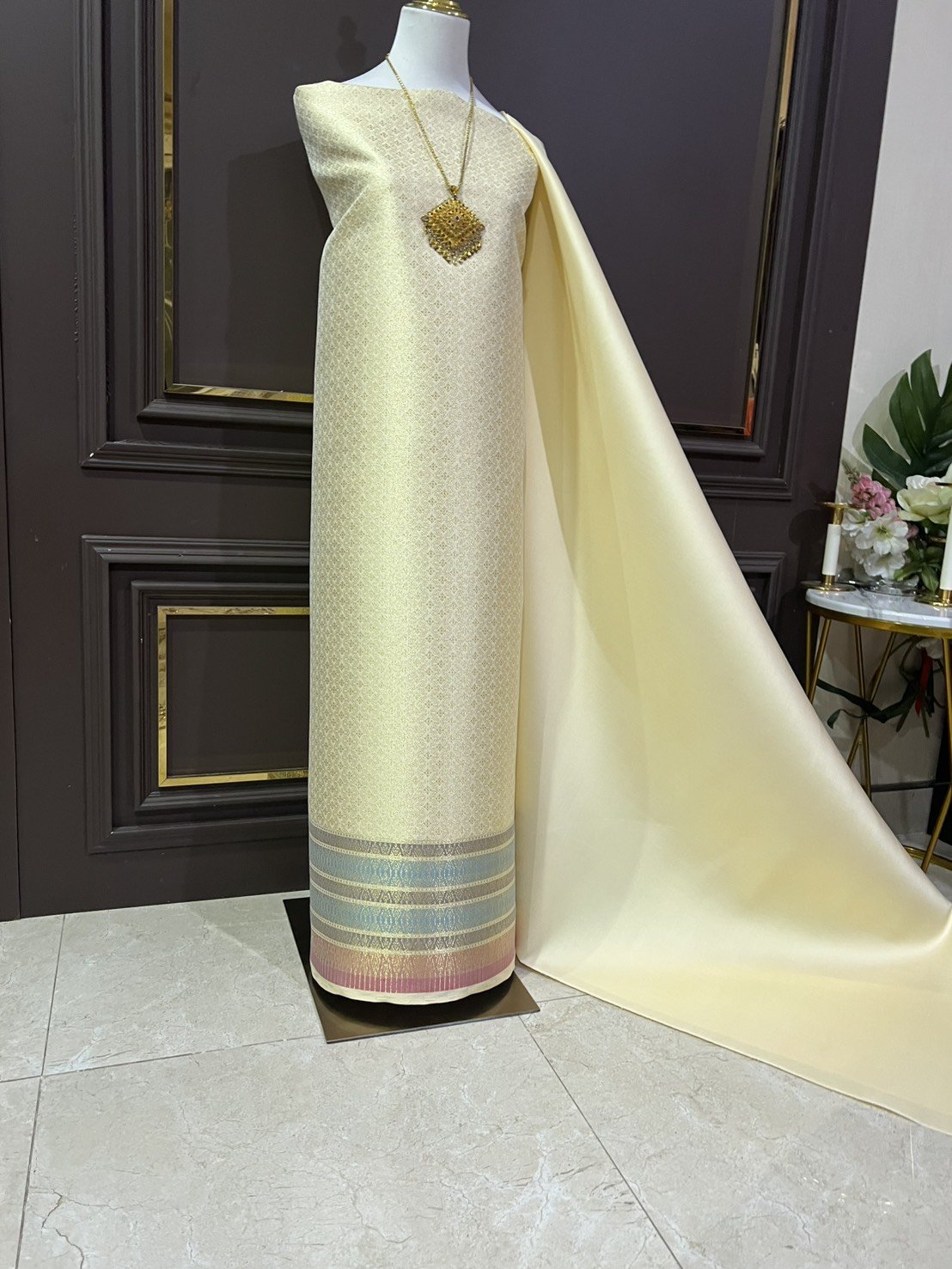 ลายพิกุโบราณ ยกใหญ่ลำพูนสีครีมคัสตาร์ดยกดอกดิ้นทอง