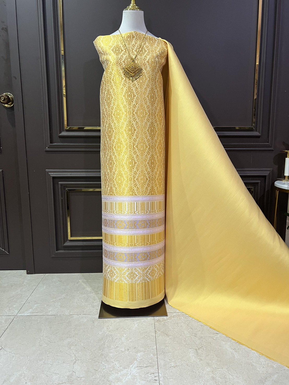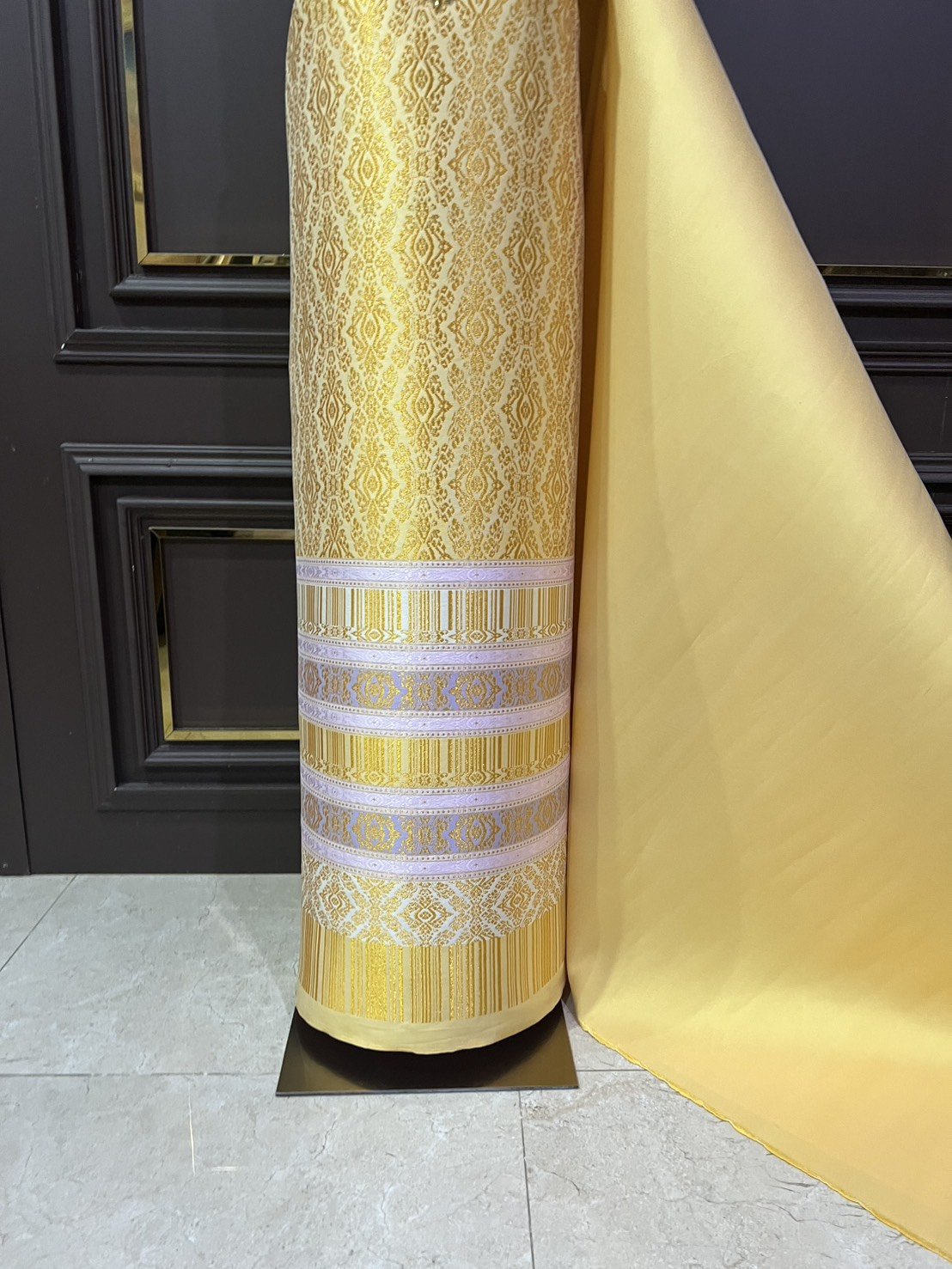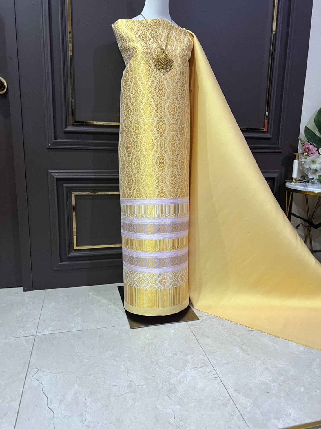 ลายบุษราคัมร้อยดวง ยกใหญ่ลำพูนสีม่วงเปลือกมังคุดกาบดิ้นทองดอกดิ้นสีม่วงเชิงดิ้นทอง