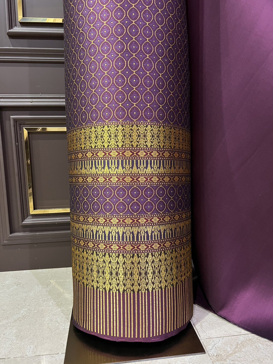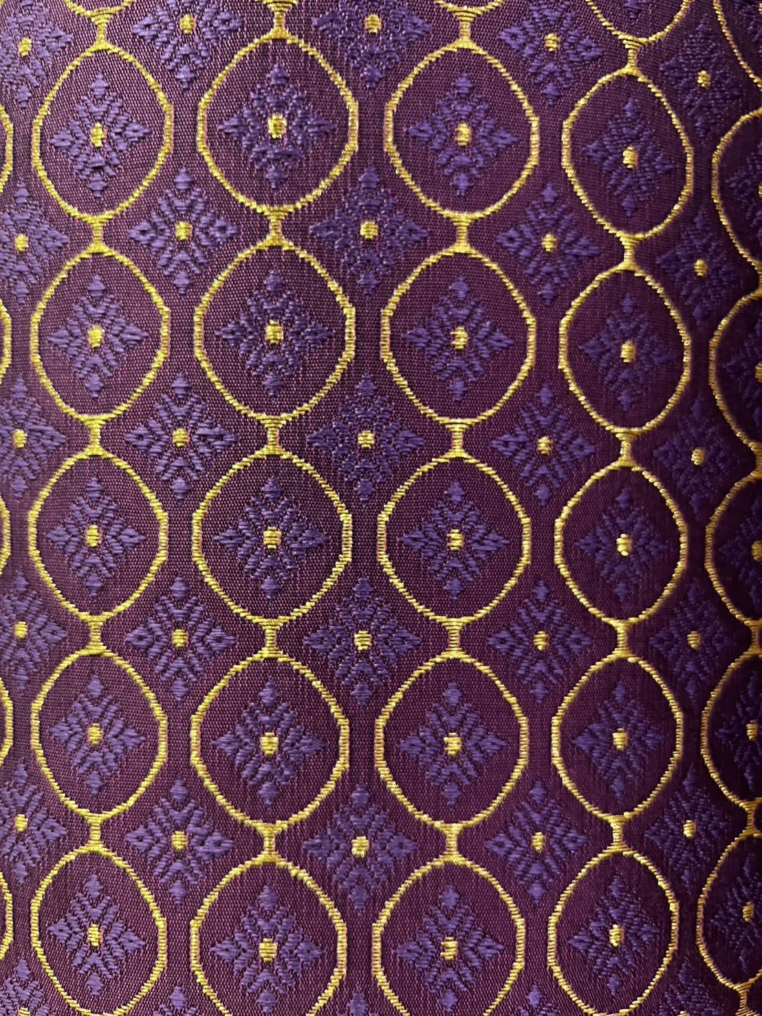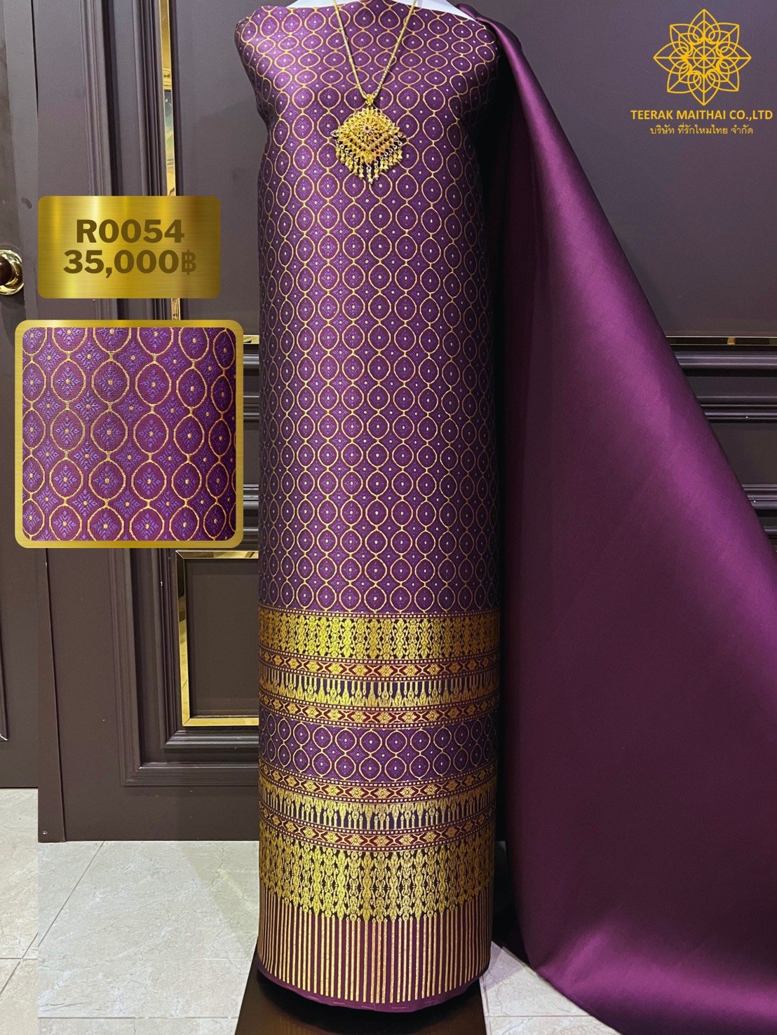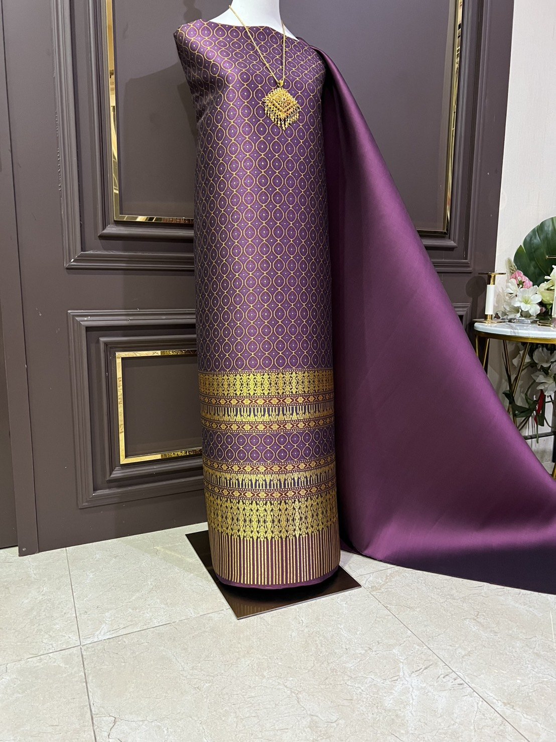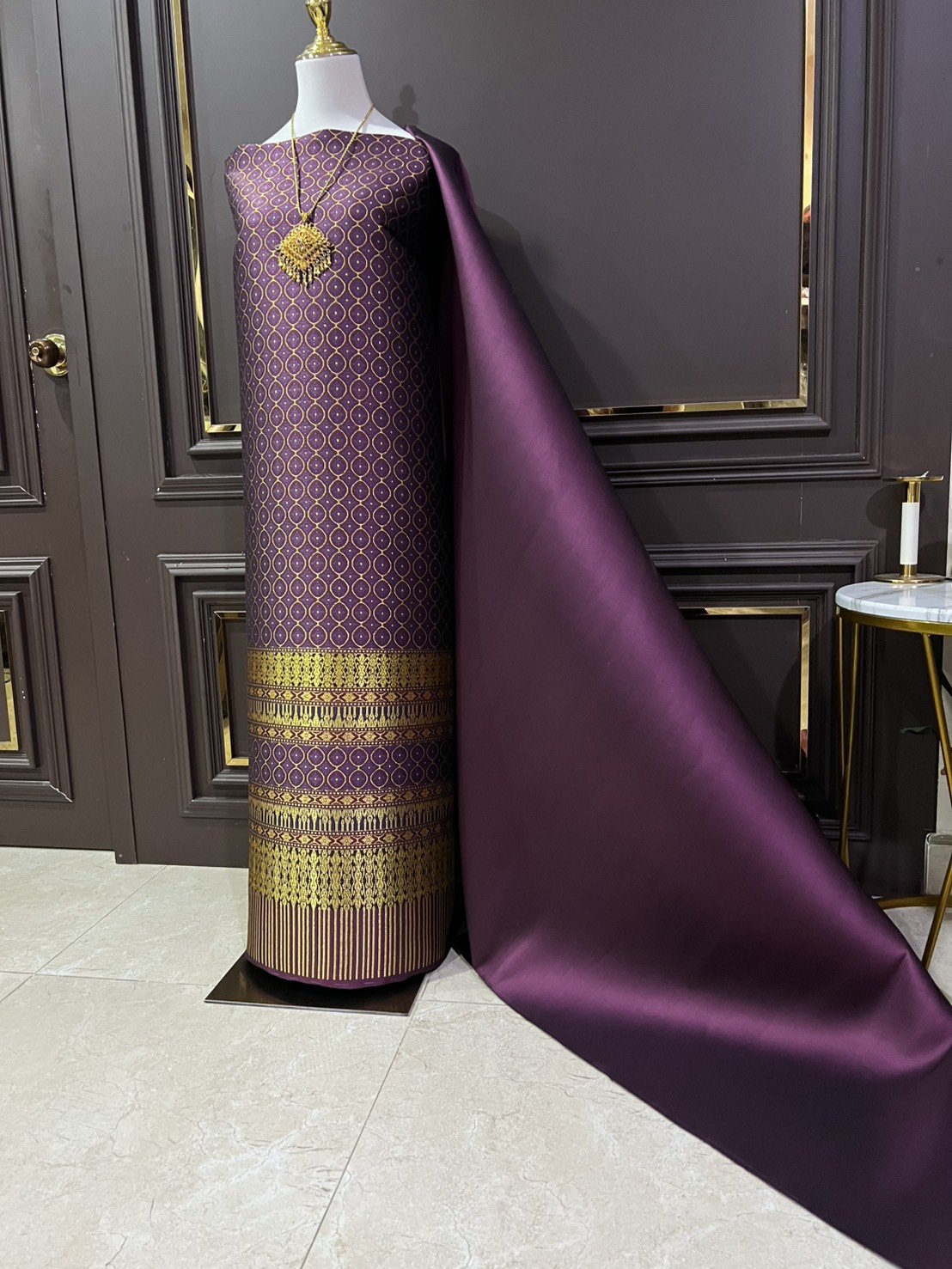 ลายบุษราคัมร้อยดวง ยกใหญ่ลำพูนสีม่วงเปลือกมังคุดกาบดิ้นทองดอกดิ้นสีม่วงเชิงดิ้นทอง