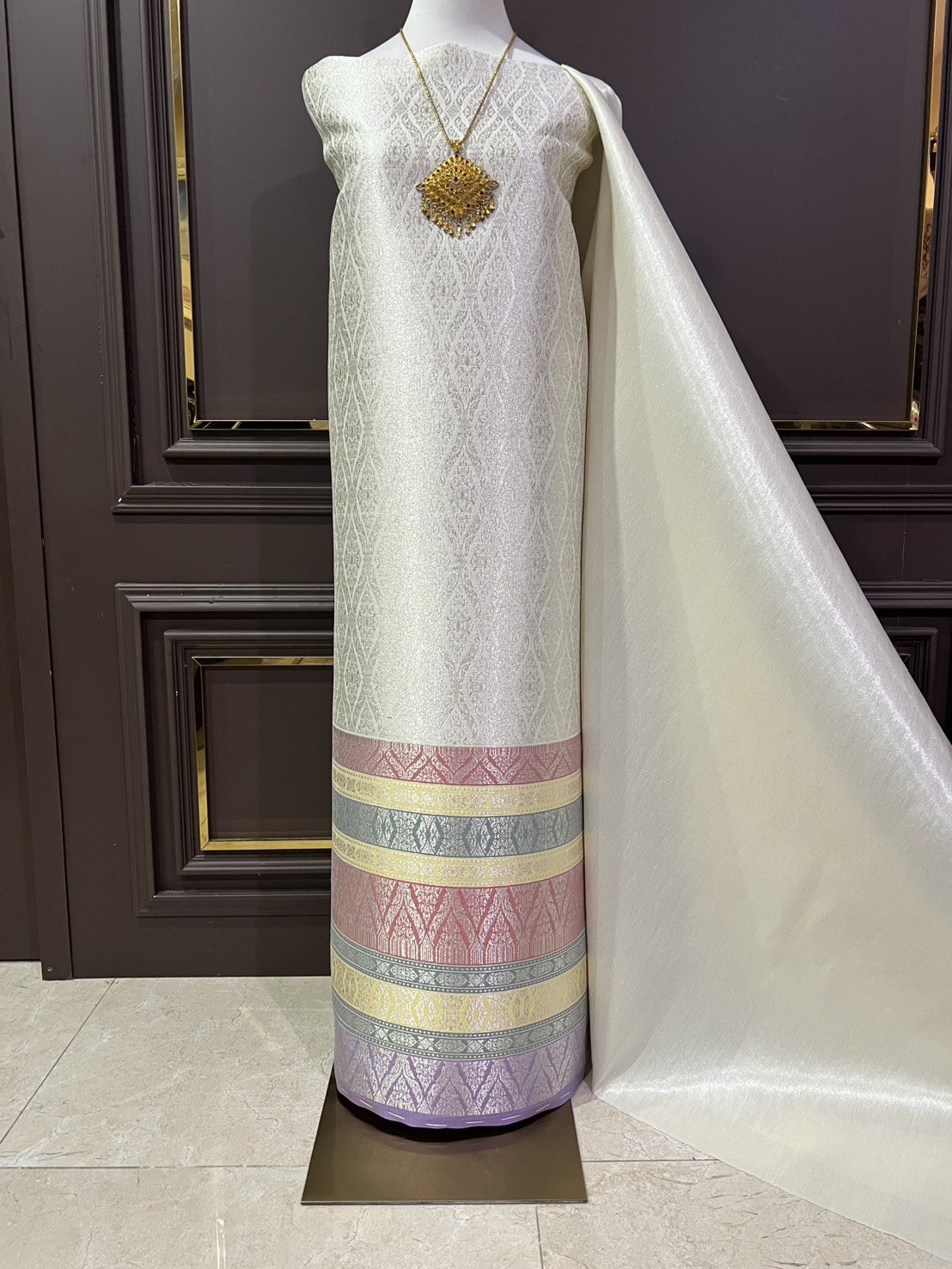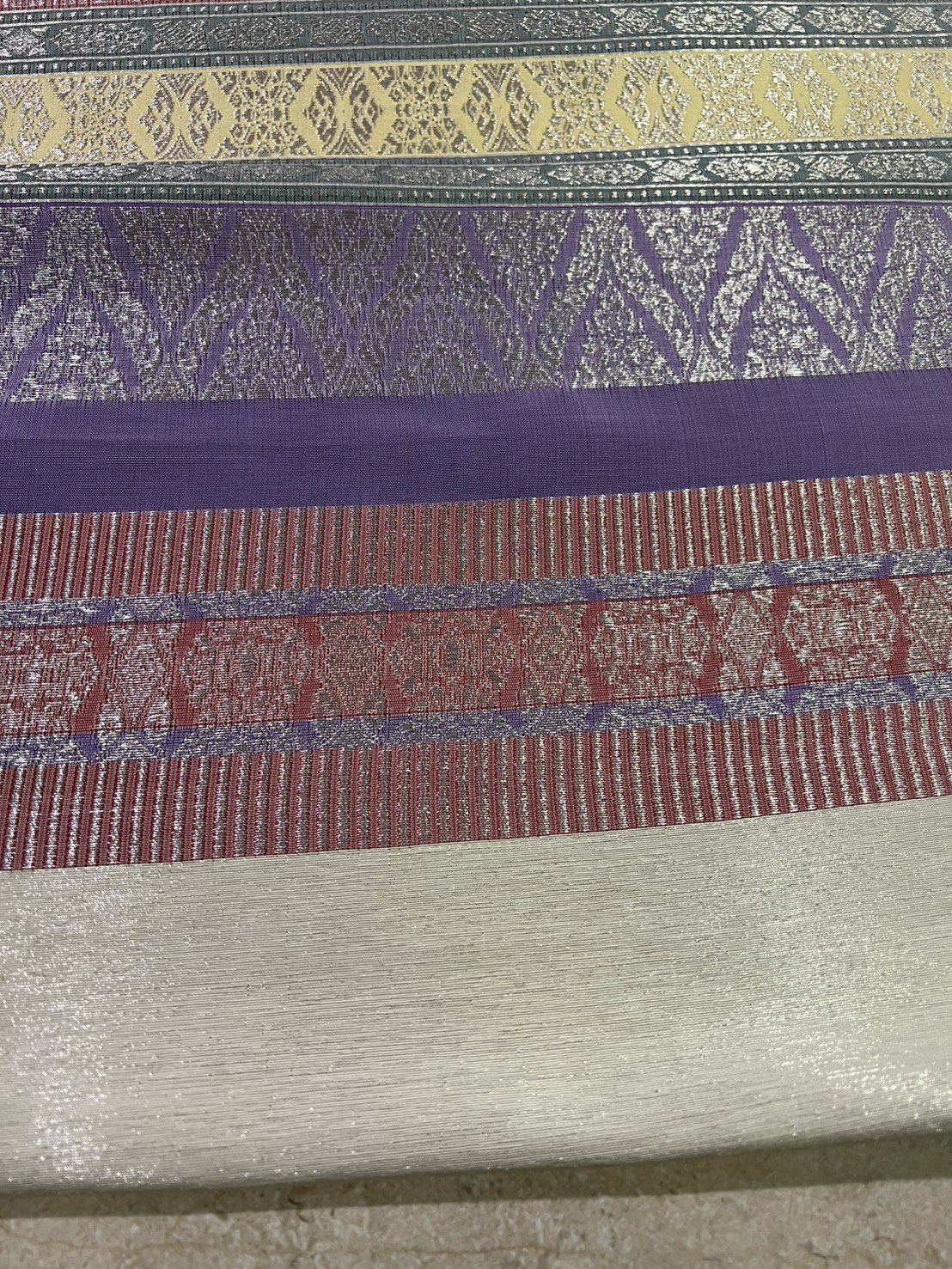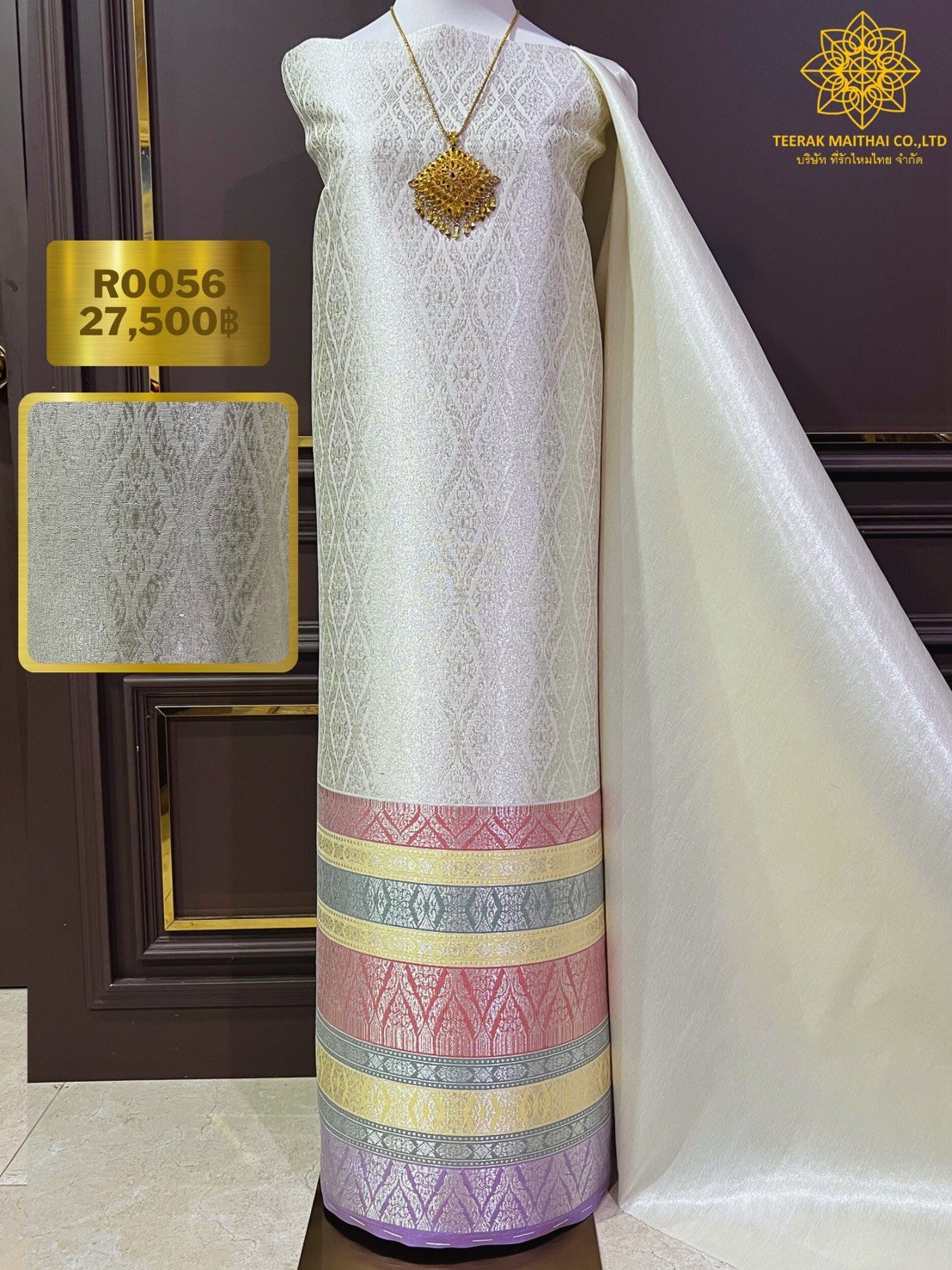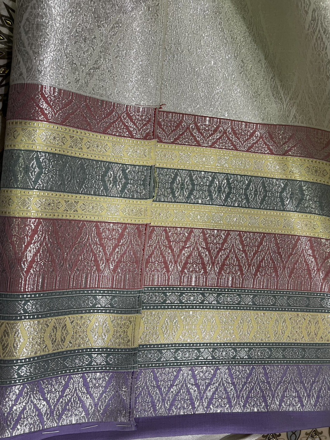 ลายแก้วกาหลง ยกใหญ่ลำพูนสีขาวออฟไวท์เกษรดิ้นเงินเกาะเชิงดิ้นเงิน