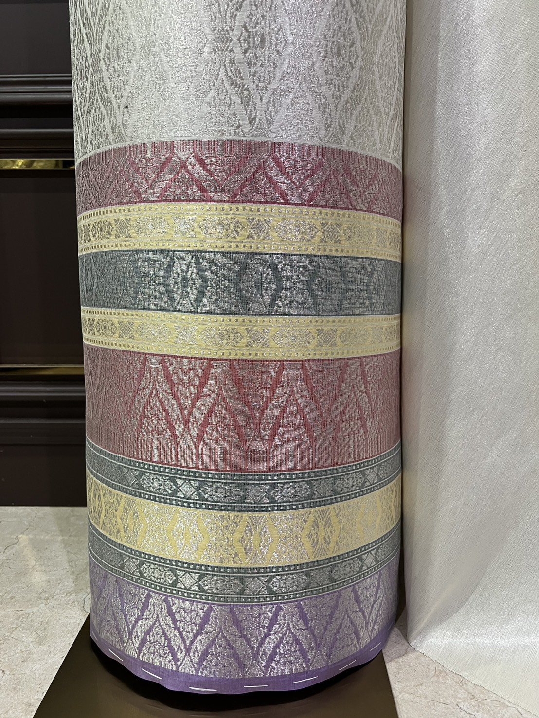 ลายกนกเกลียวสยาม ยกใหญ่ลำพูนสีขาวงาช้างยกดอกดิ้นเงินผ้าพื้นทอผสมดิ้น