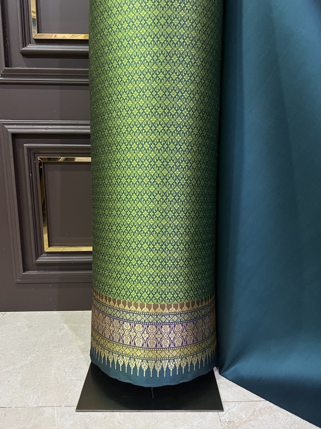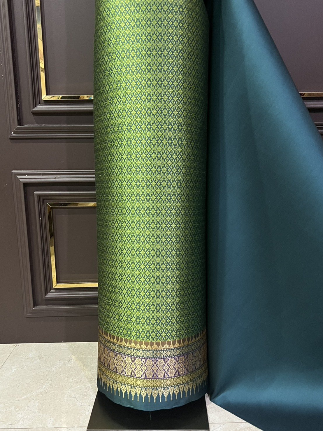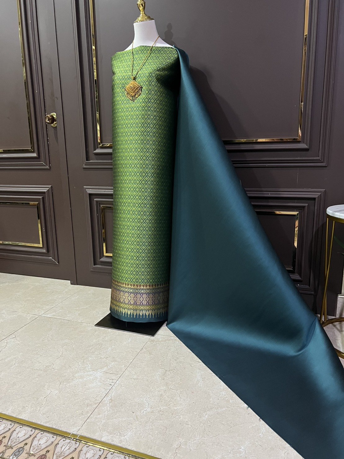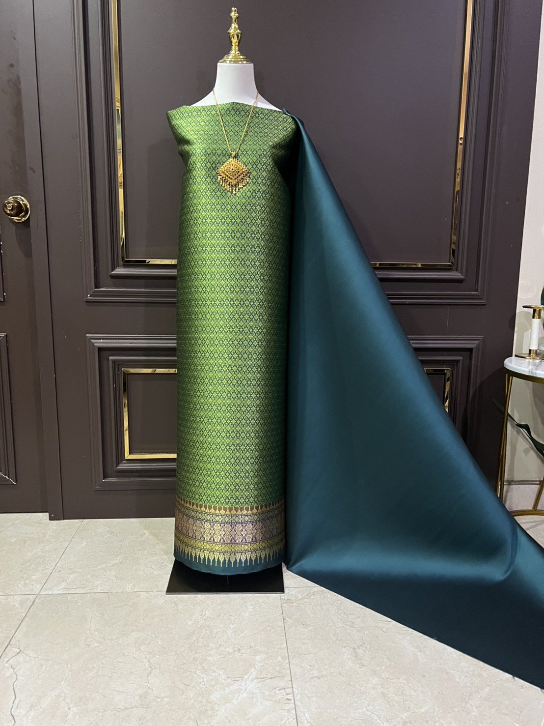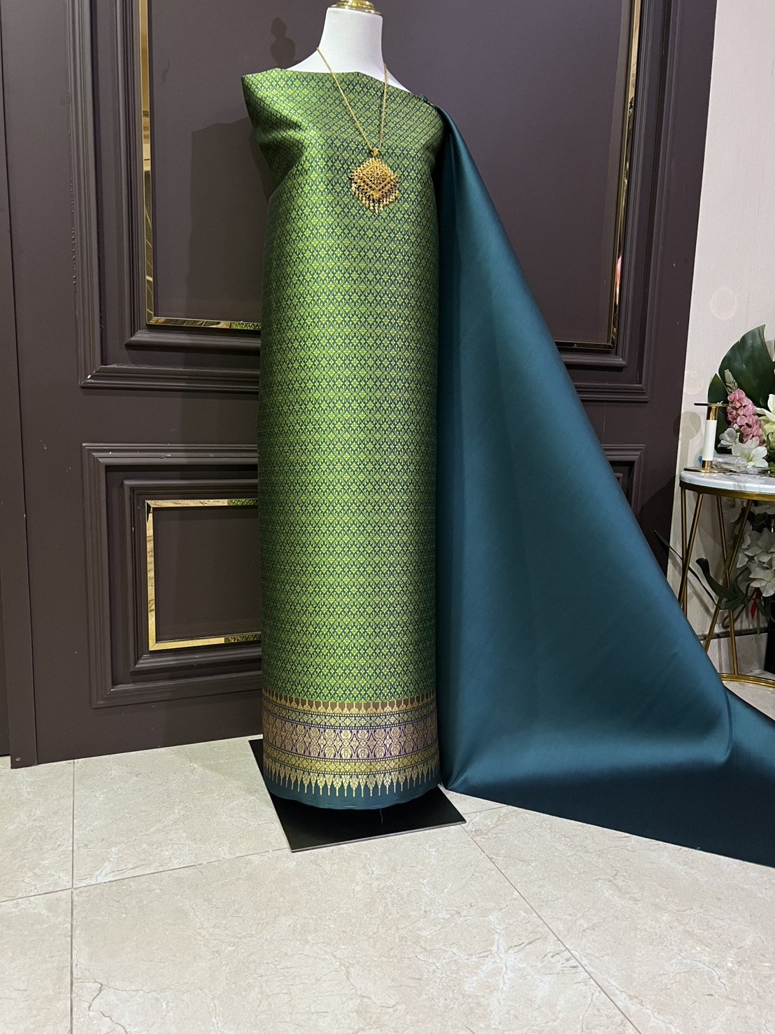 ลายช่อชัยพฤกษ์ ยกใหญ่ลำพูนสีเขียวหัวเป็ดยกดอกไหมสีเขียวสดสอดเกษรดิ้นทองเกาะเชิงดิ้นทอง