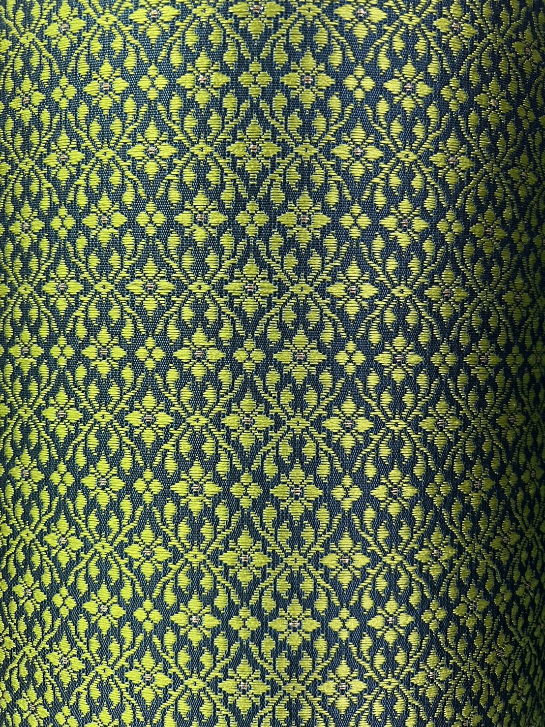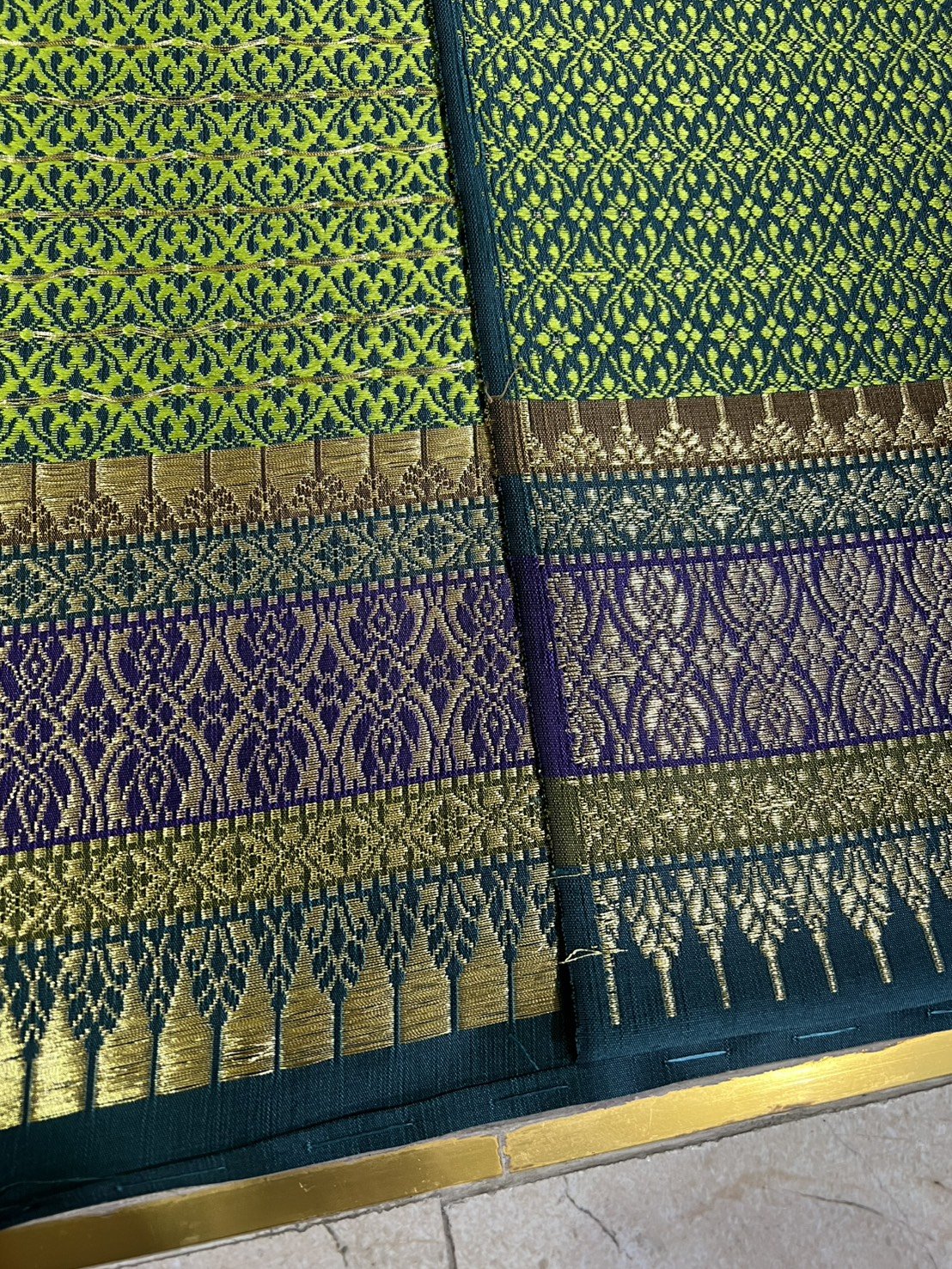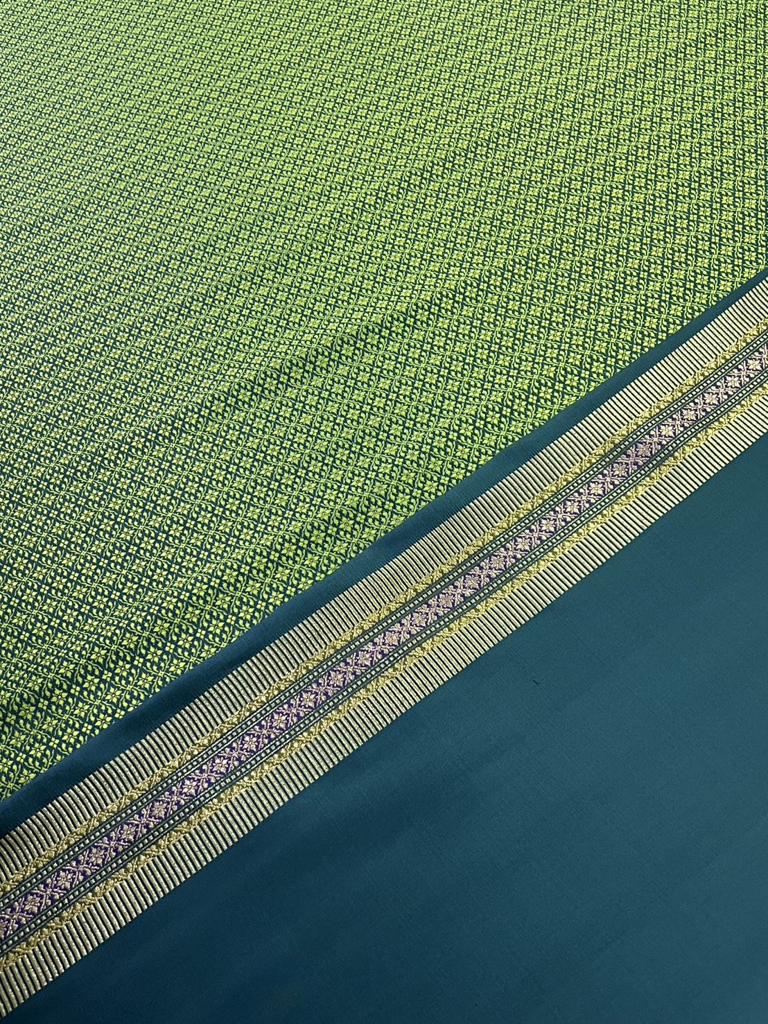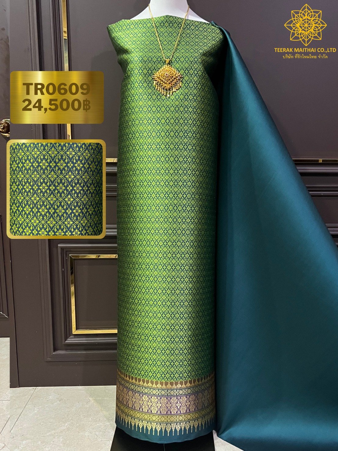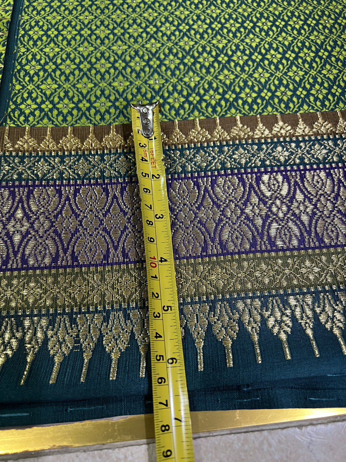 ลายช่อชัยพฤกษ์ ยกใหญ่ลำพูนสีเขียวหัวเป็ดยกดอกไหมสีเขียวสดสอดเกษรดิ้นทองเกาะเชิงดิ้นทอง