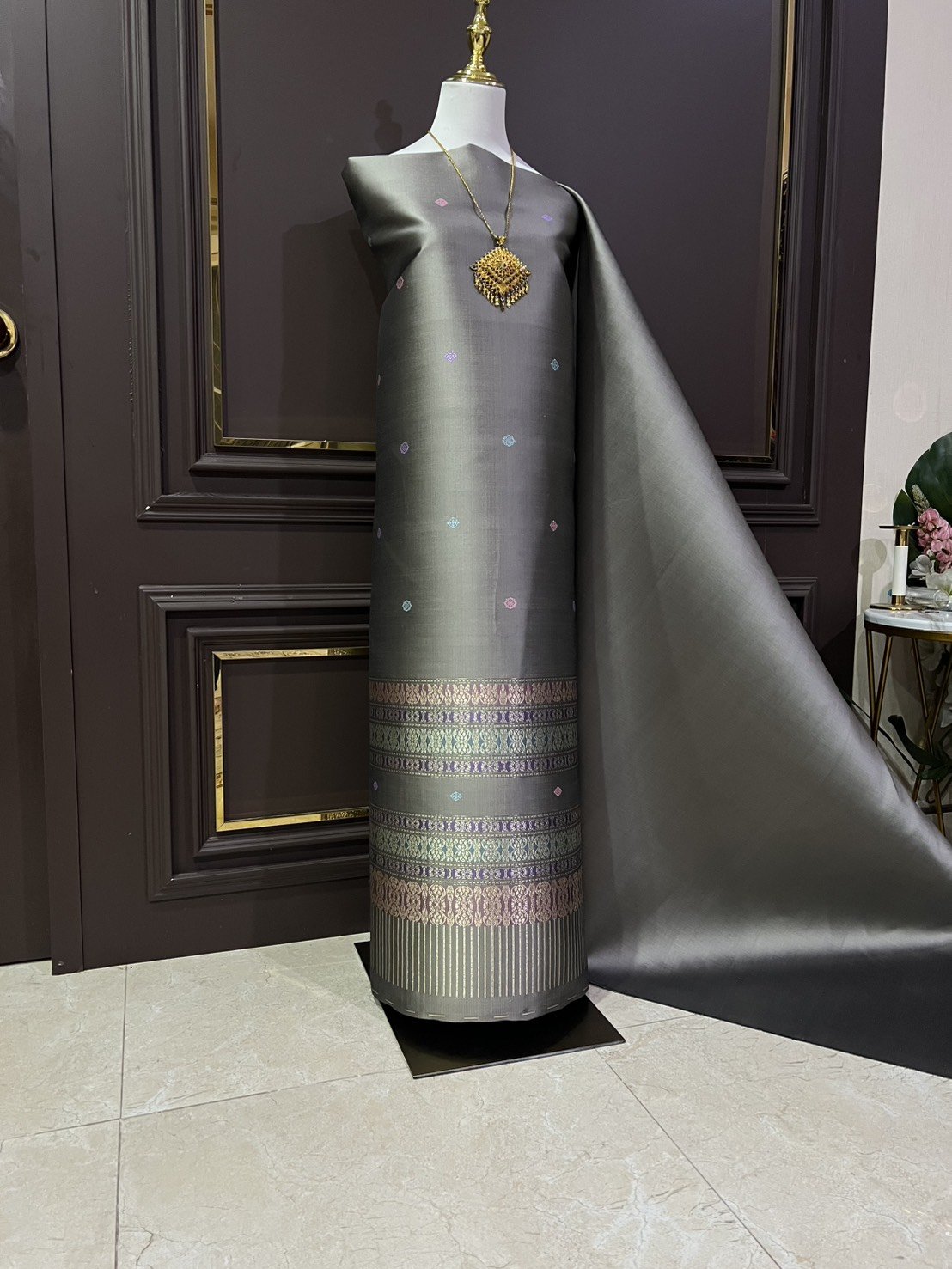 *มีตำหนิเชิงไม่ตรง ลายแก้วกัลยา ยกใหญ่ลำพูนสีน้ำตาลเทากาบดิ้นทองดอกไหมสีน้ำตาล