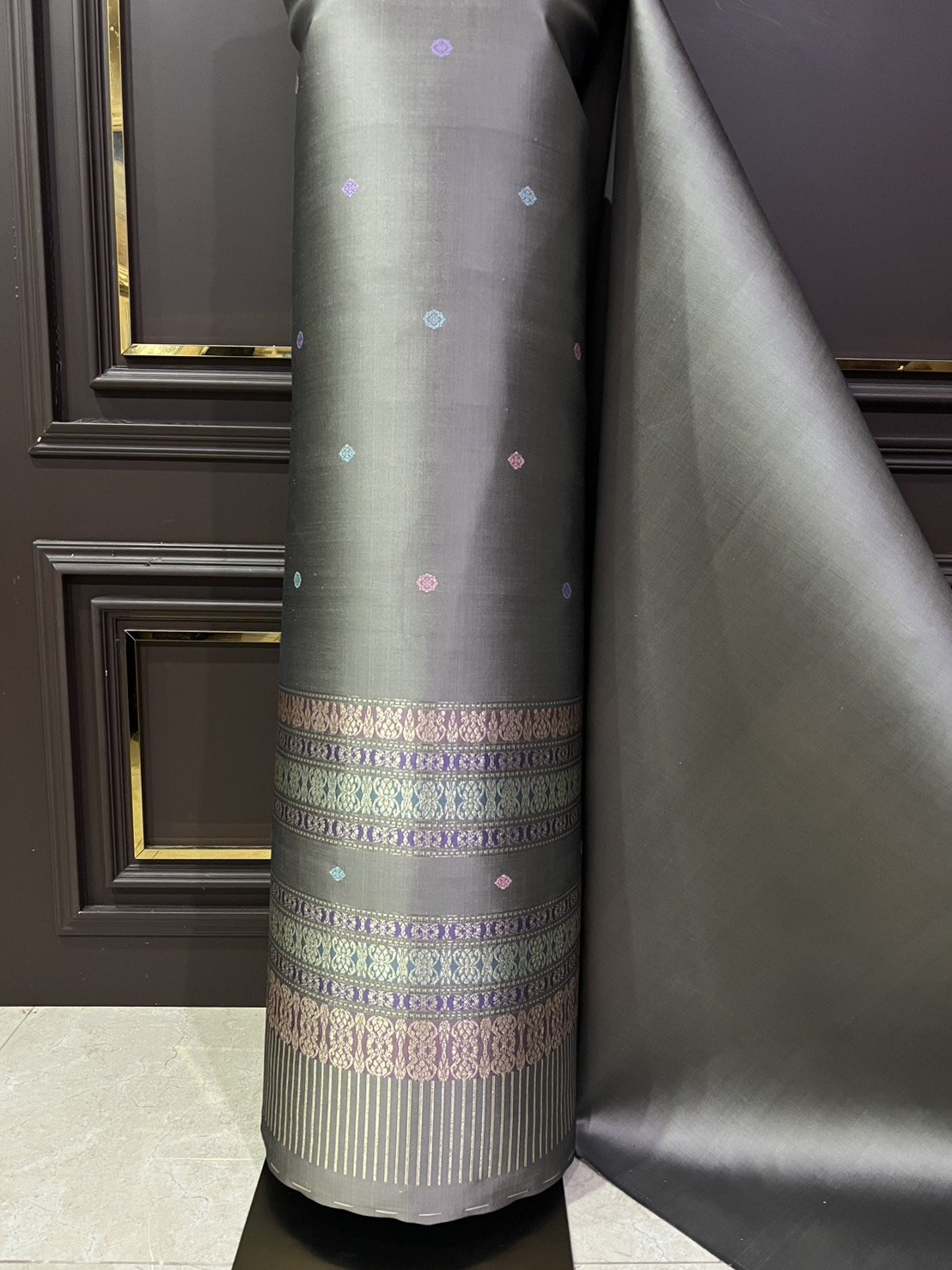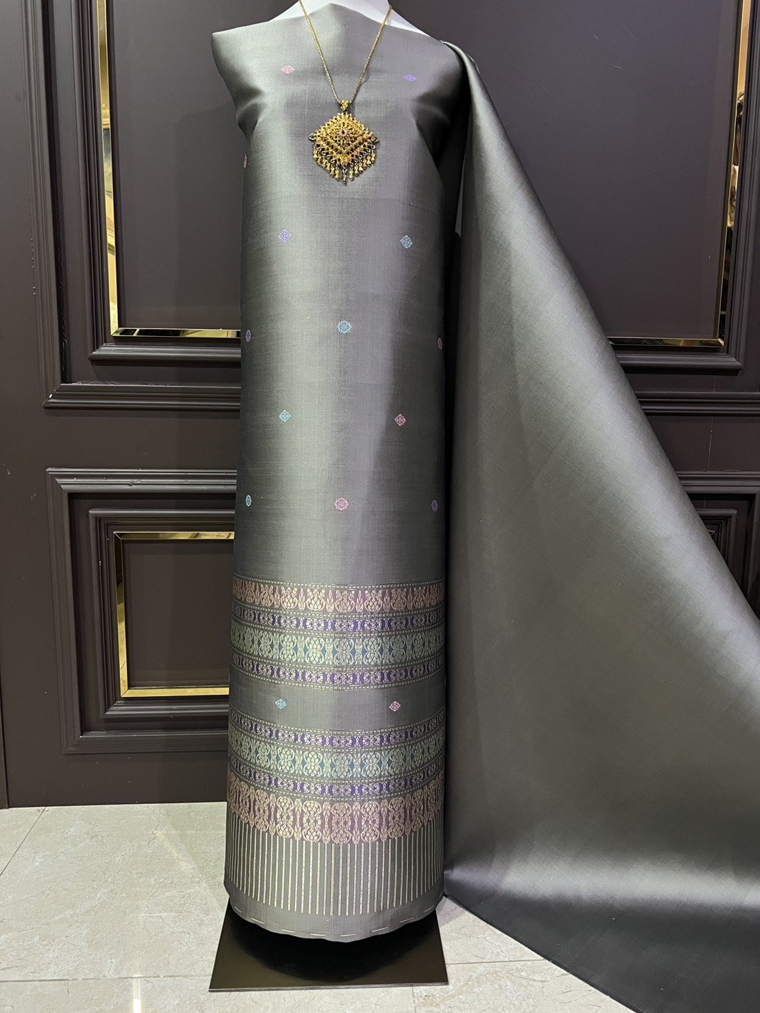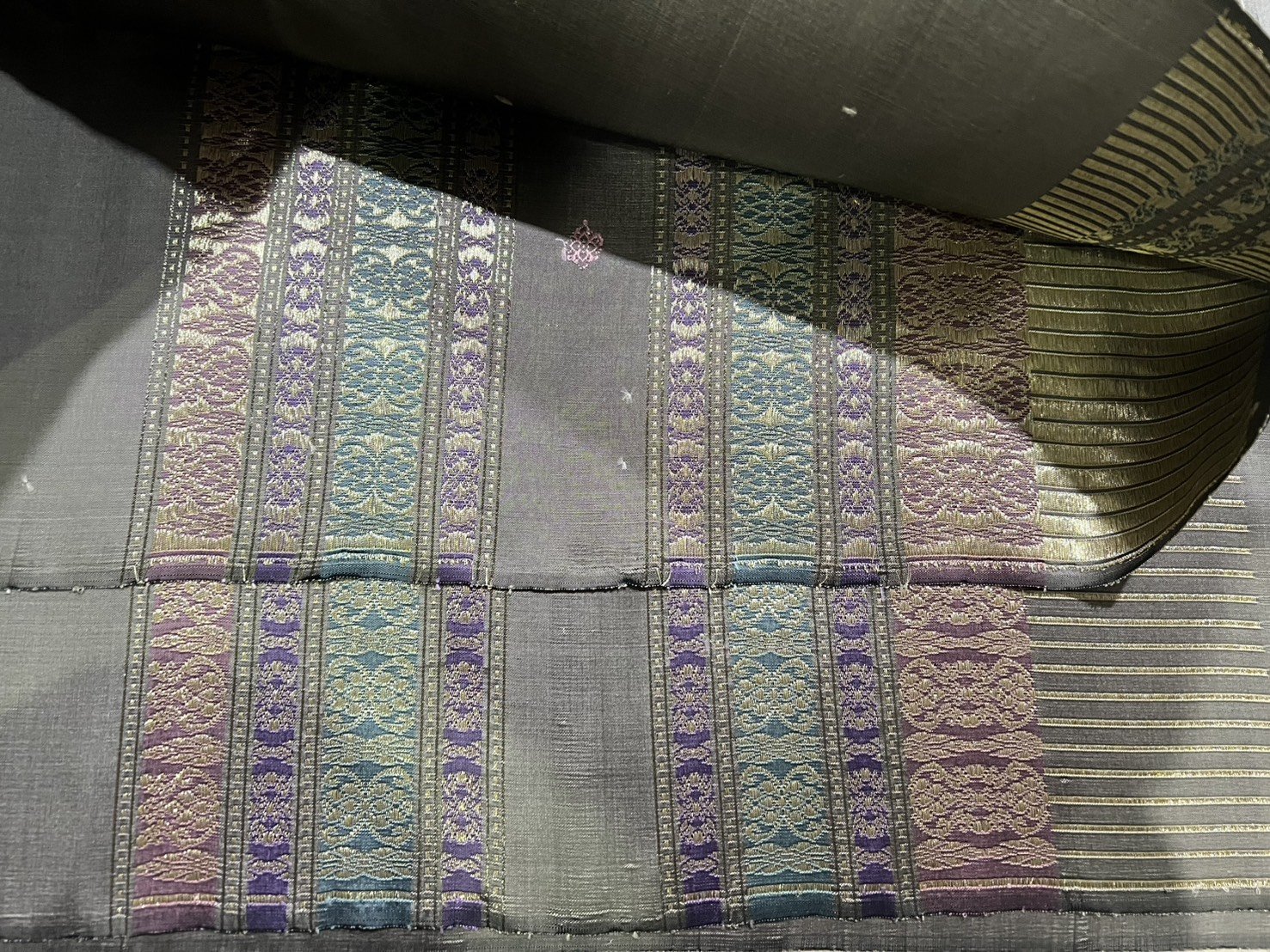 ลายเกลียวมาลัย ยกใหญ่ลำพูนซิ่นพุ่งน้ำตาลผ้าพื้นพุ่งสีมิ้นกาบดิ้นทองดอกไหมสีน้ำตาลเข้มสอดเกษรสลับสีเทาและม่วงอ่อน