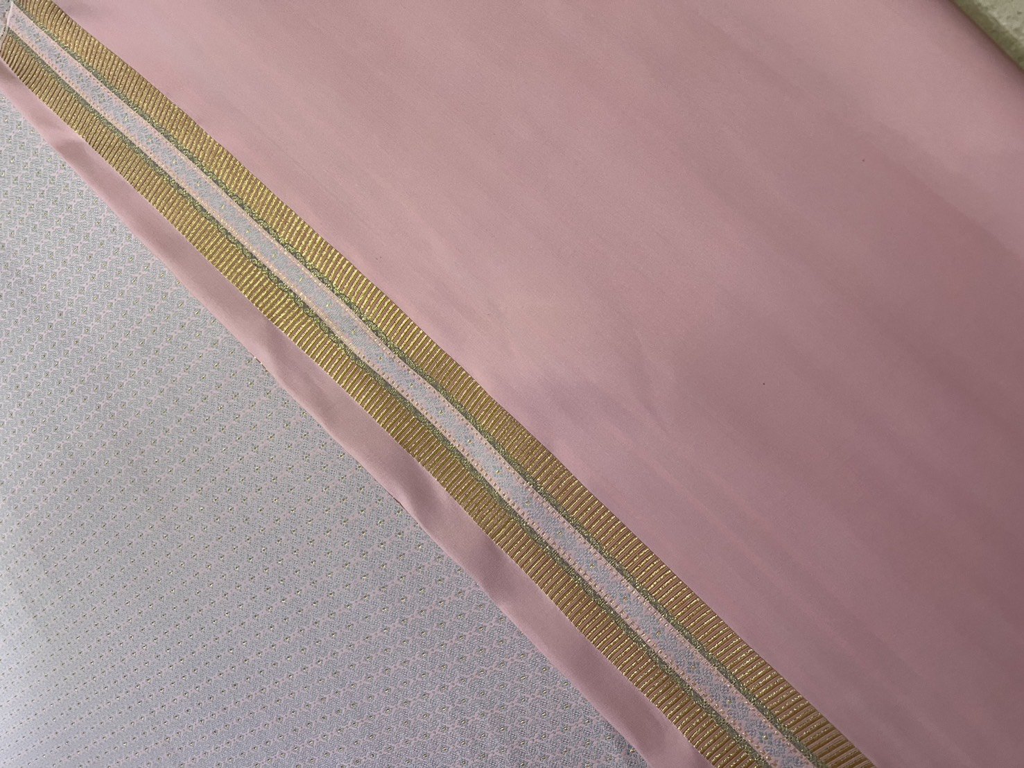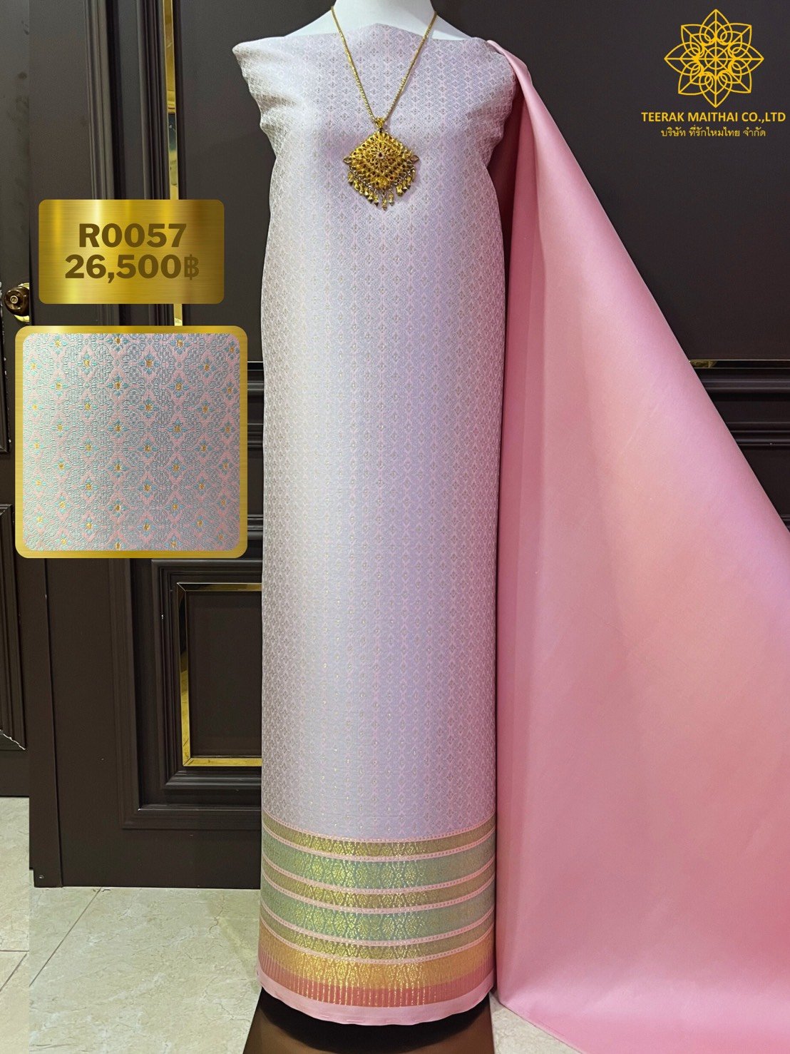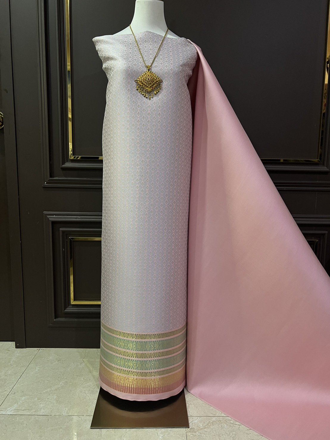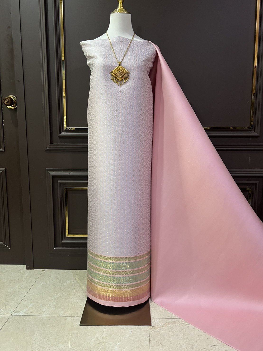 ลายพิกุลโบราณ ยกใหญ่ลำพูนสีชมพูหวานยกดอกสีเขียวมิ้นเกาะเชิงดิ้นทอง