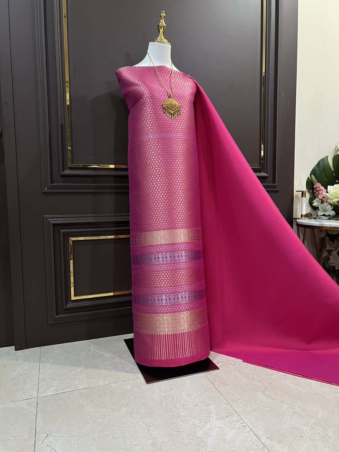ลายช่อพิกุล ยกใหญ่ลำพูนสีชมพูสดยกดอกดิ้นทอง