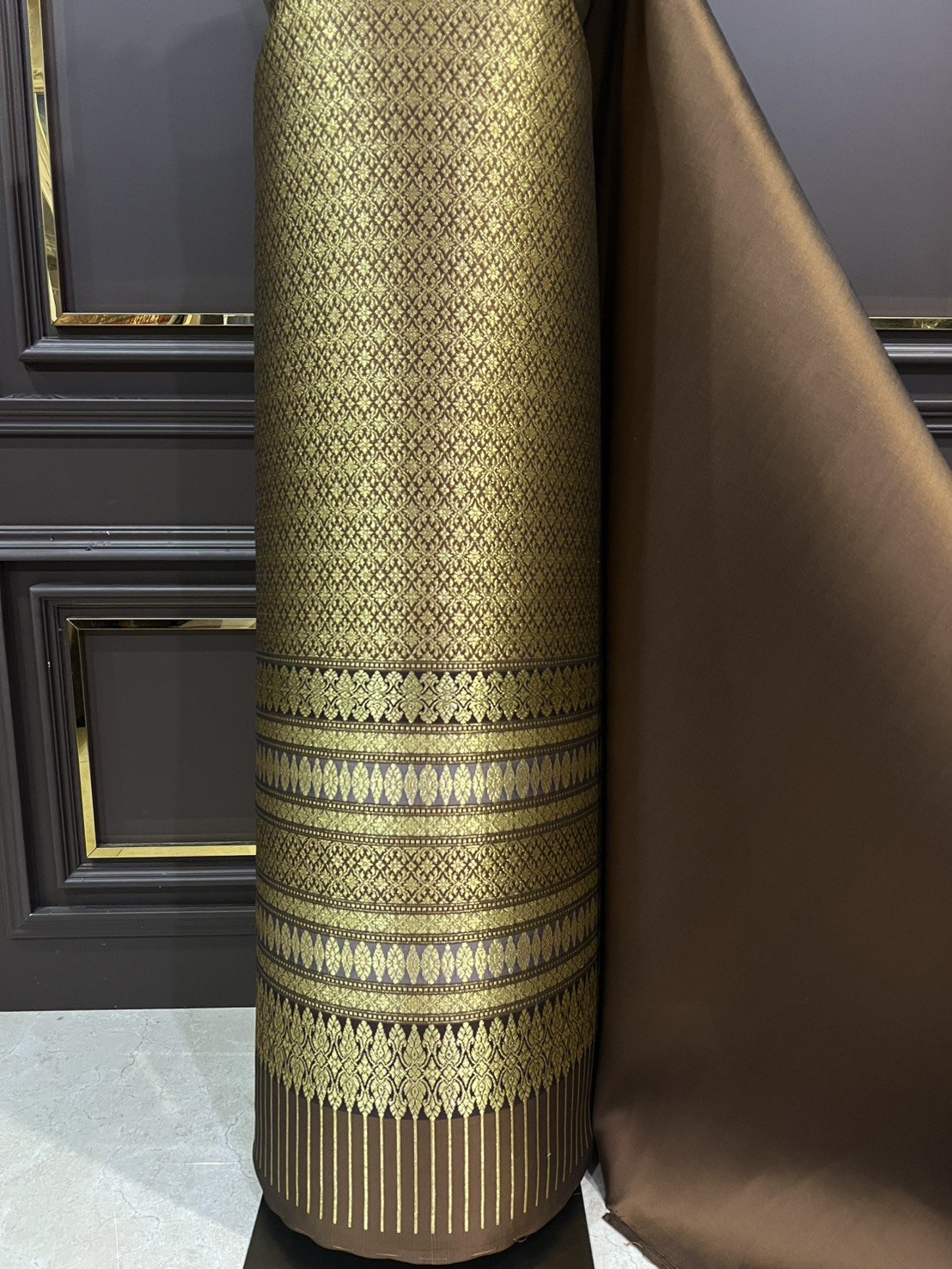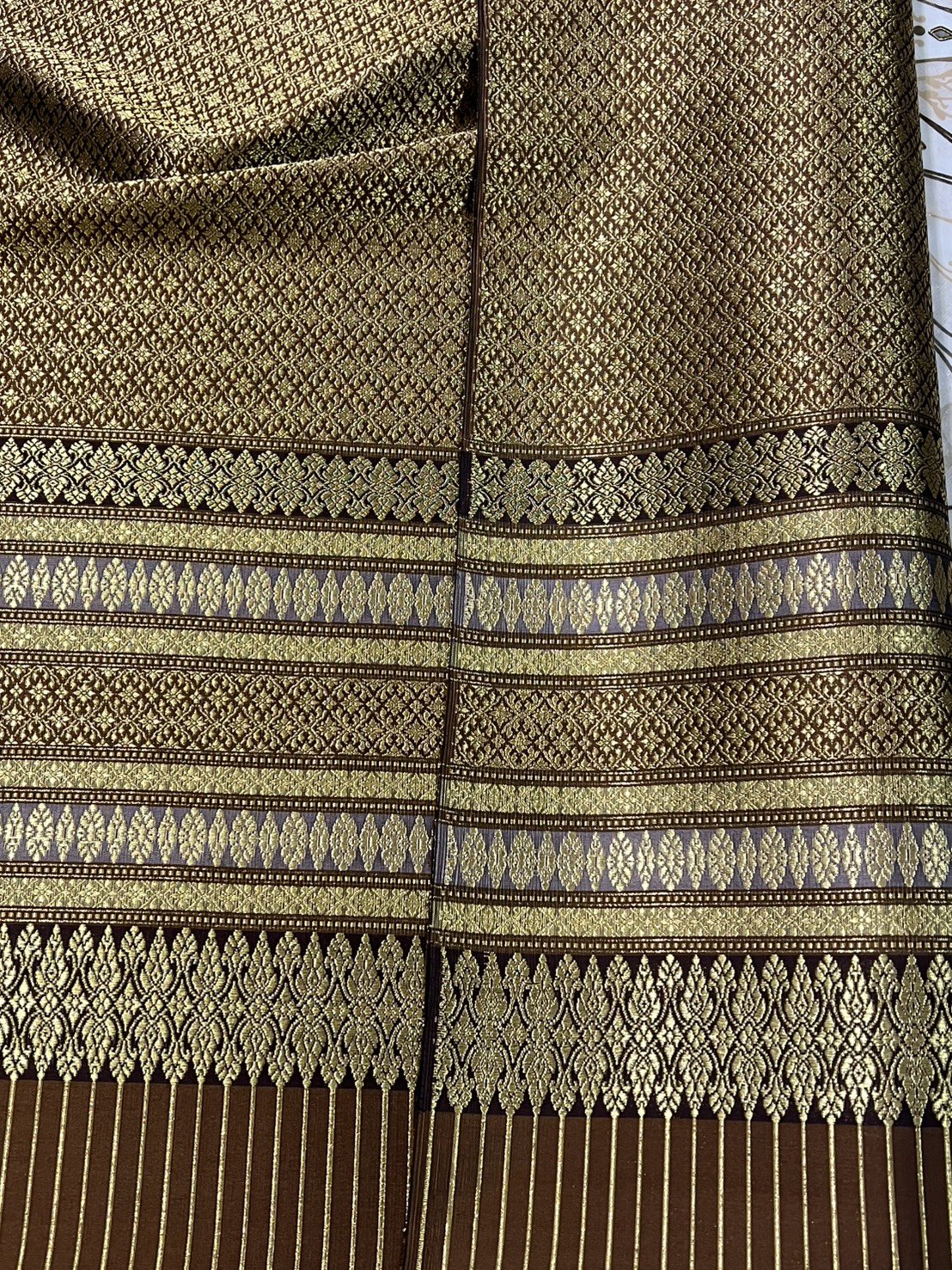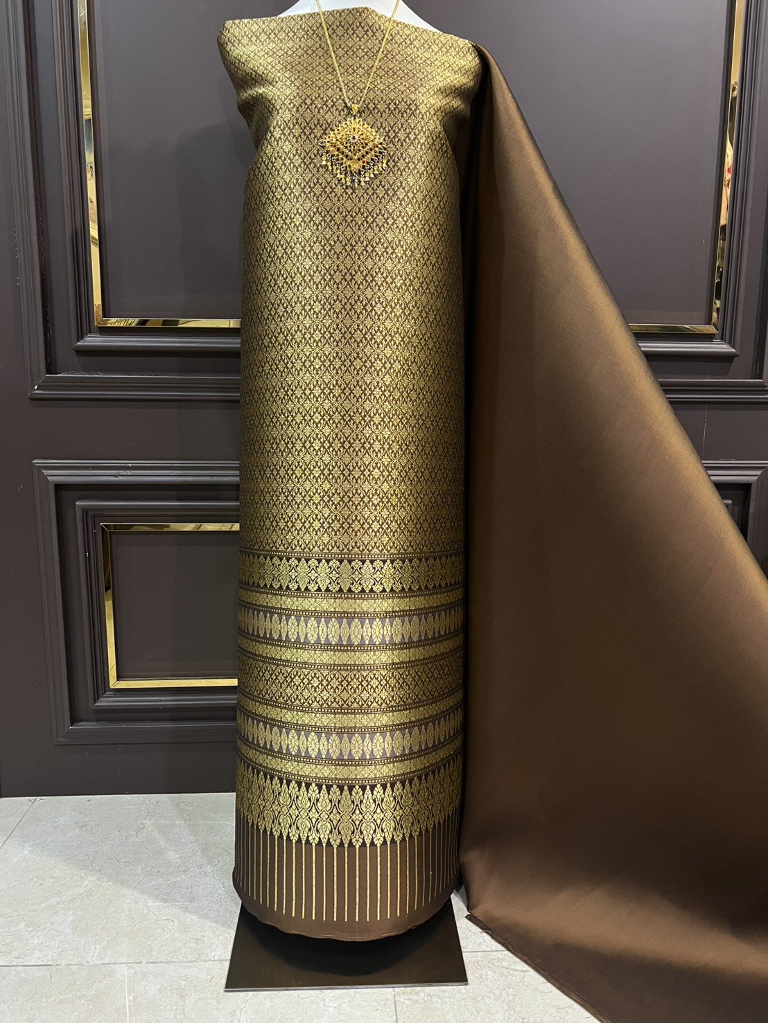 ผ้ายกดอกลำพูนสีน้ำตาลทอง