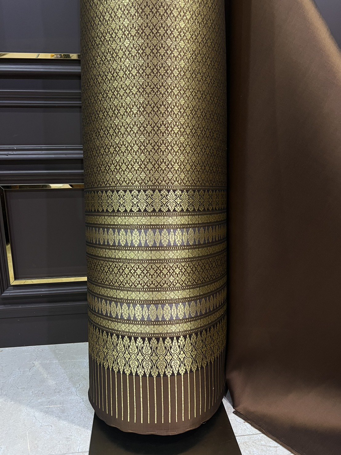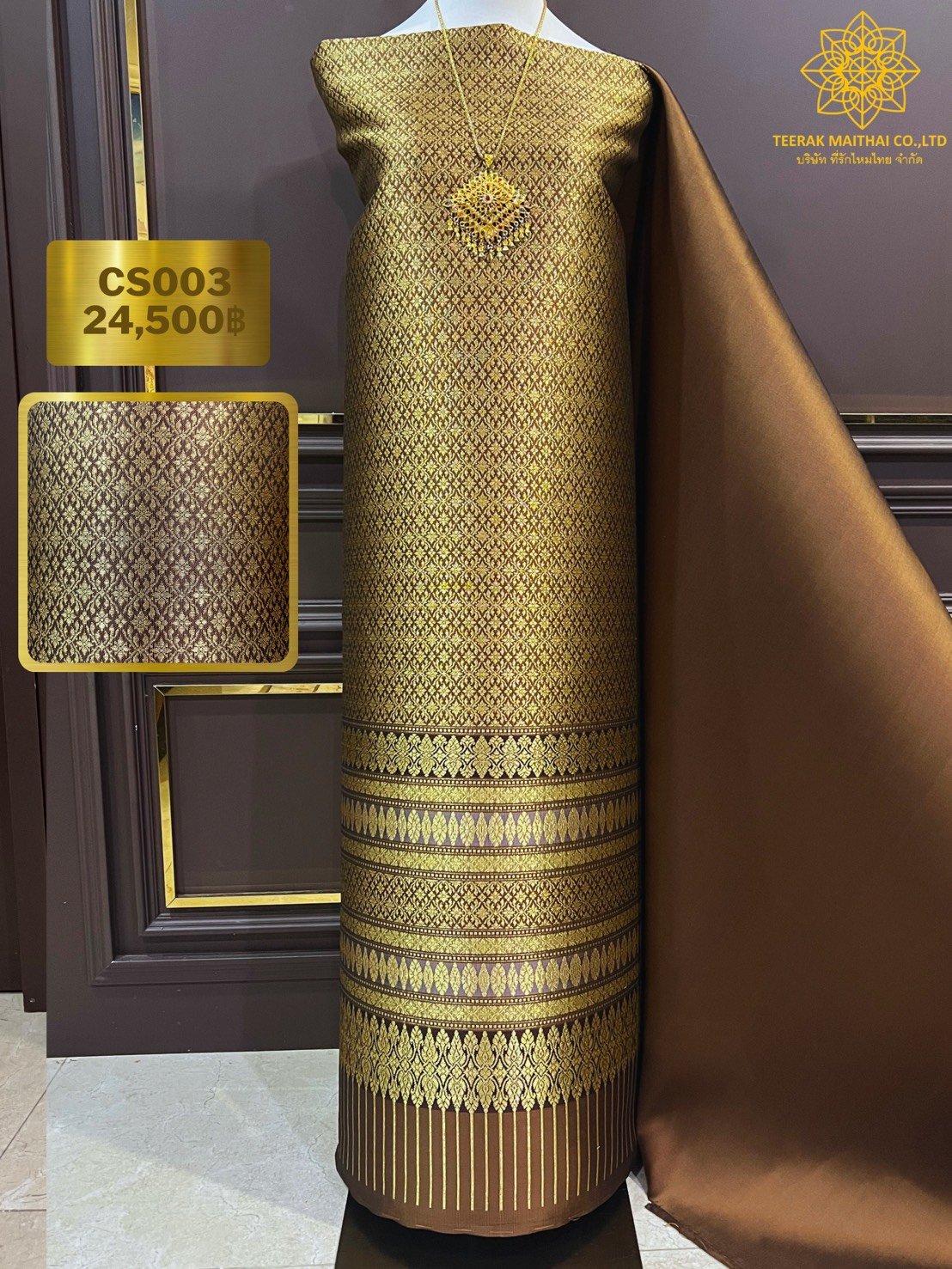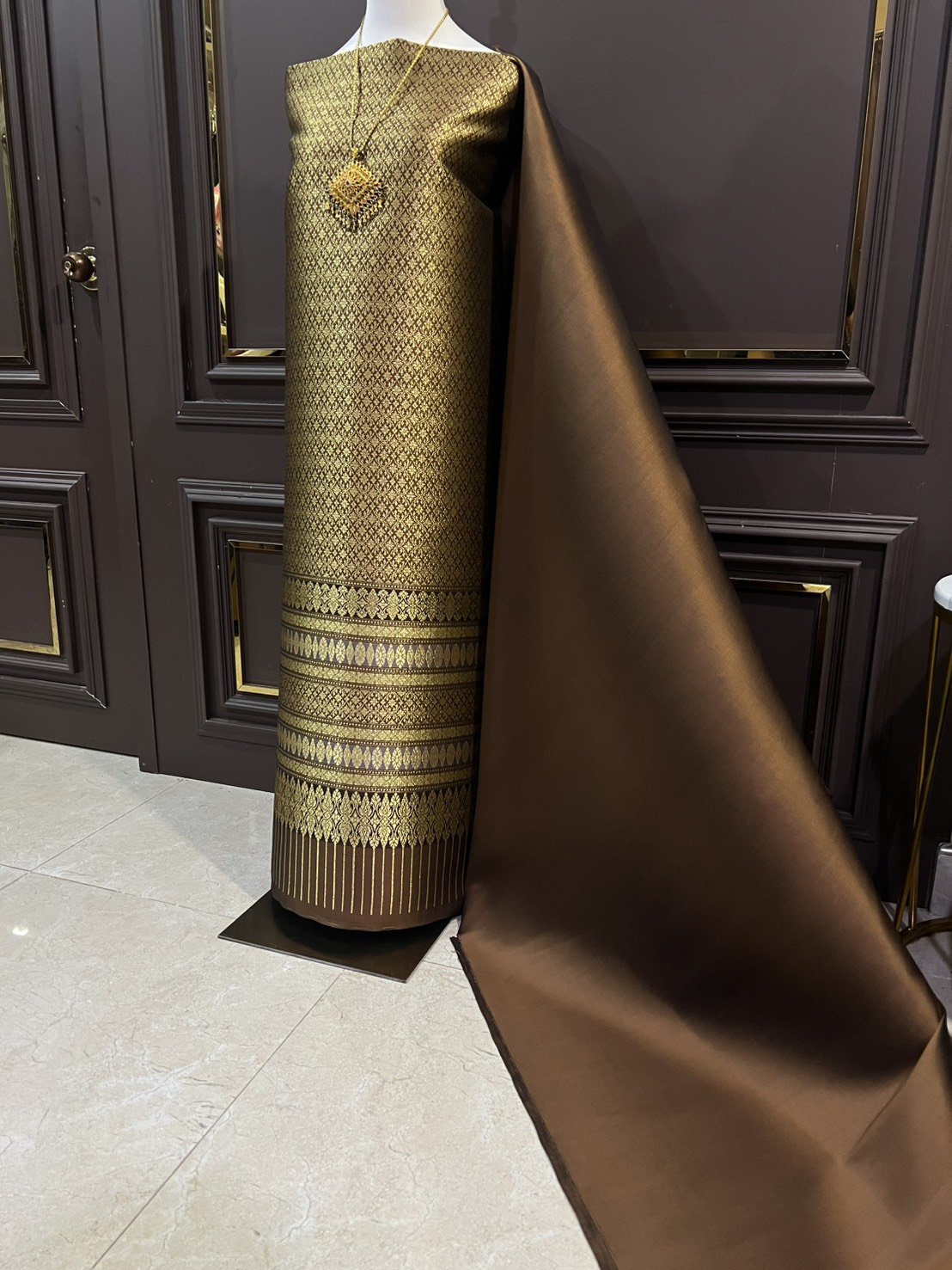 ผ้ายกดอกลำพูนสีน้ำตาลทอง