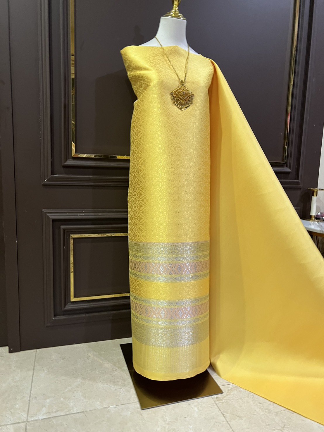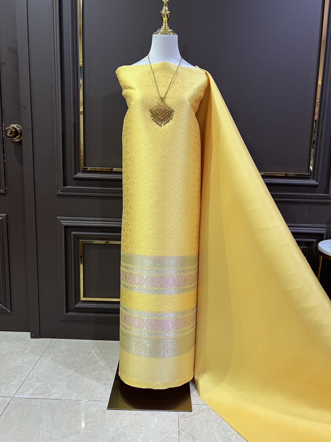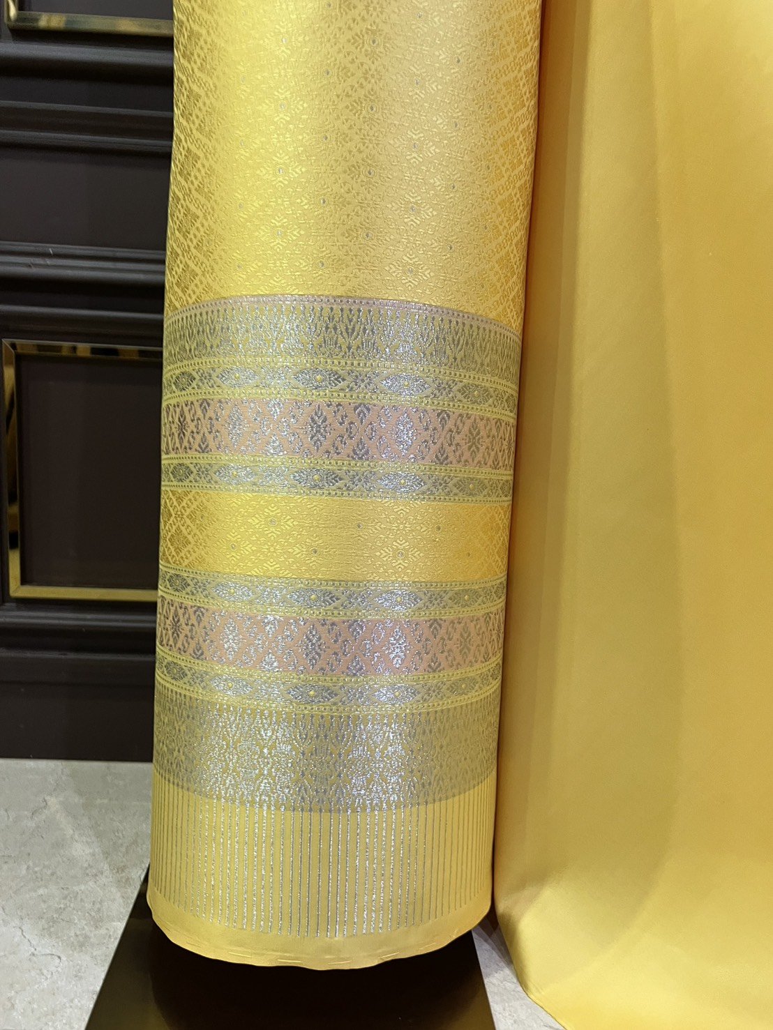 ลายพิกุลขอบเพชร ยกใหญ่ลำพูนสีเหลืองสดเชิงดิ้นทองสอดเกษรดิ้นทอง
