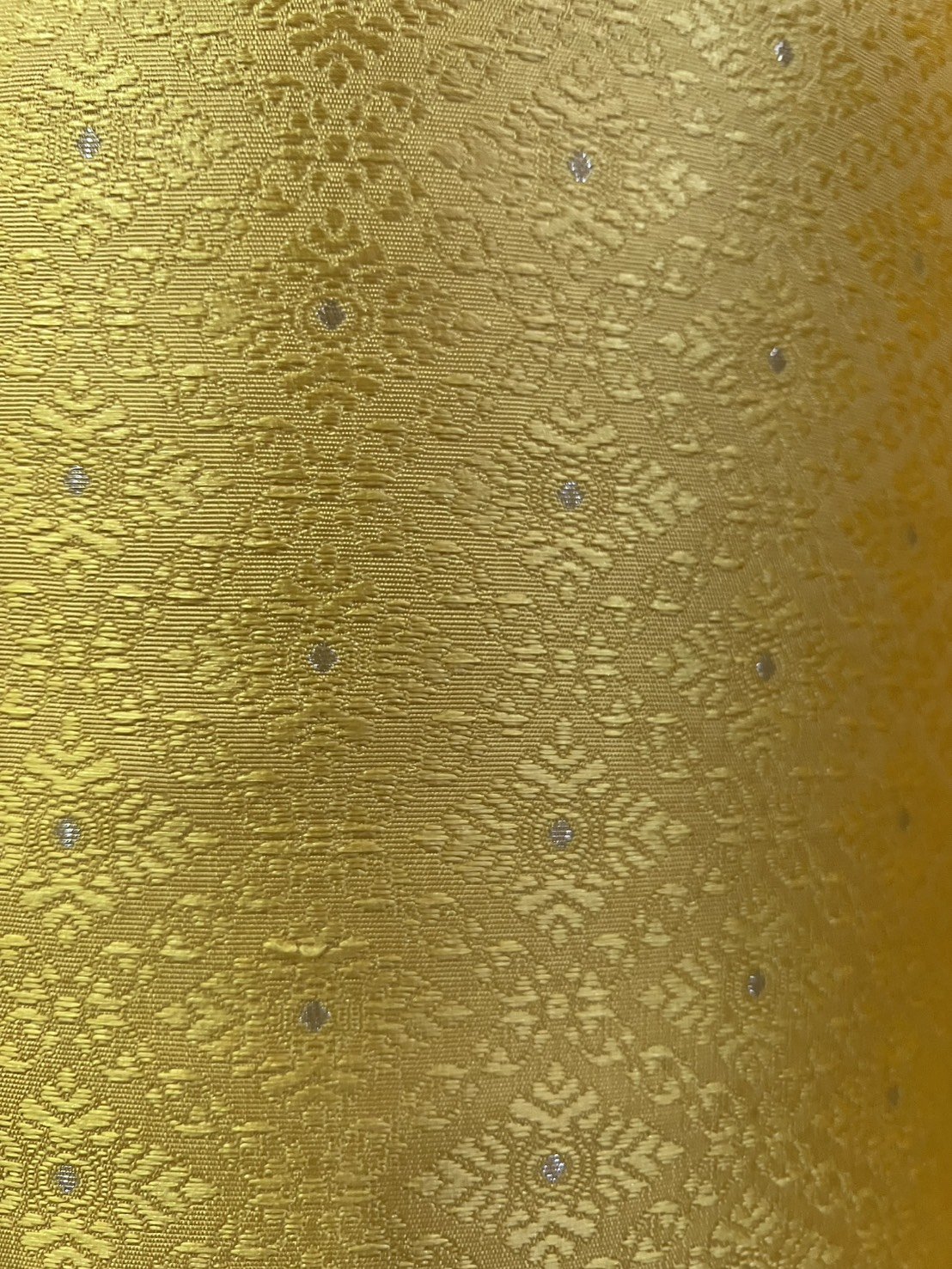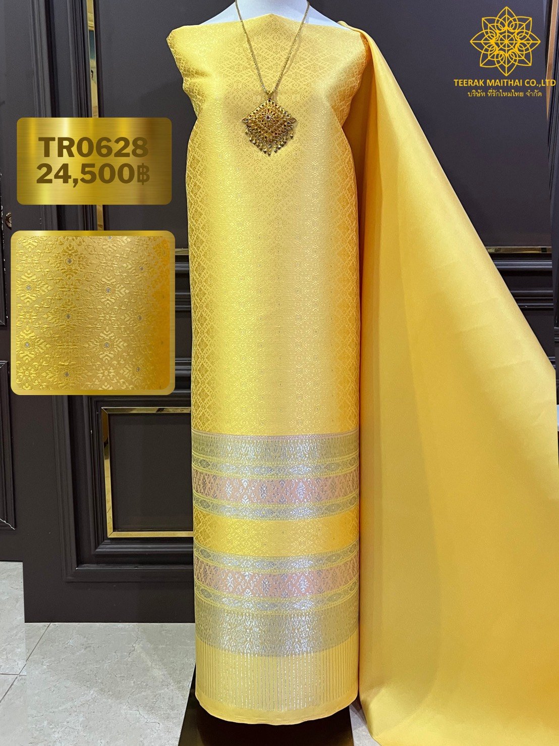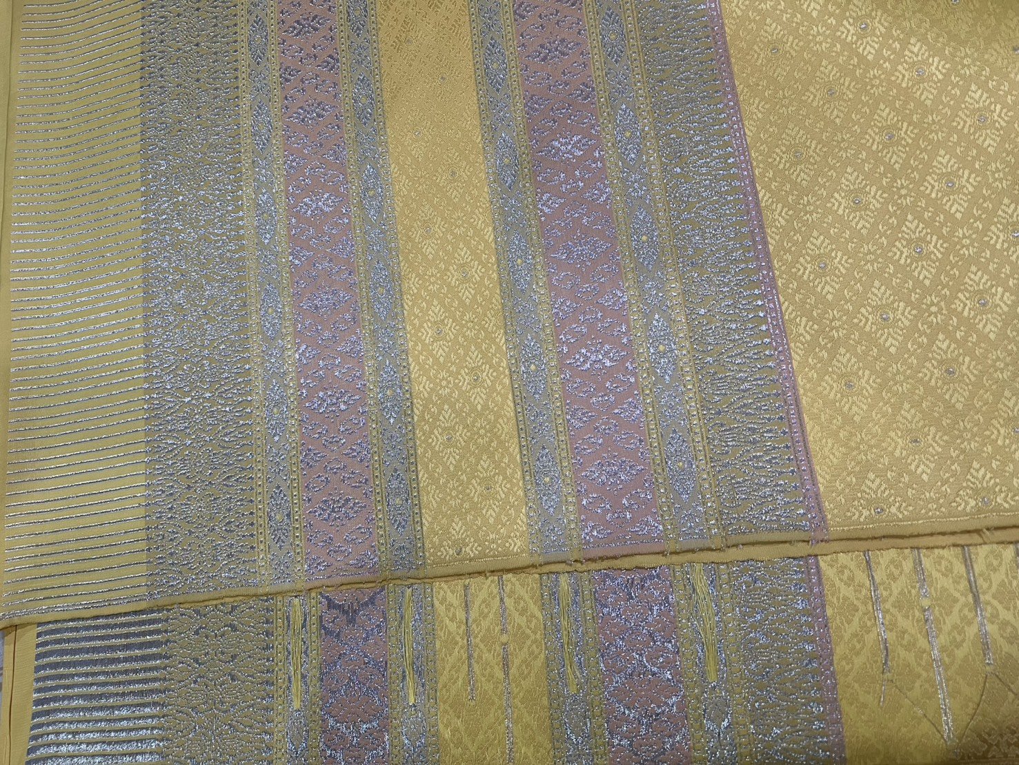 ลายพิกุลขอบเพชร ยกใหญ่ลำพูนสีเหลืองสดเชิงดิ้นทองสอดเกษรดิ้นทอง