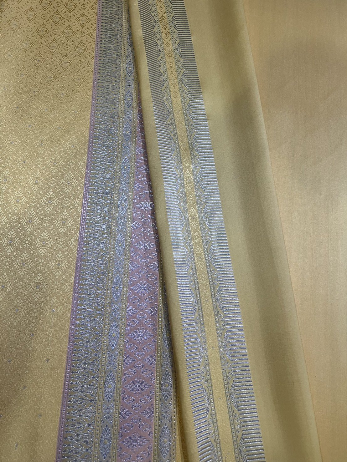 ลายราชสำนัก ผ้าไหมยกดอกลำพูนสีขาวงาช้างเกาะเชิงดิ้นทอง